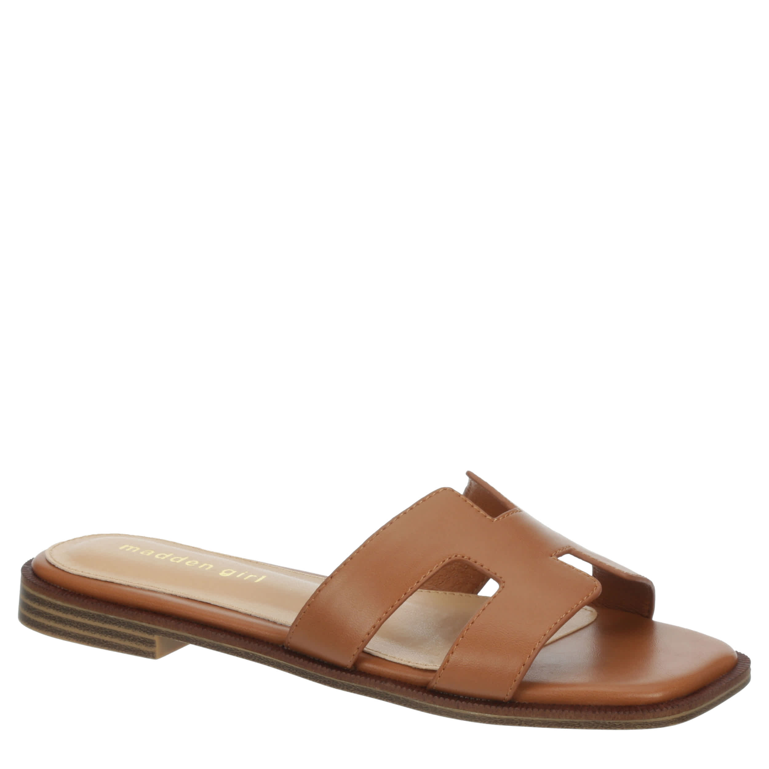 Smooth out your spring style in the Hailey women's flat sandal from madden girl. Featuring a faux leather upper with cutouts and a square toe for extra style, this slip-on shoe works with cropped jeans or midi skirts. The insole comforts your foot while the flat outsole offers durability.