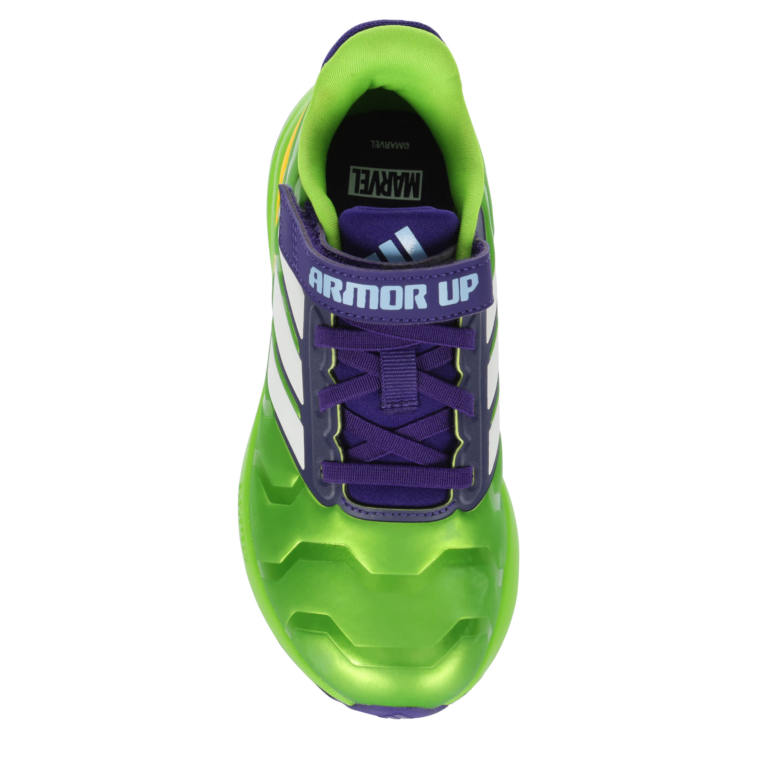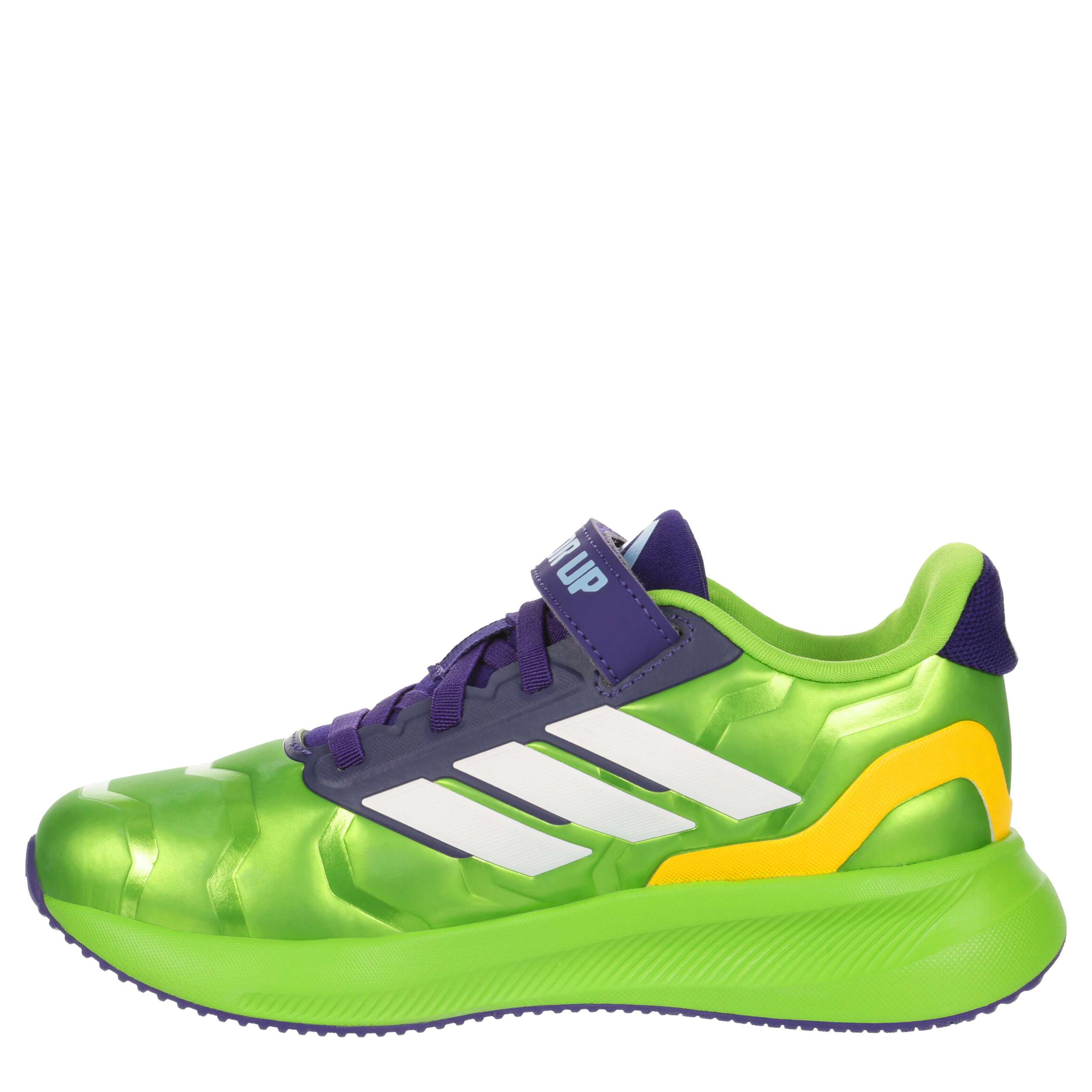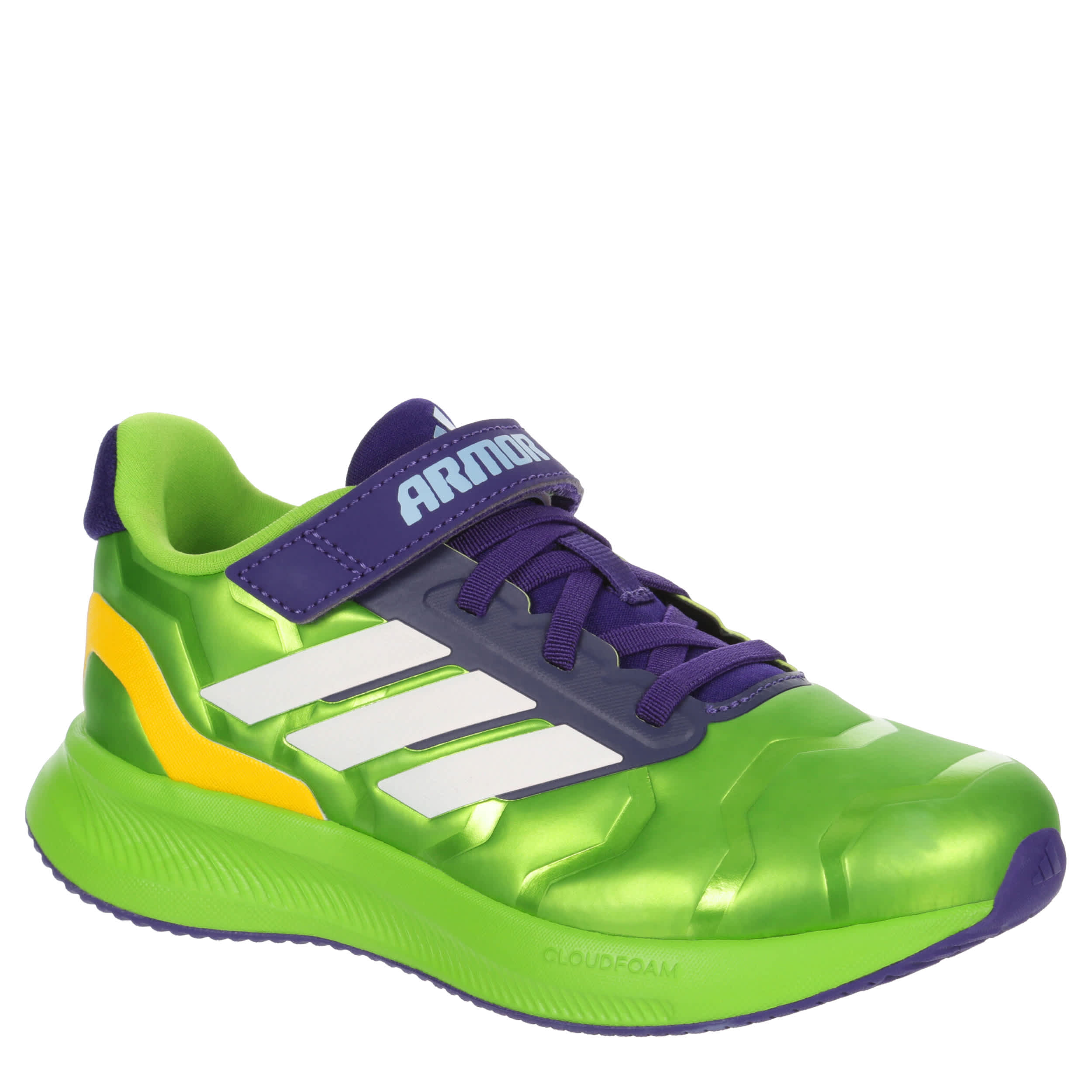Let him run free in these adidas Runfalcon 5 sneakers. With a Hulk-inspired synthetic upper and cushy OrthoLite® sockliner, these smashing shoes are secure with a hook-and-loop instep strap. The Cloudfoam midsole and durable outsole provide plenty of support while comforting every move.