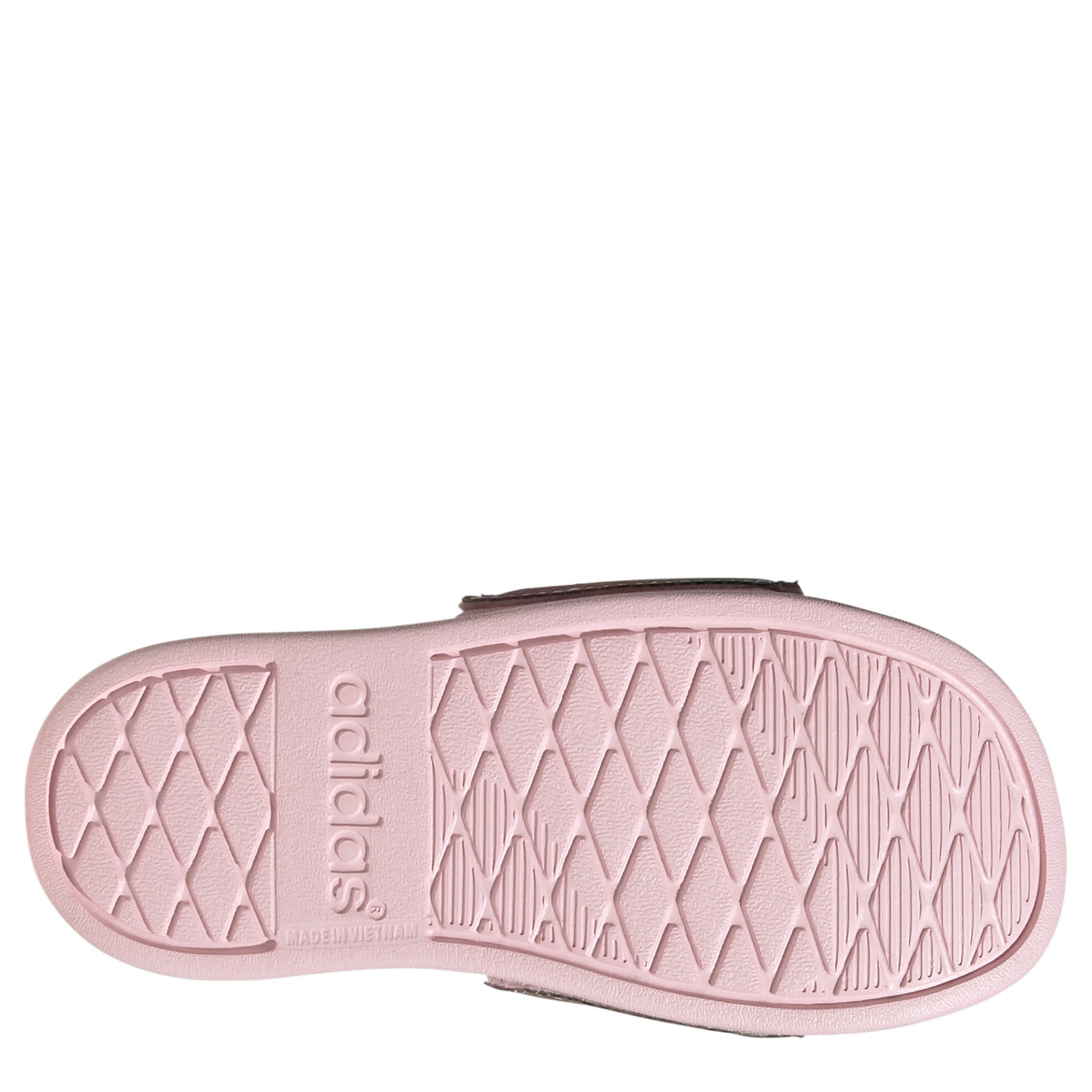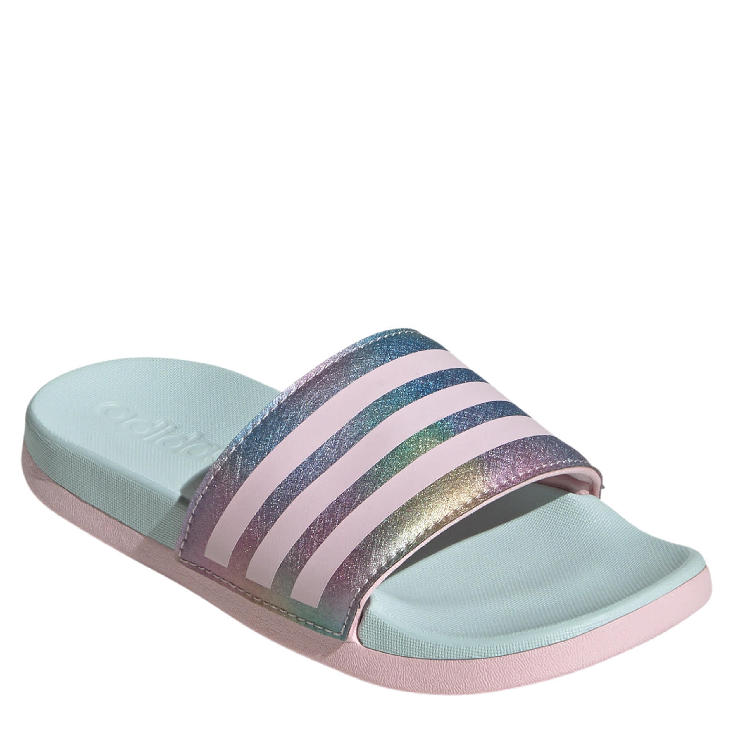 Summer shine is a real thing in the Adilette Comfort girls' sandal by adidas. With a iridescent upper featuring a smooth bandage design, this sandal also has the signature 3-Stripes for a dose of classic style. The footbed cradles her foot while providing some traction around the house or by the pool.