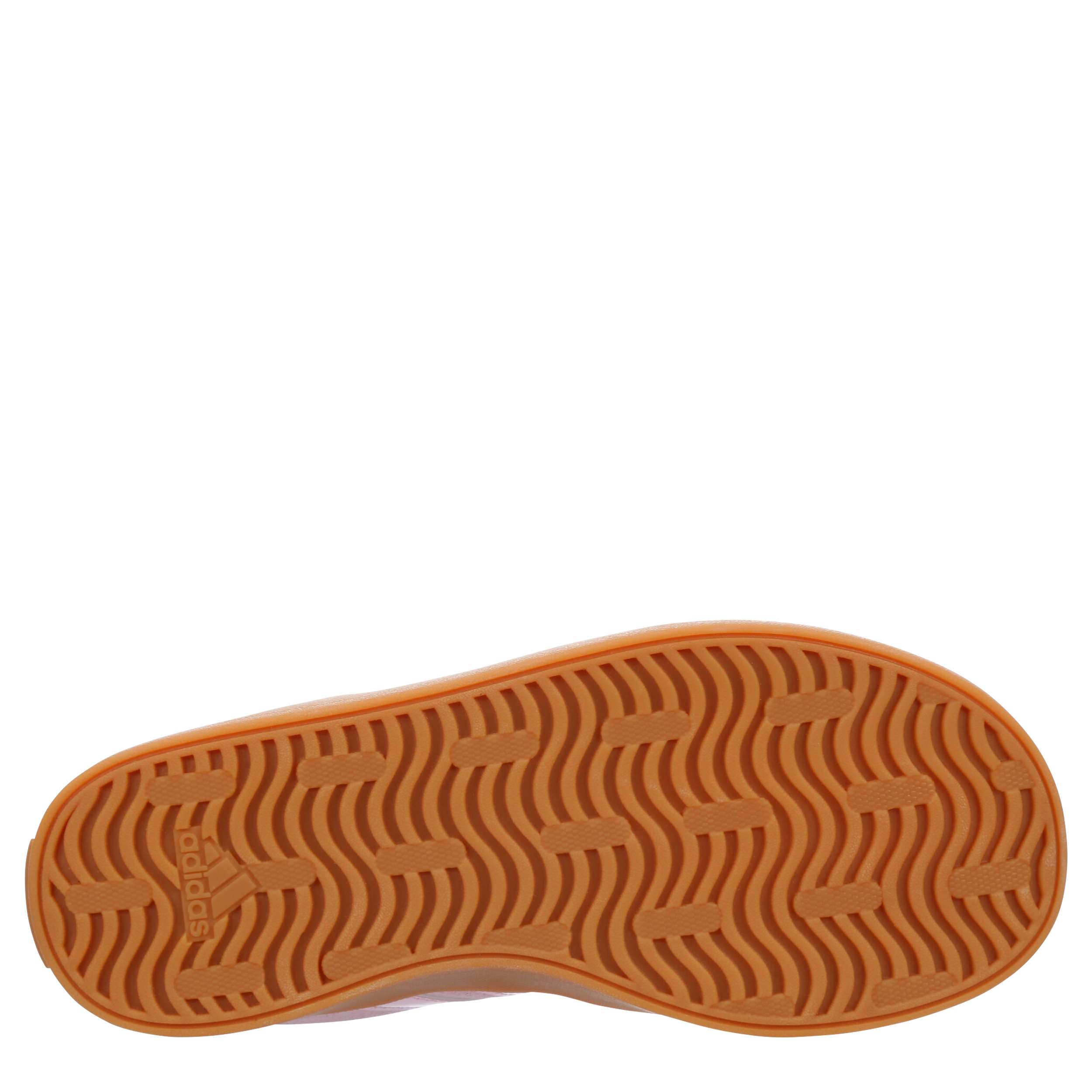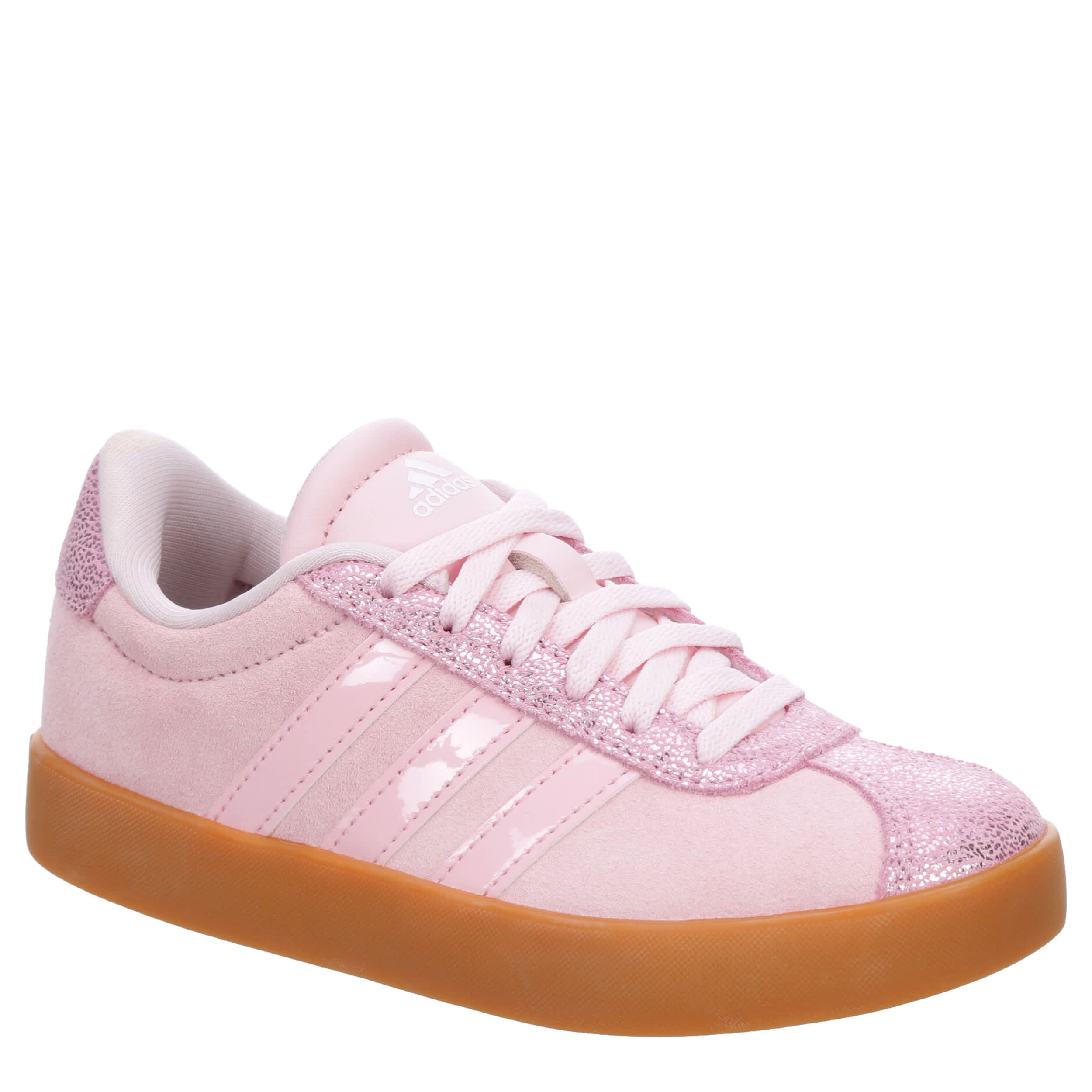Kick up her style in the VL Court 3.0 girls' sneaker. With a glittery faux leather upper featuring a padded collar & tongue for comfort, this lace-up shoe has contrasting 3-Stripes for that classic adidas look. The OrthoLite® sockliner cushions the bumps while the cupsole supports every step with bouncy traction.