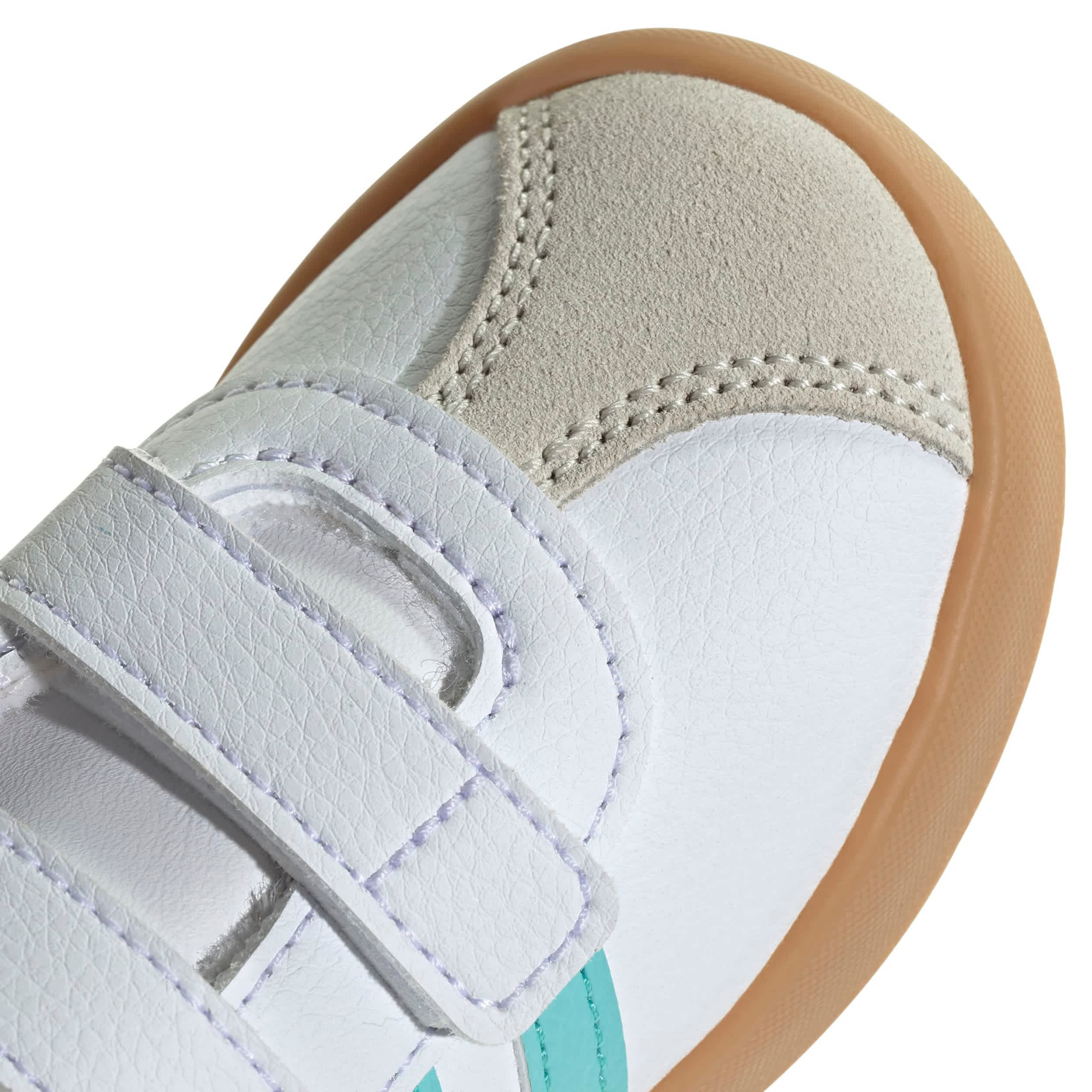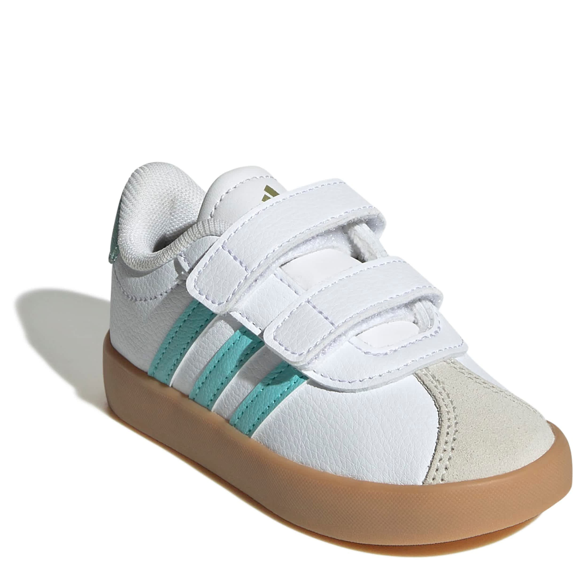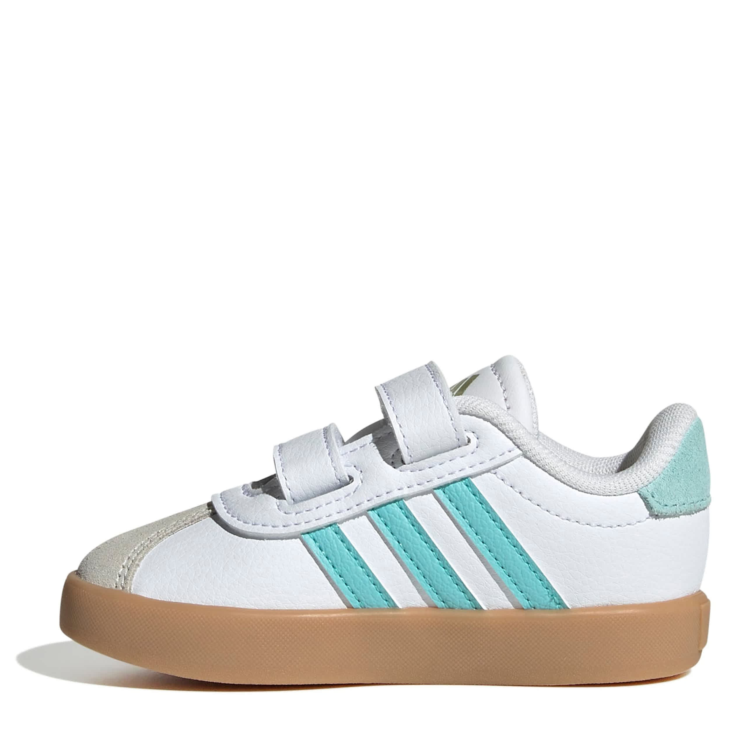 Kick up her style in the VL Court 3.0 infant girls' sneaker. With a faux leather & suede upper featuring a padded collar & tongue for extra comfort, this hook & loop shoe has contrasting 3-Stripes for that classic adidas look. The OrthoLite® sockliner cushions the bumps while the gum cupsole supports every step with bouncy traction.