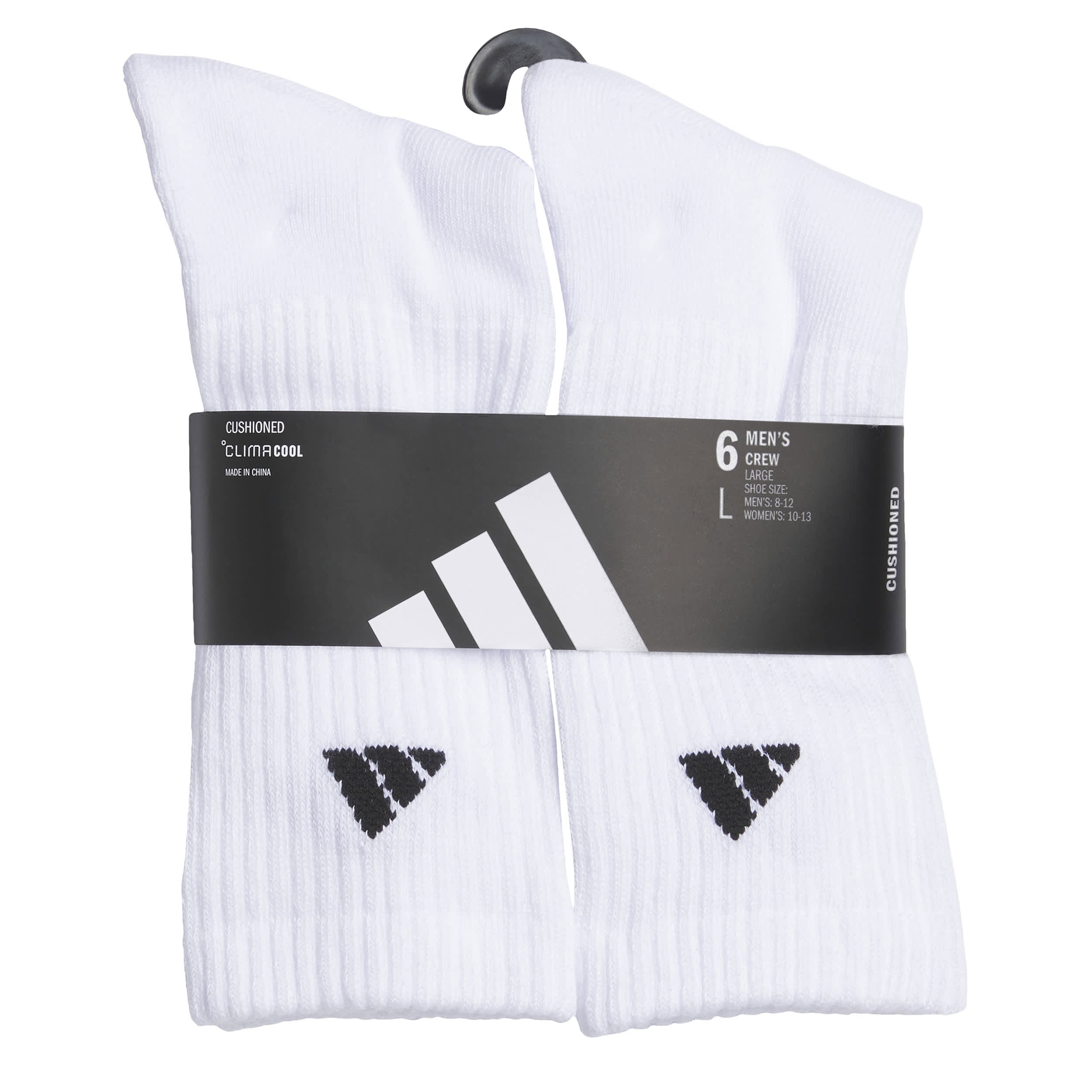 Get in the game with the adidas Large Classic Cushioned Crew mens's socks 6 Pack. Created with moisture-wicking fiber to keep feet dry, this sock is cushioned to handle the gym, work or your favorite pick-up sport. And the ribbed cuff helps them stay put while you're moving.