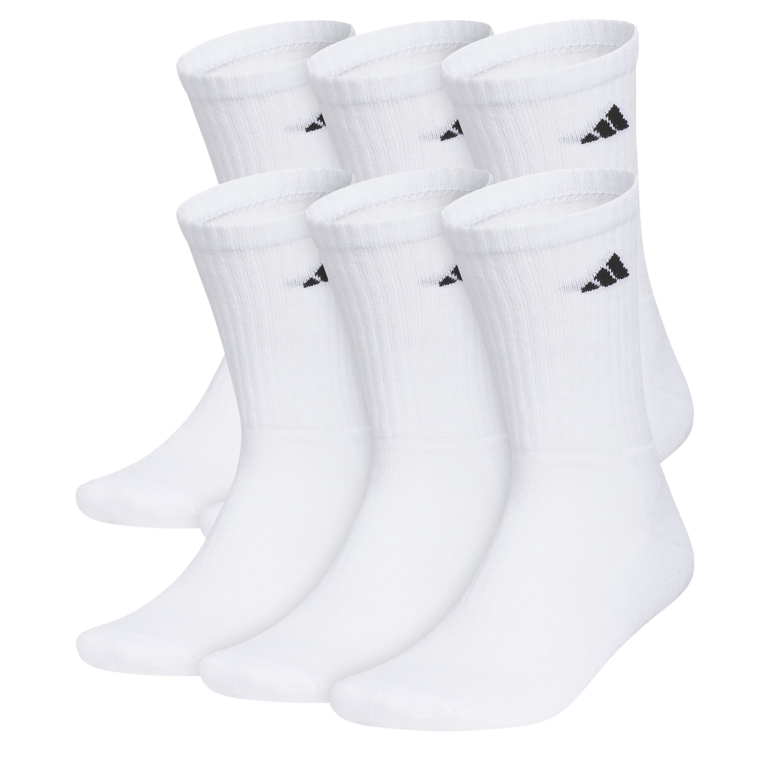 Get in the game with the adidas Medium Classic Cushioned Crew mens's socks 6 Pack. Created with moisture-wicking fiber to keep feet dry, this sock is cushioned to handle the gym, work or your favorite pick-up sport. And the ribbed cuff helps them stay put while you're moving.