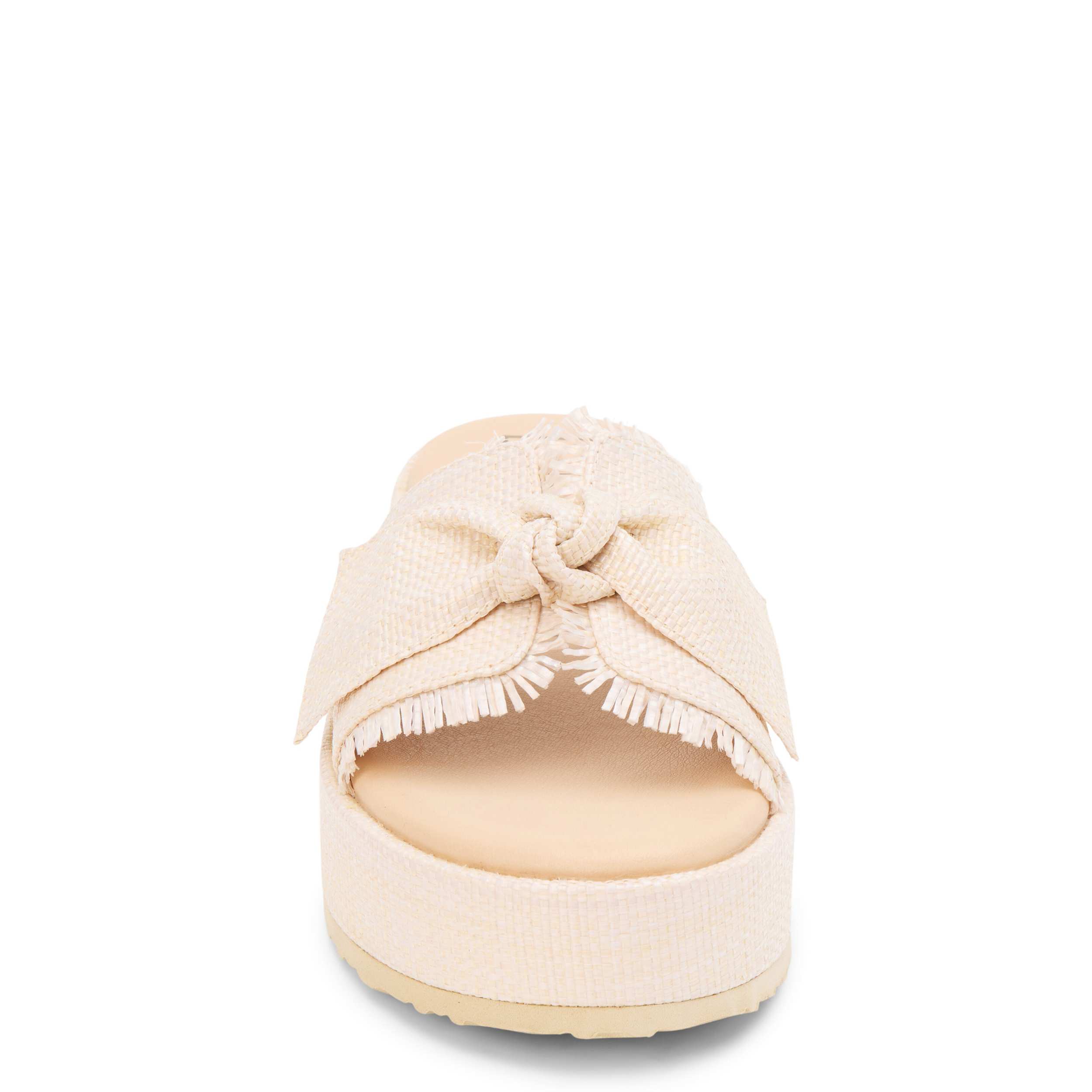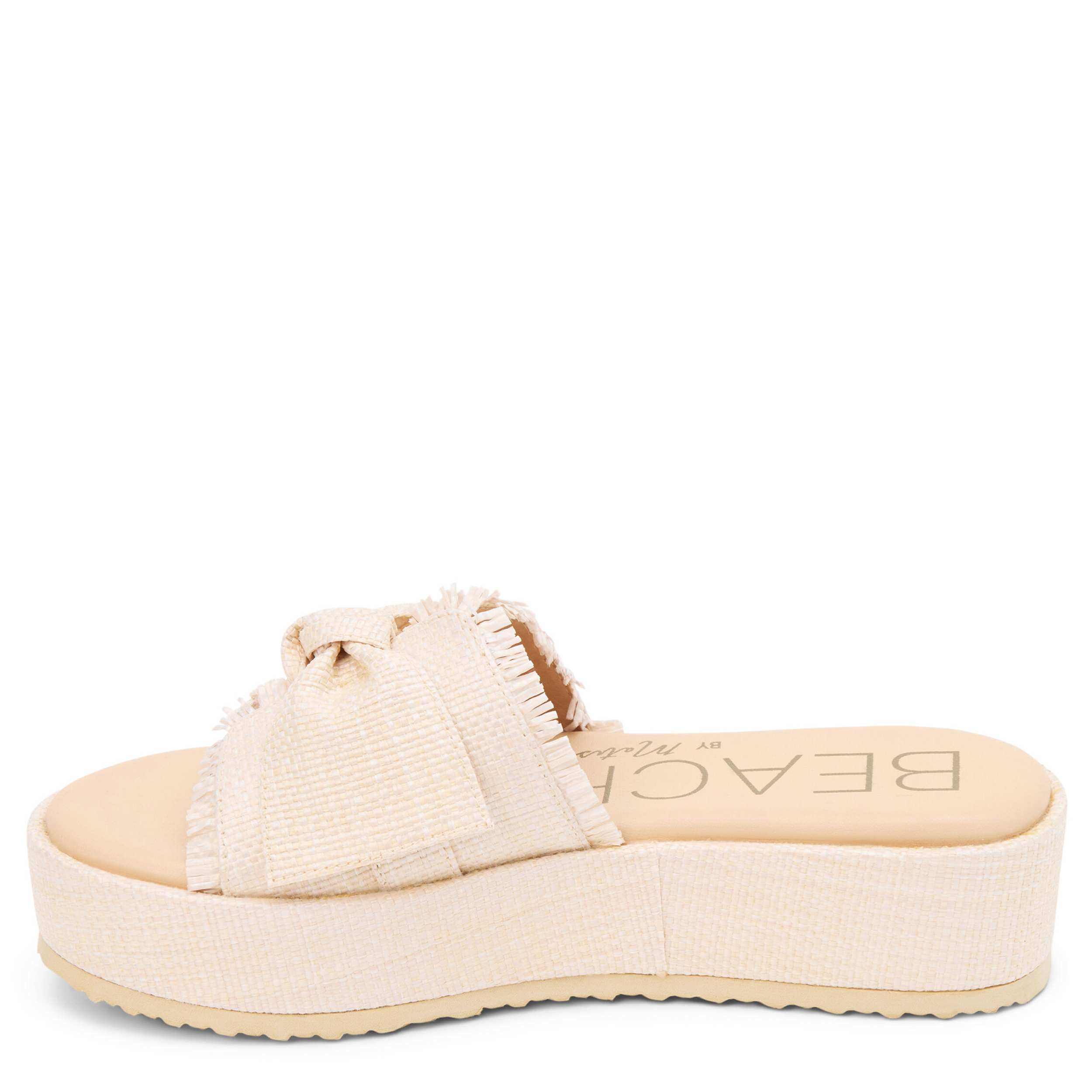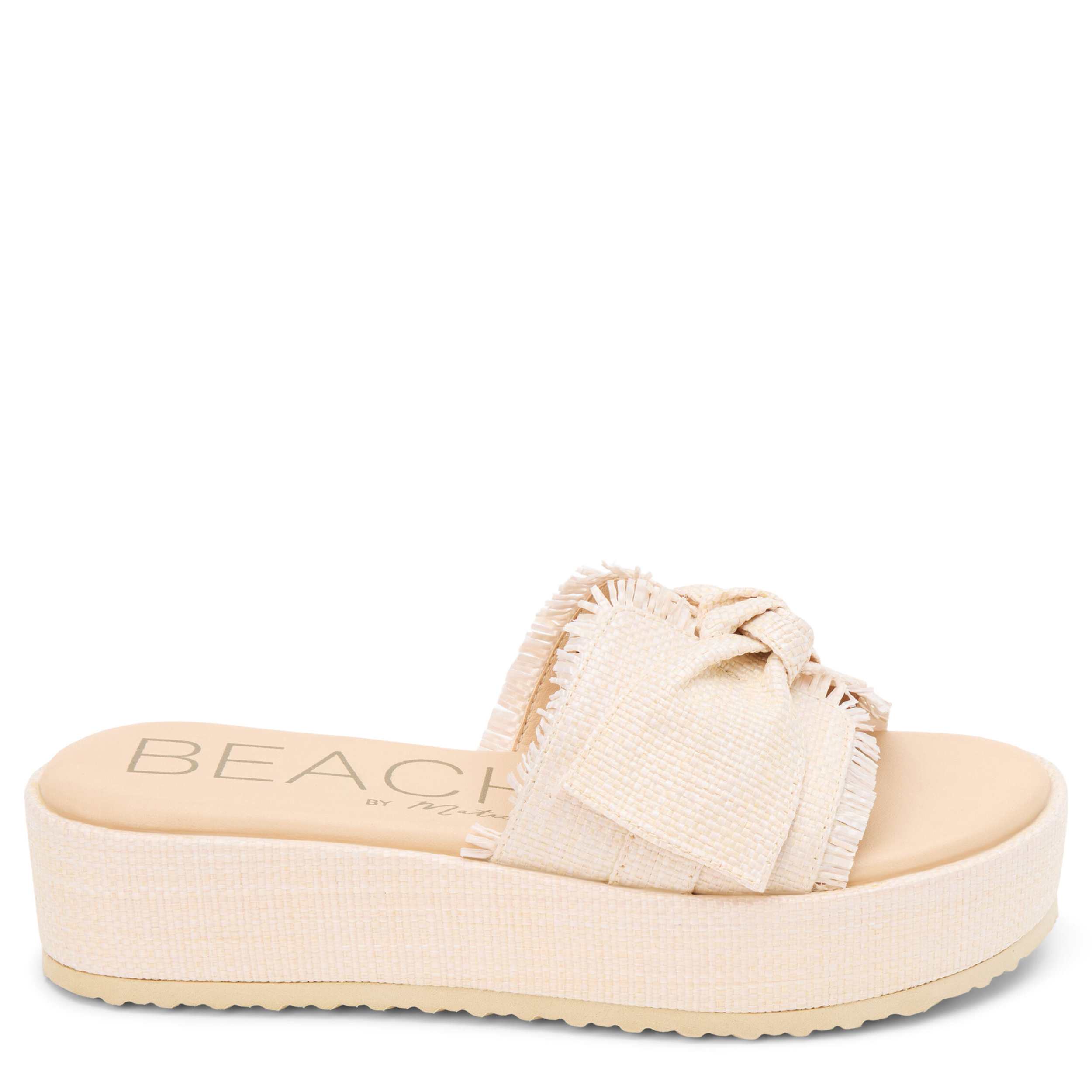 Say hello to sunshine in the Sundra platform slide from Beach by Matisse. Featuring a raffia upper with frayed accents and a knotted detail, this shoe is perfect for vacation. The cushioned footbed offers all-day comfort, while the platform sole offers the perfect lift.