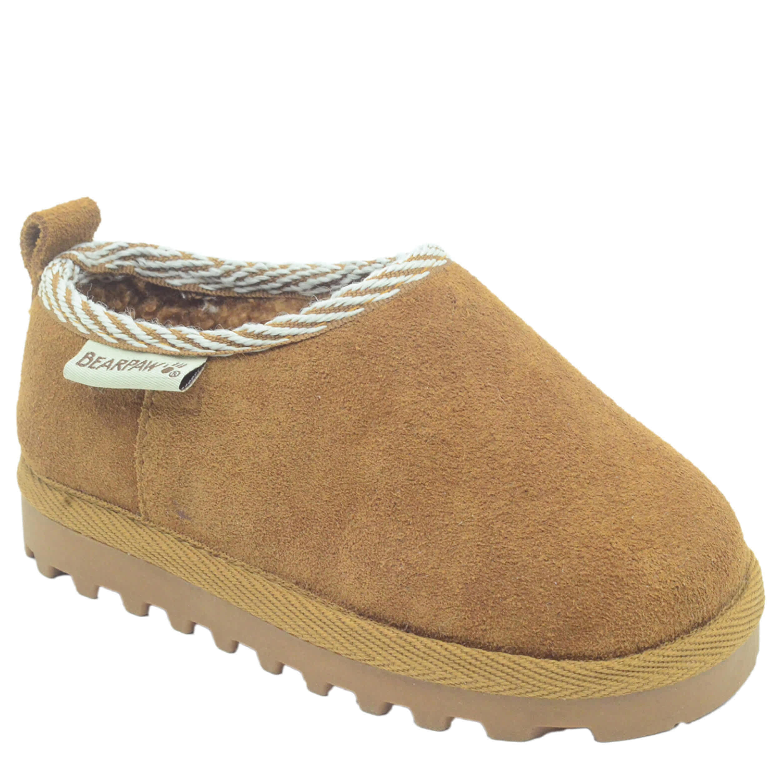 Let her lounge blissfully in this Tabitha infant girls' slipper from Bearpaw. With a suede upper featuring a knit trim collar for extra style, this slipper cradles her little foot. The faux fur lining is comfortably warm, while the EVA outsole keeps her supported enough to take it easy on those lazy Sundays.