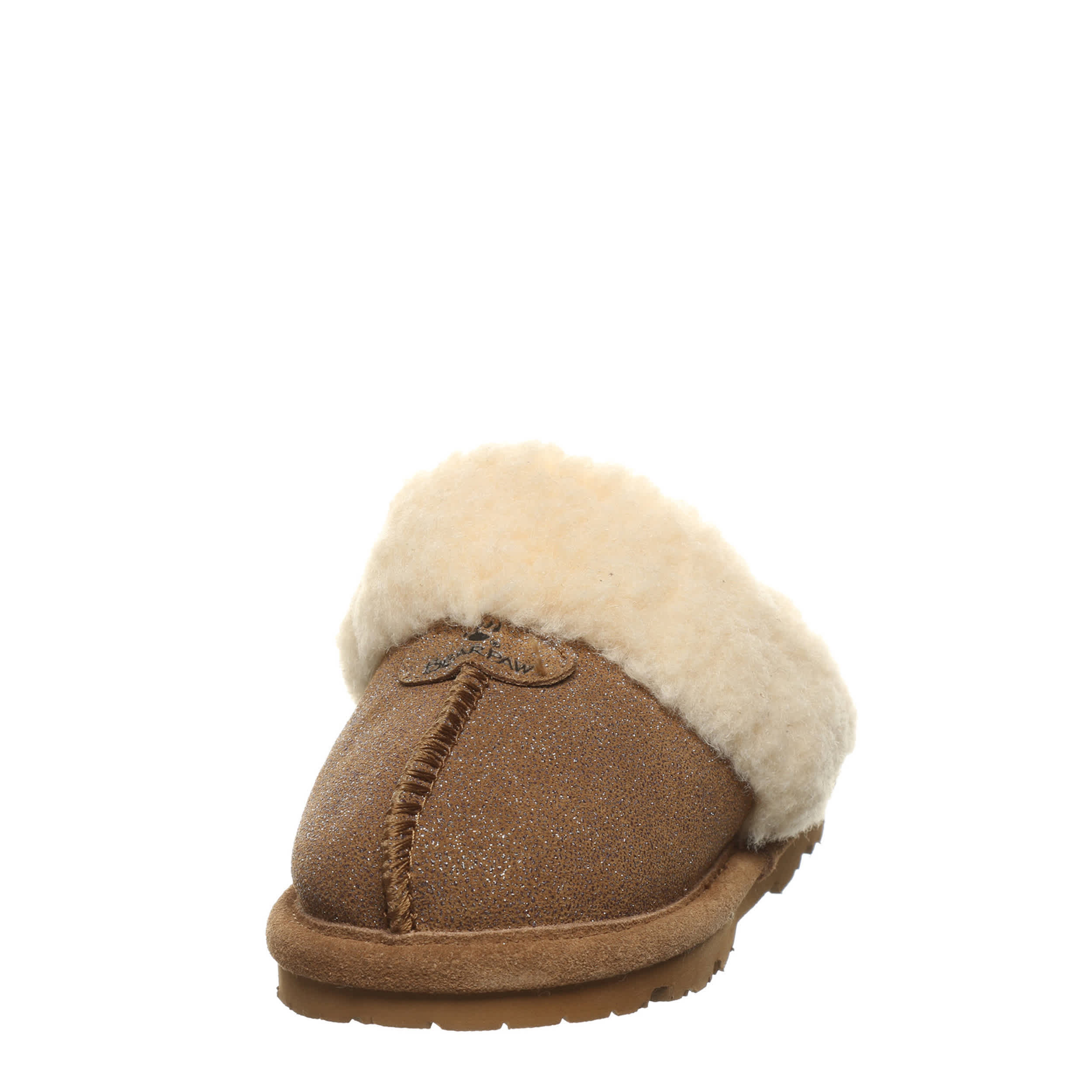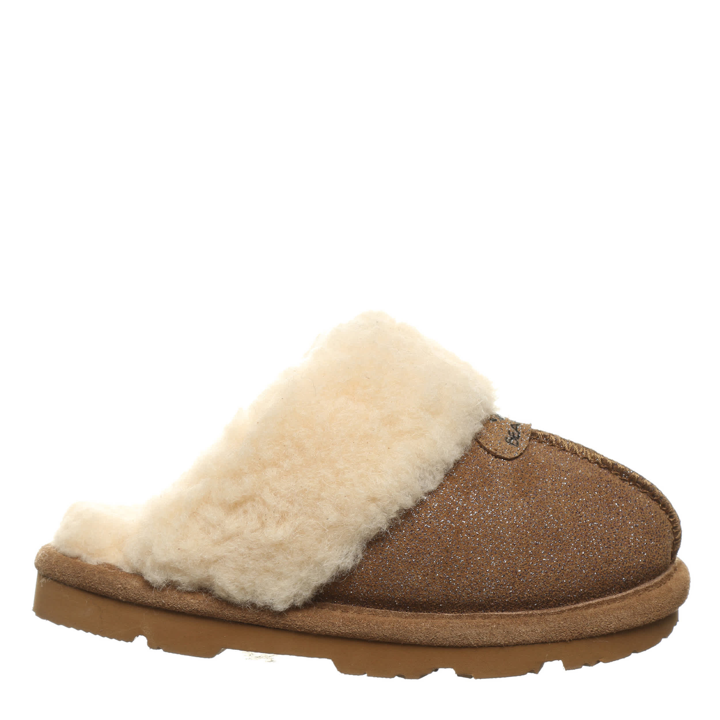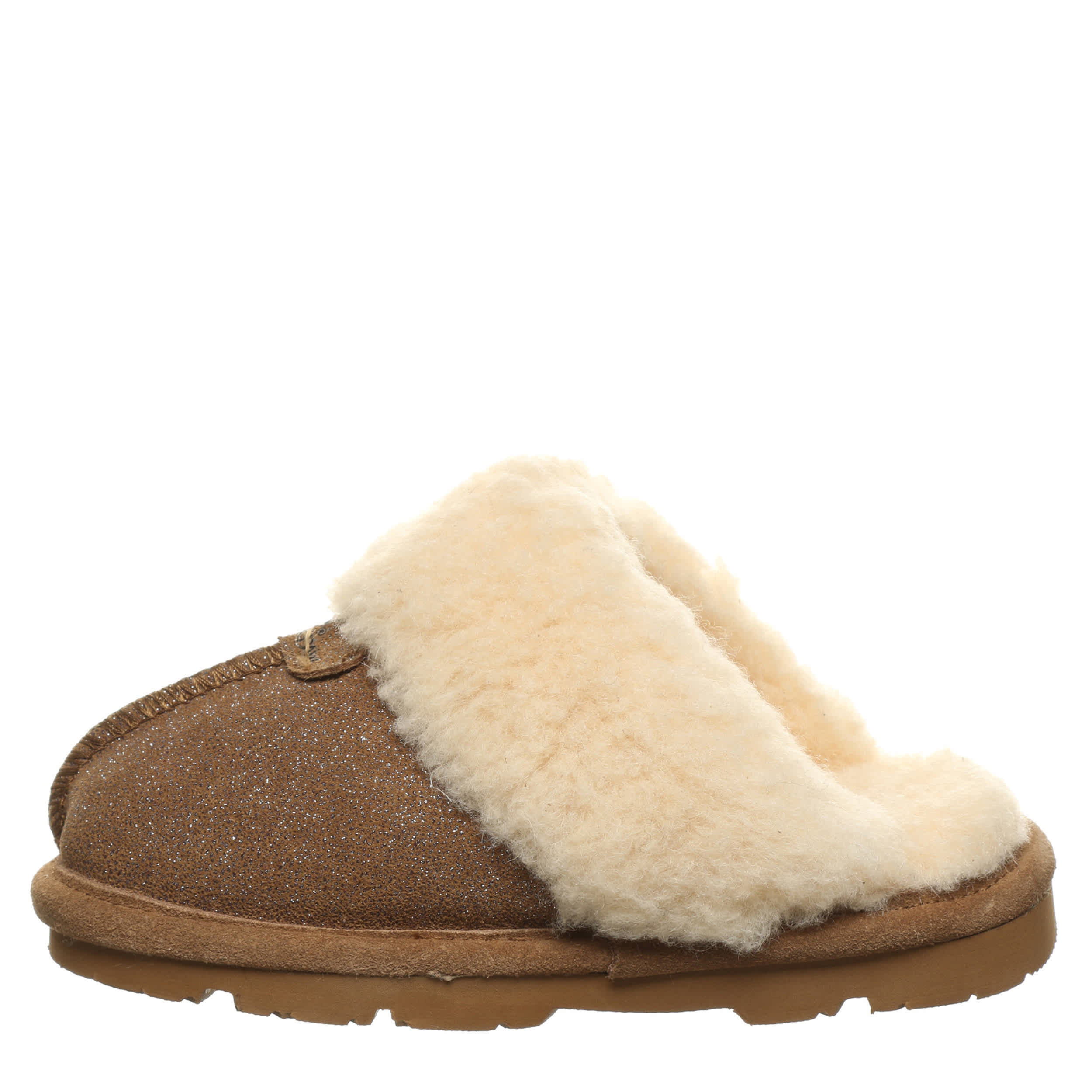 Help her stay warm on cold days in the cute Loki II girls' slipper from Bearpaw. Featuring a suede upper with a sheepskin collar & lining that keeps her foot cozy. The lightweight, molded EVA outsole cushions her foot and offers traction, so she's always comfortable.
