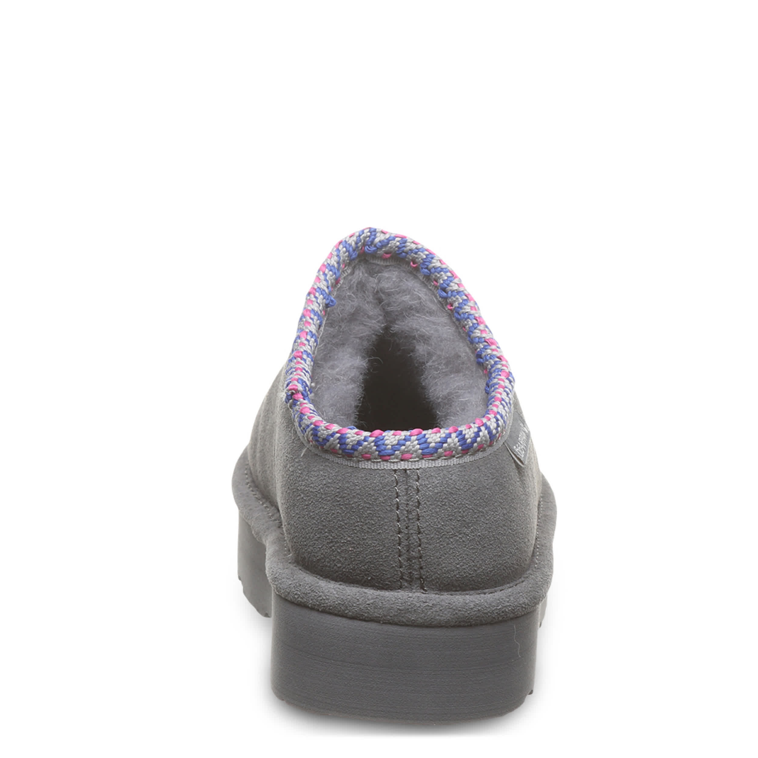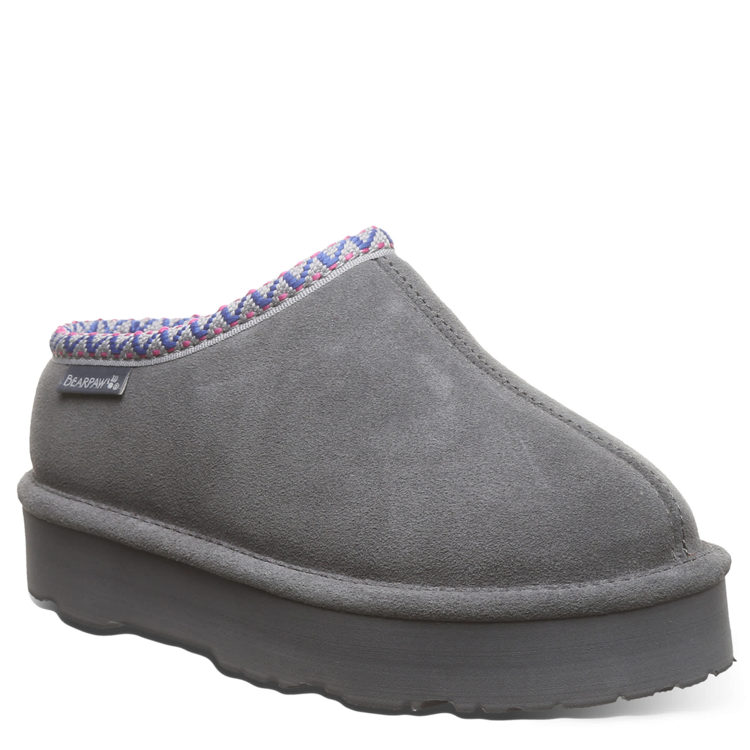 Wherever she needs to go, the Martis Youth platform slipper from Bearpaw won't disappoint. With a suede upper treated with BearCoatâ„¢ Rain and Stain Repellent featuring a warm wool blend lining, this slipper cradles her foot. The removable wool blend footbed comforts, while platform rubber outsole adds height.