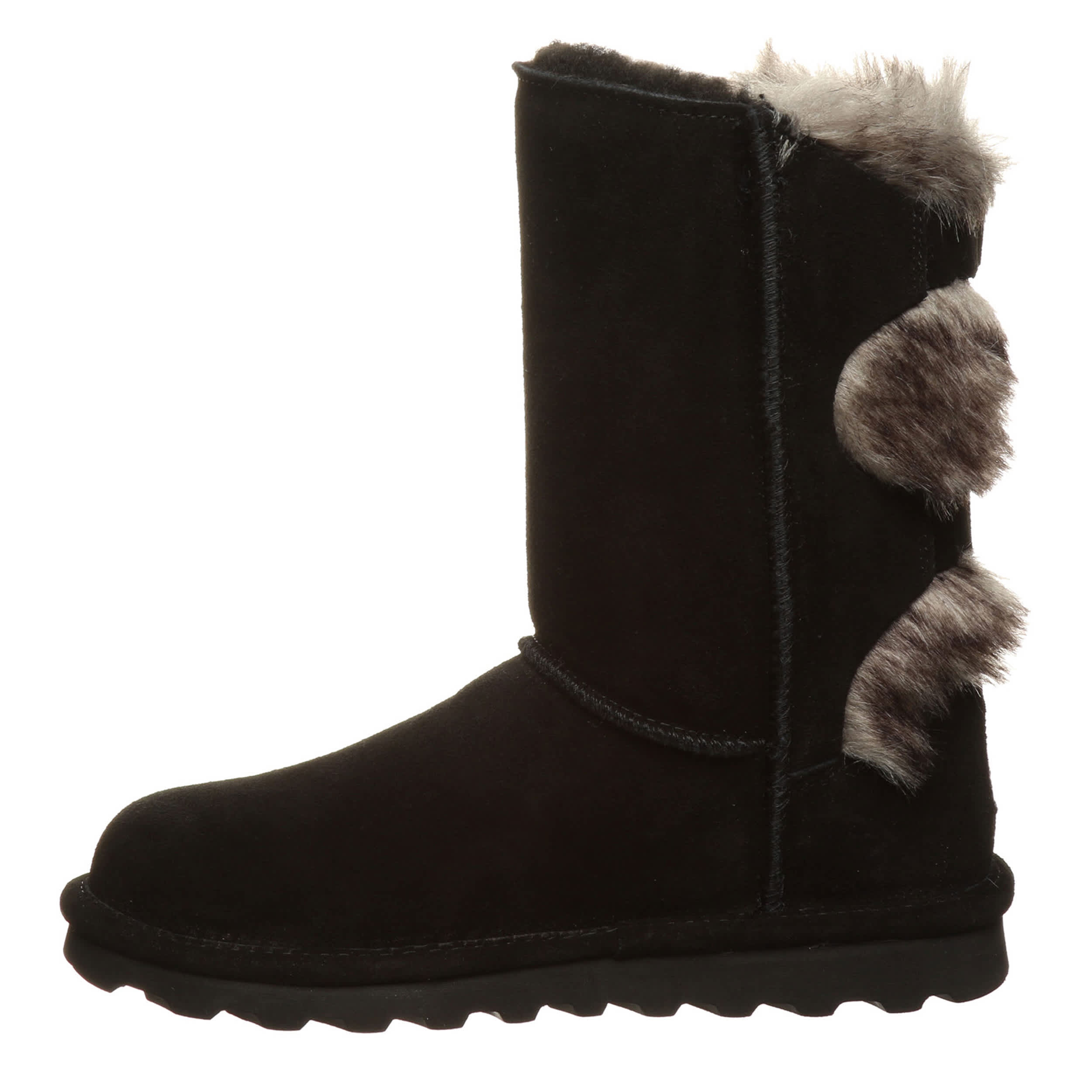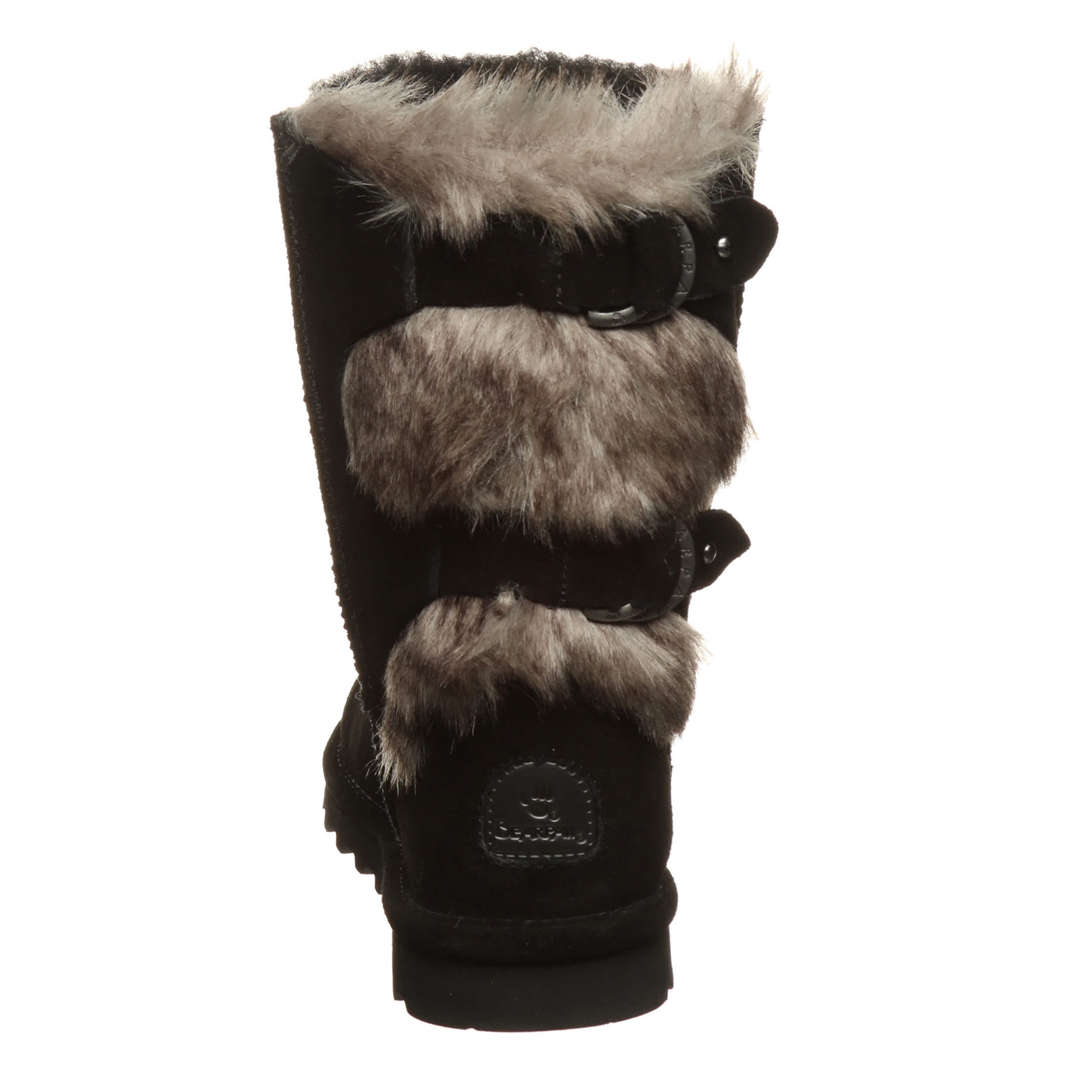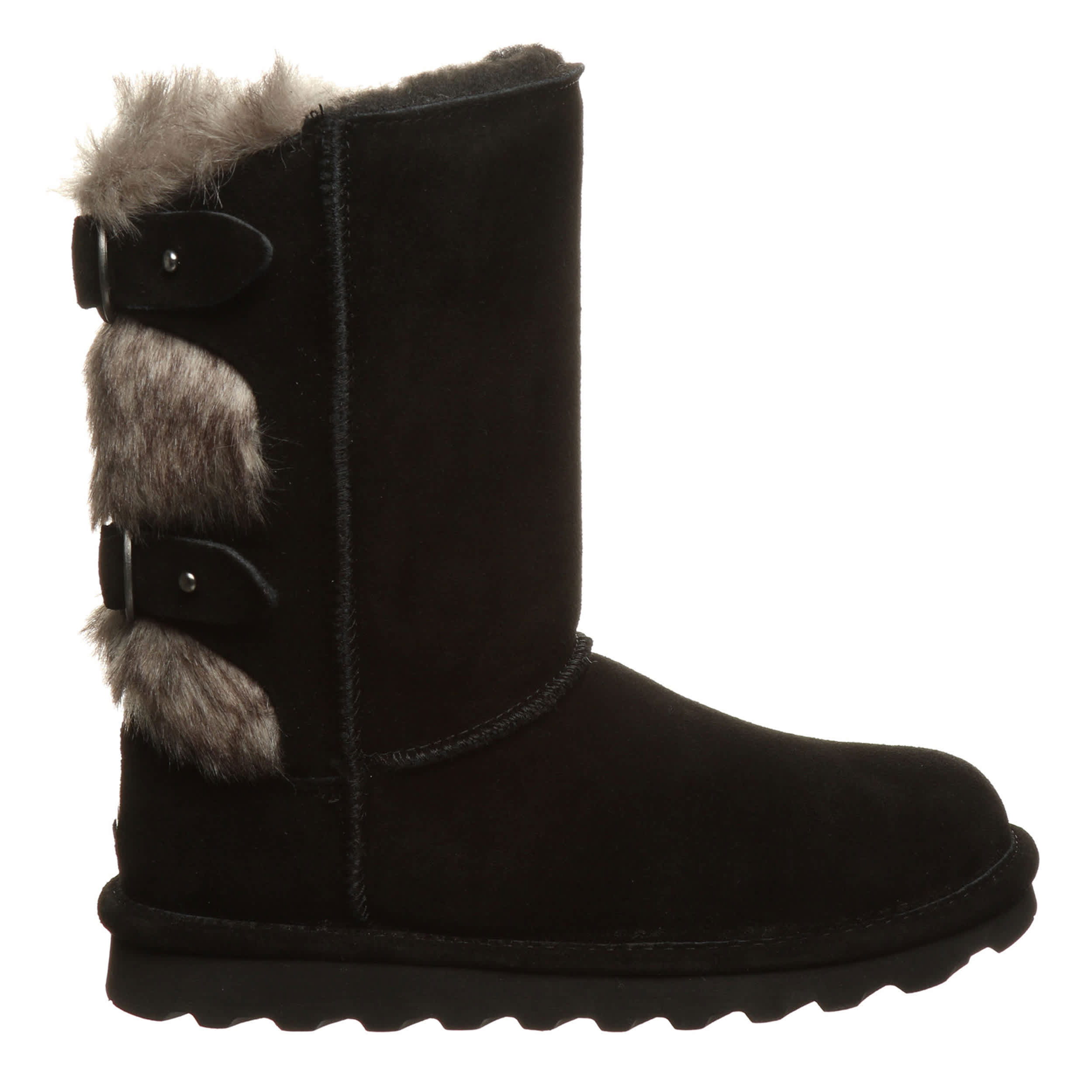 Buckle in for a cozy winter in the Bearpaw Eloise women's fur boot. With suede and faux fur upper accented by decorative buckles, these boots are sure to keep your feet warm and secure. Feel even better with the comfort shearling footbed and lightweight rubber sole.