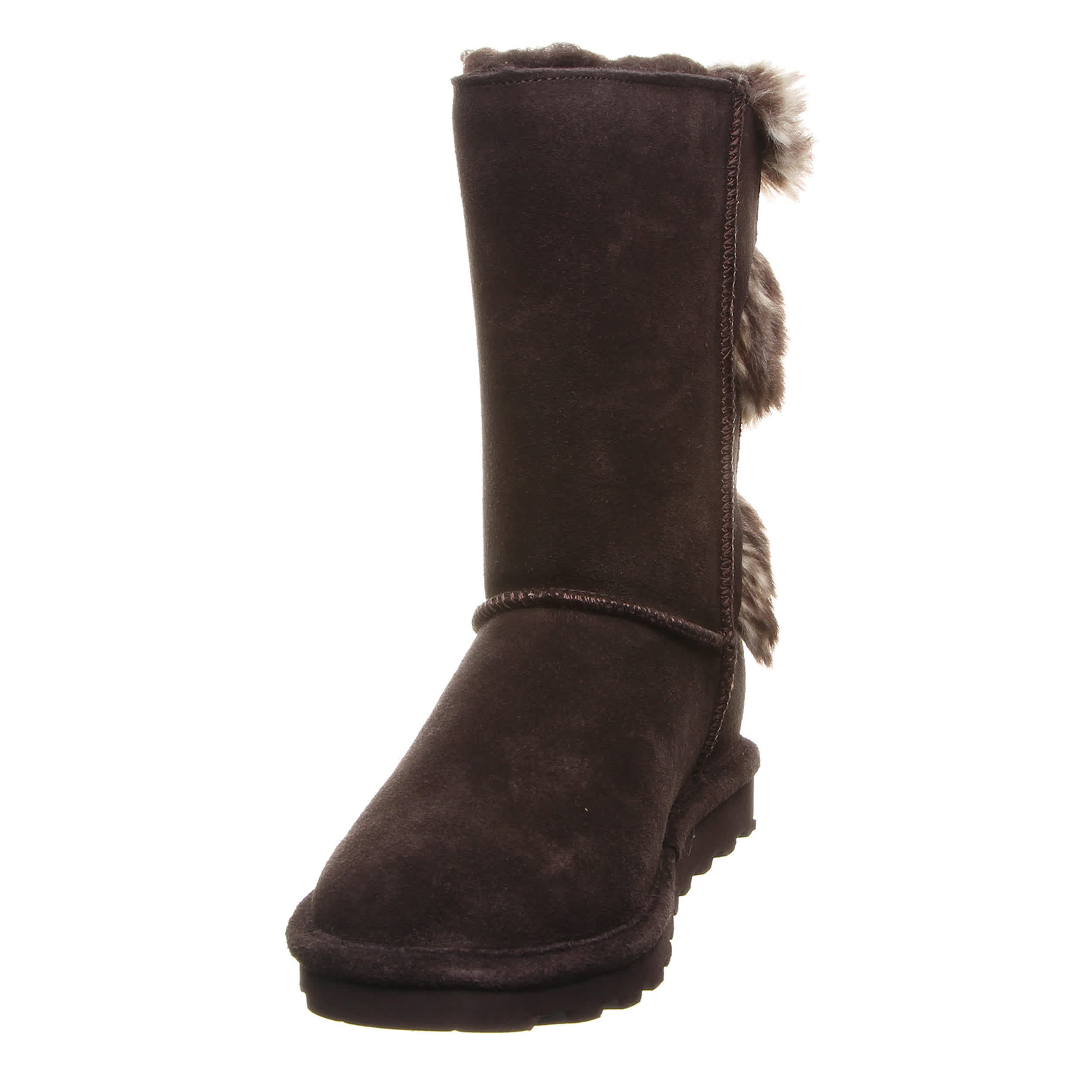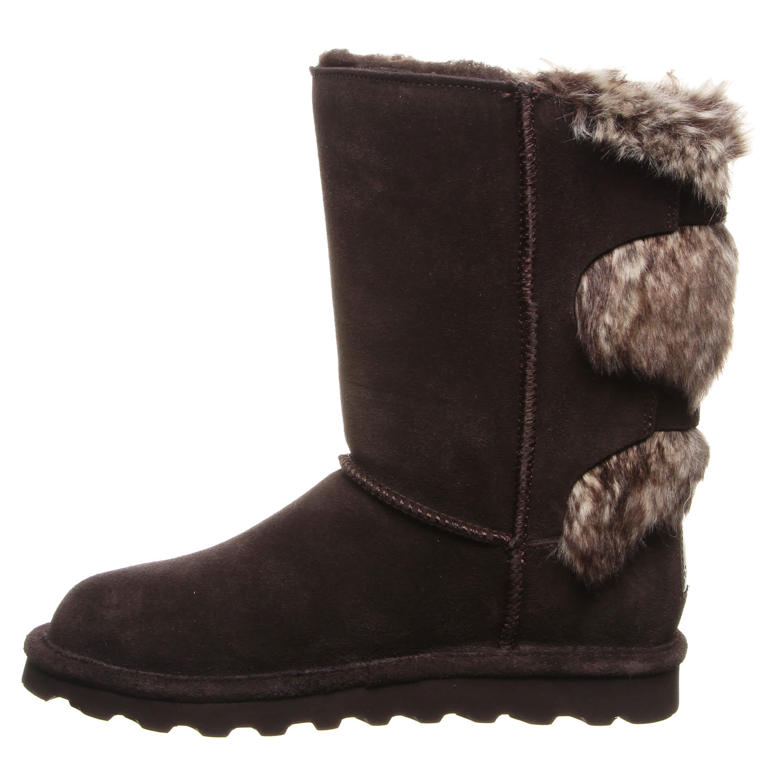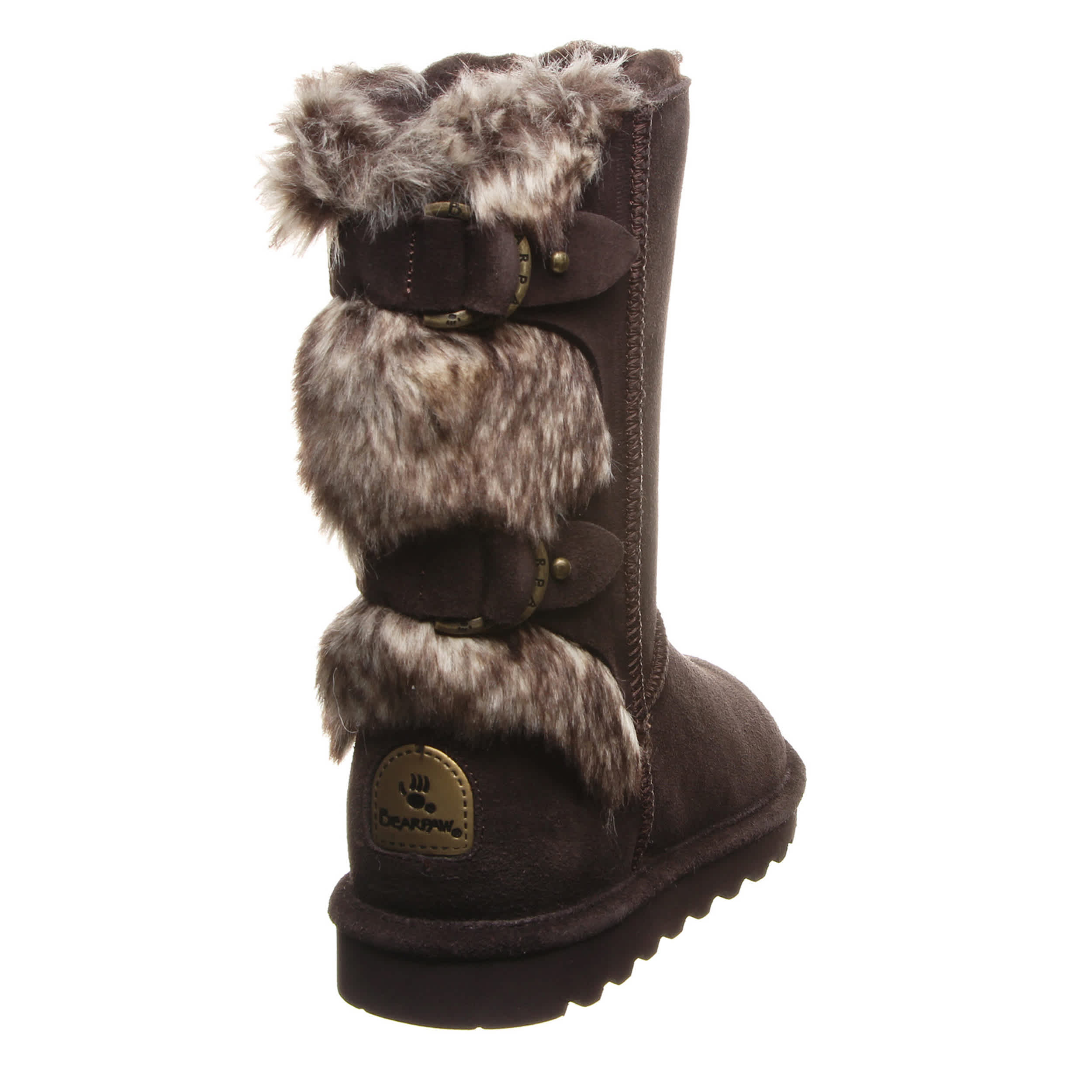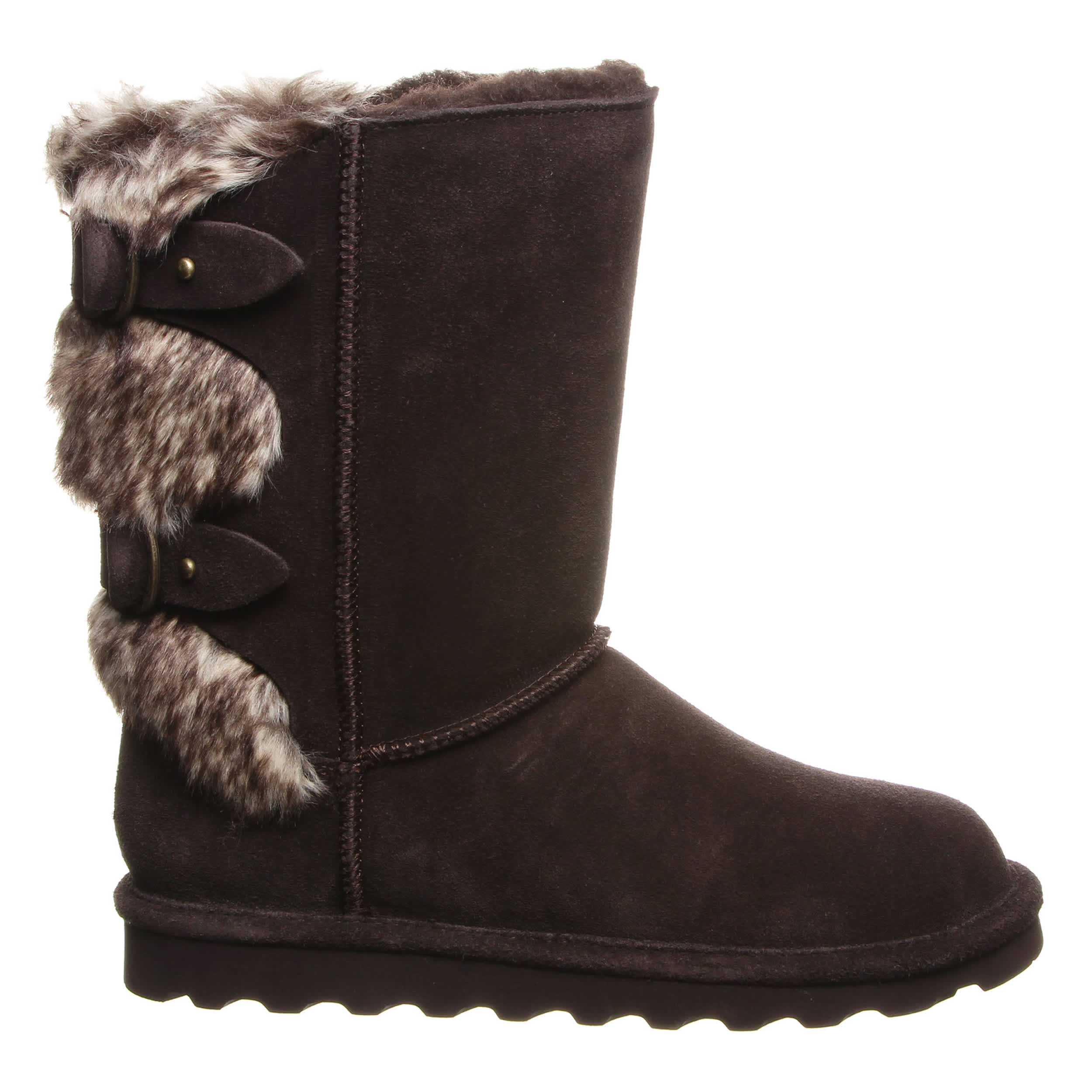 Buckle in for a cozy winter in the Bearpaw Eloise Wide Calf women's fur boot. With suede and faux fur upper accented by decorative buckles, these boots are sure to keep your feet warm and secure. Feel even better with the comfort shearling footbed and lightweight rubber sole.