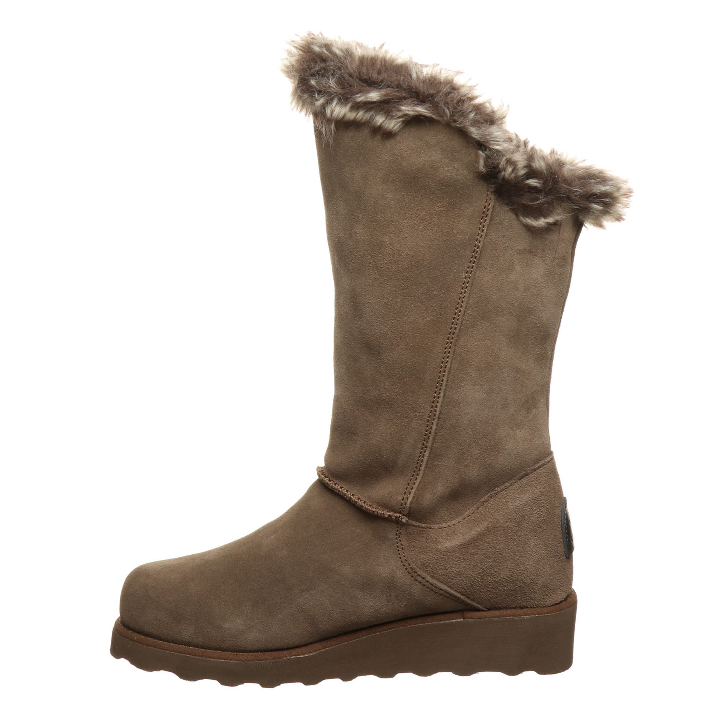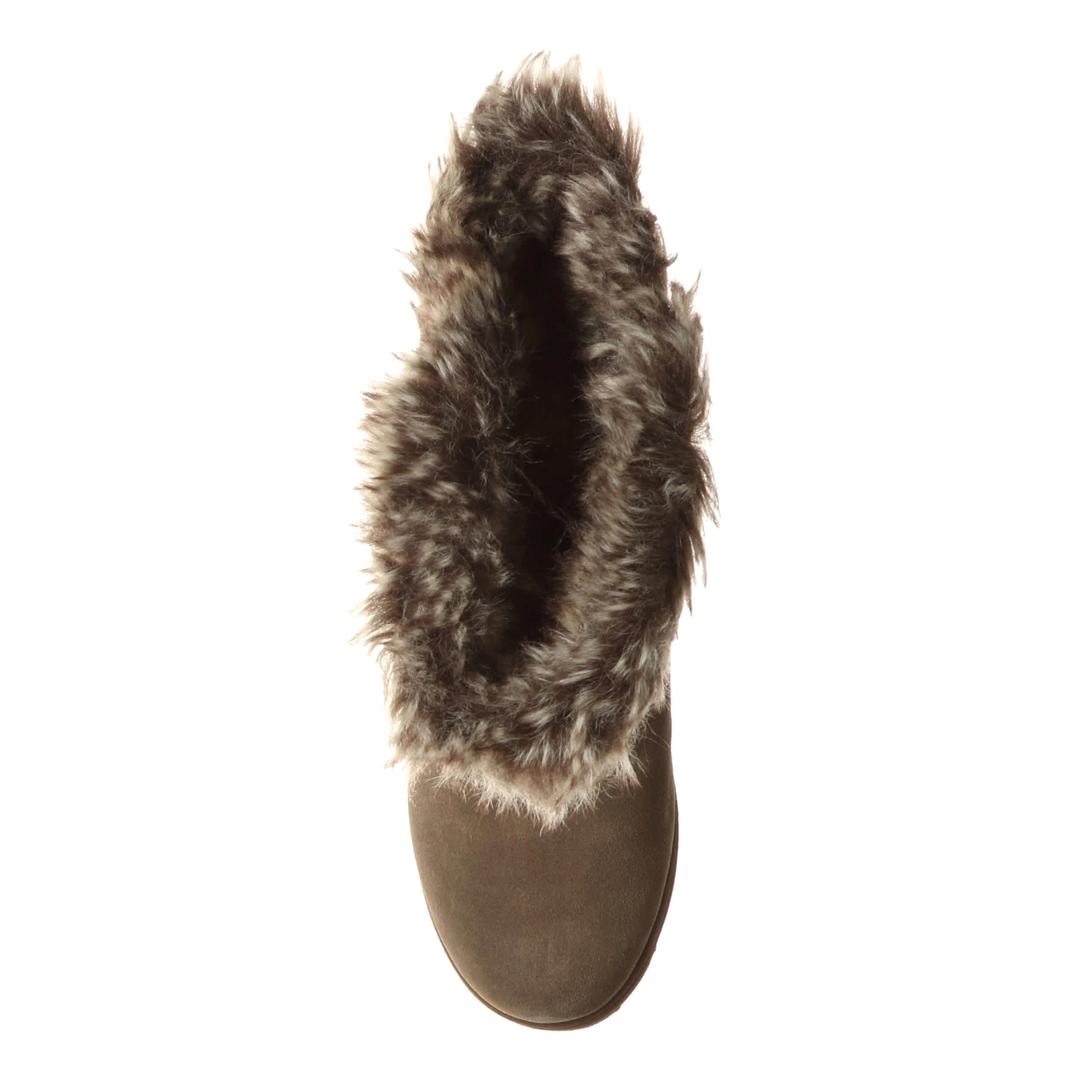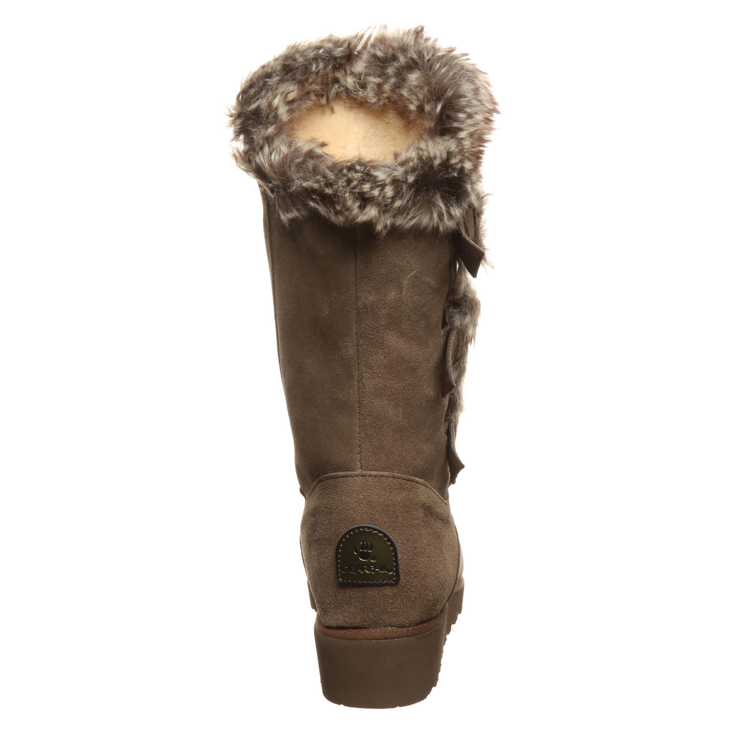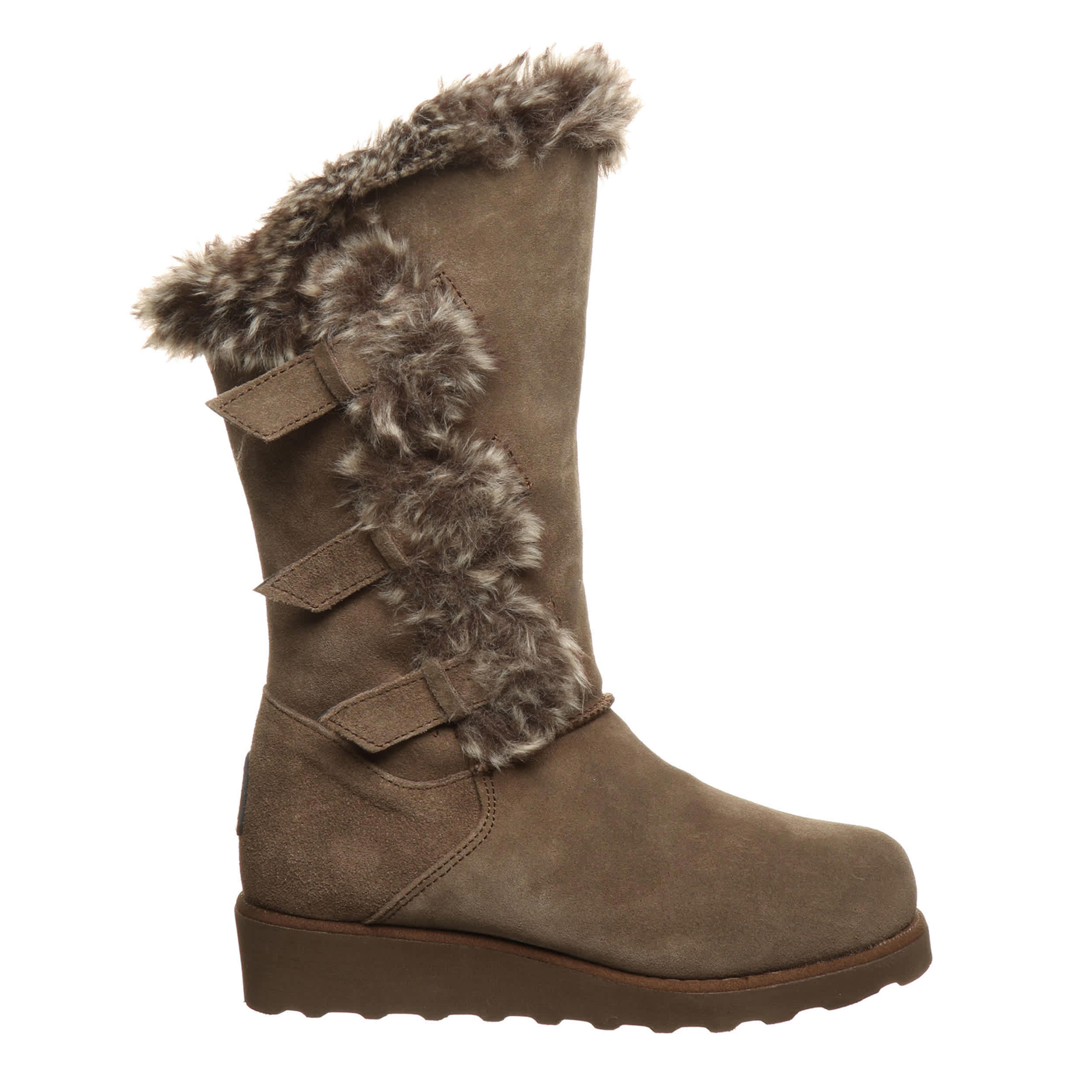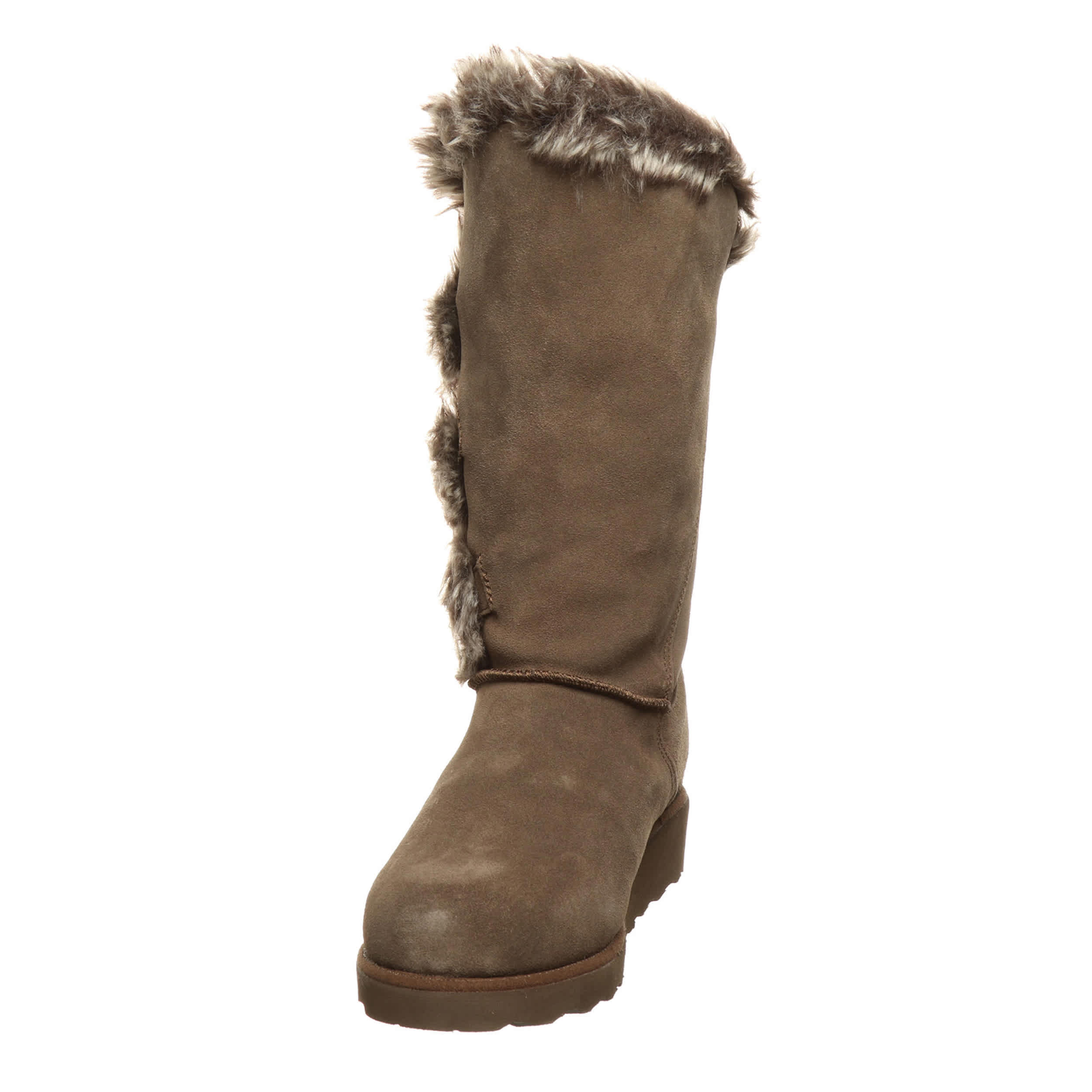 Switch up your cool weather casual look in the Bearpaw Genevieve women's fur boot. With a suede upper accented by a faux fur collar and buckles trimmed in faux fur, these boots definitely stand out from the pack. The comfort shearling footbed and rubber wedge heel make them a chic choice.