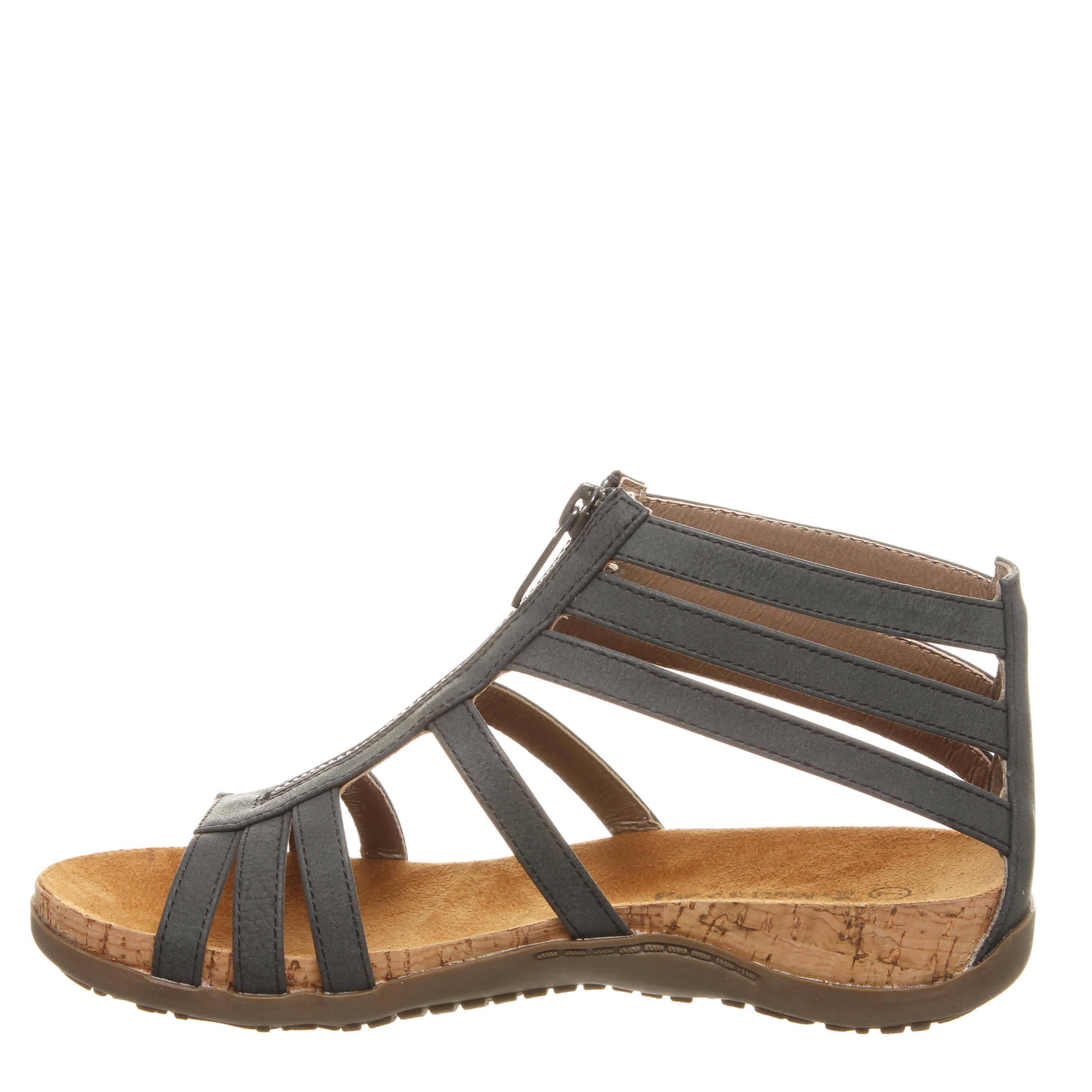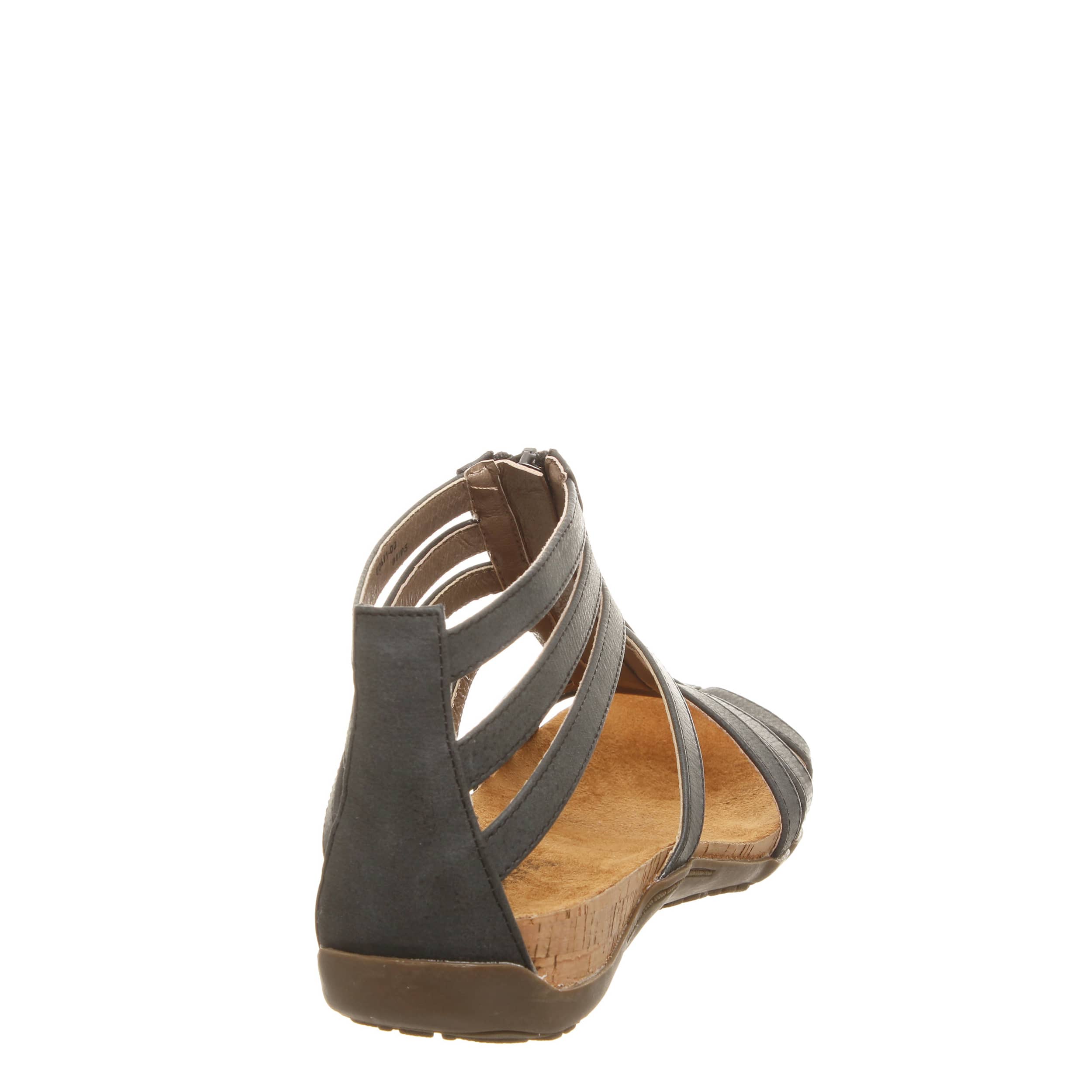 This strappy beauty elevates your style factor - the Bearpaw Layla II women's sandal. The front Bearpaw® zipper closure is chic as well as convenient, while the micro-suede contoured footbed cradles your feet in softness. Don't forget the cork-wrapped EVA midsole paired with the sculpted TPR sole, a winning combo for walking and exploring the town.