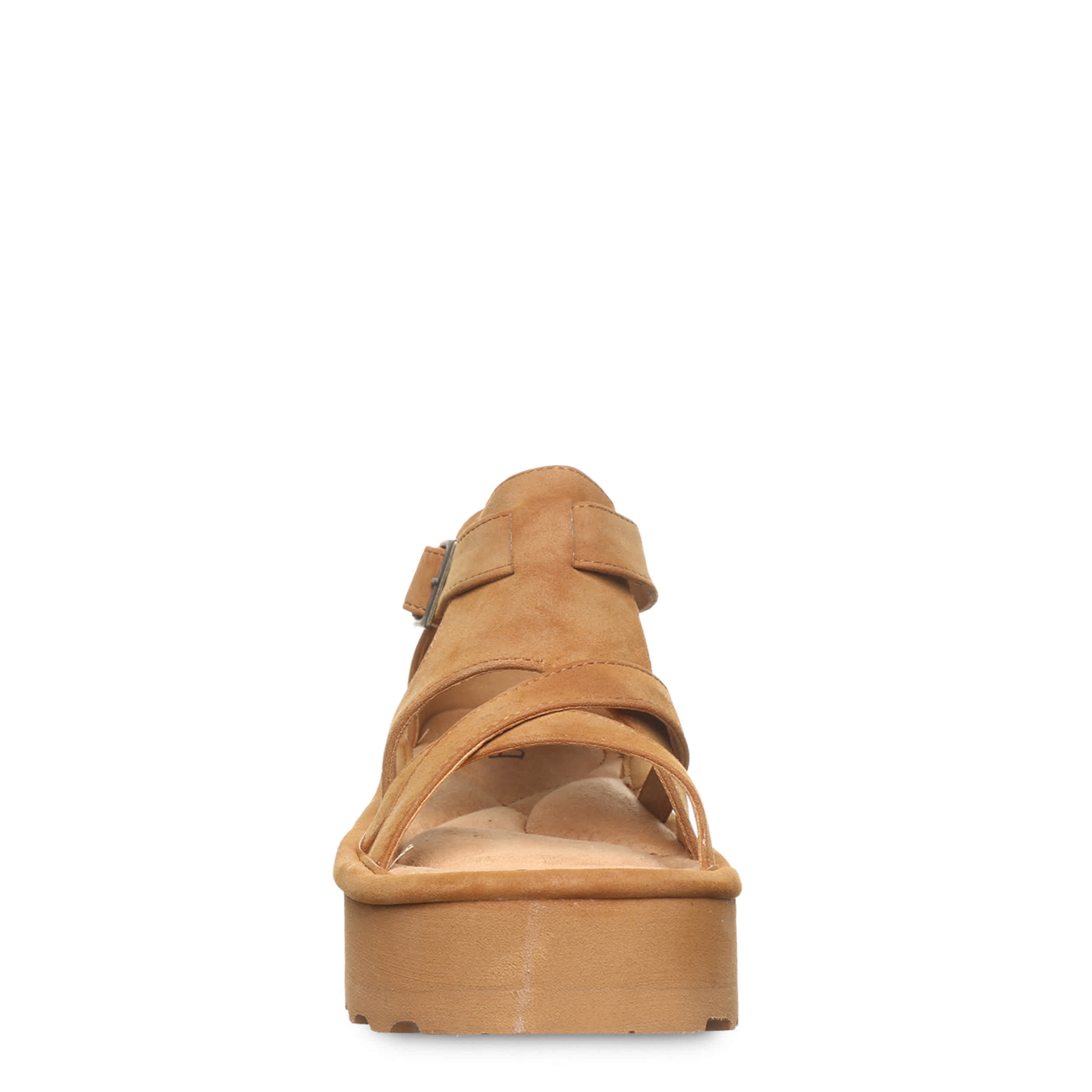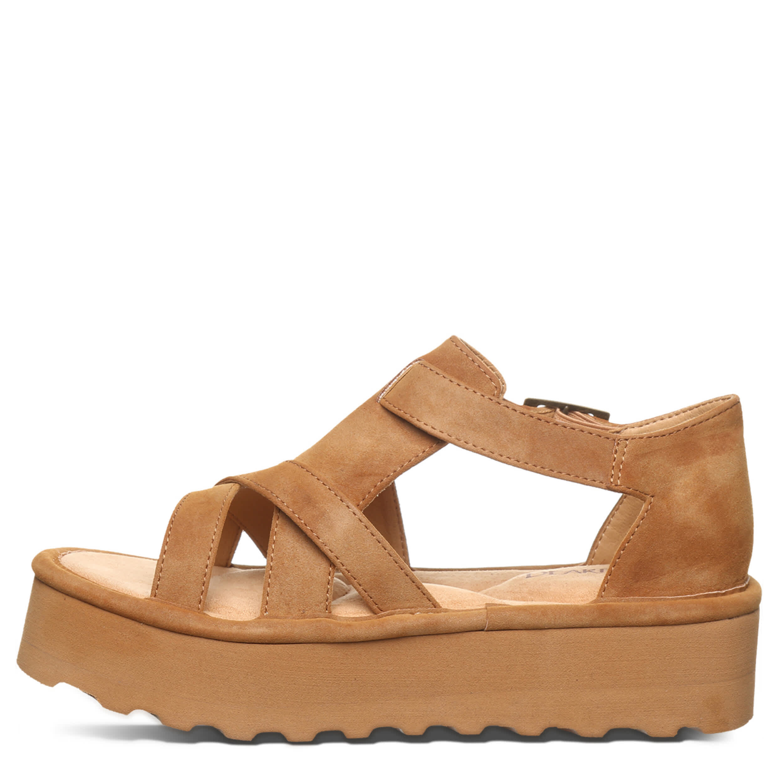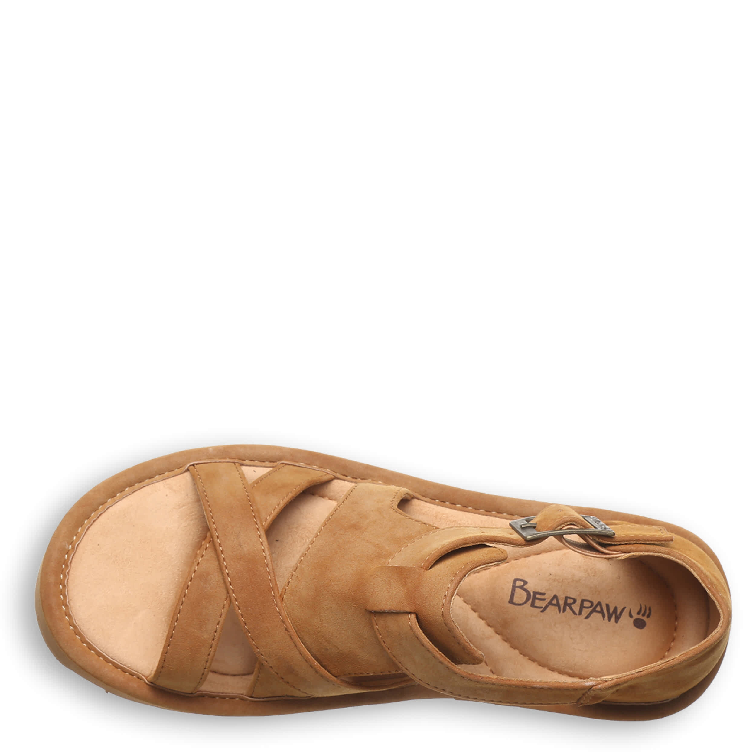 Walk cute in the Pinnacle women's sandal from Bearpaw. Featuring a faux leather upper with a faux leather lining, this platform cross-strap sandal gives you that great slip-in feel. The quilted footbed cushions while the midsole & outsole offer just enough lift.