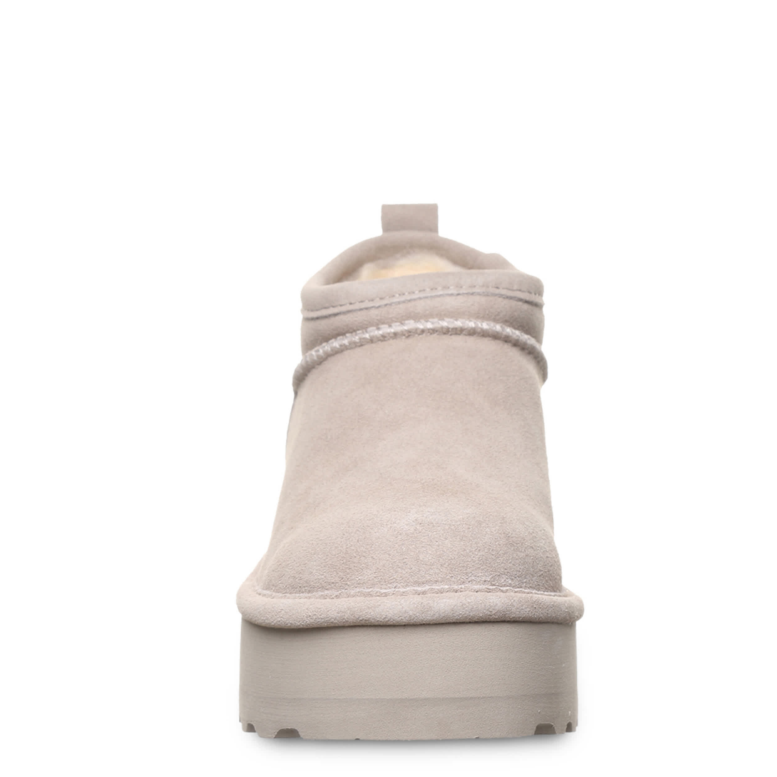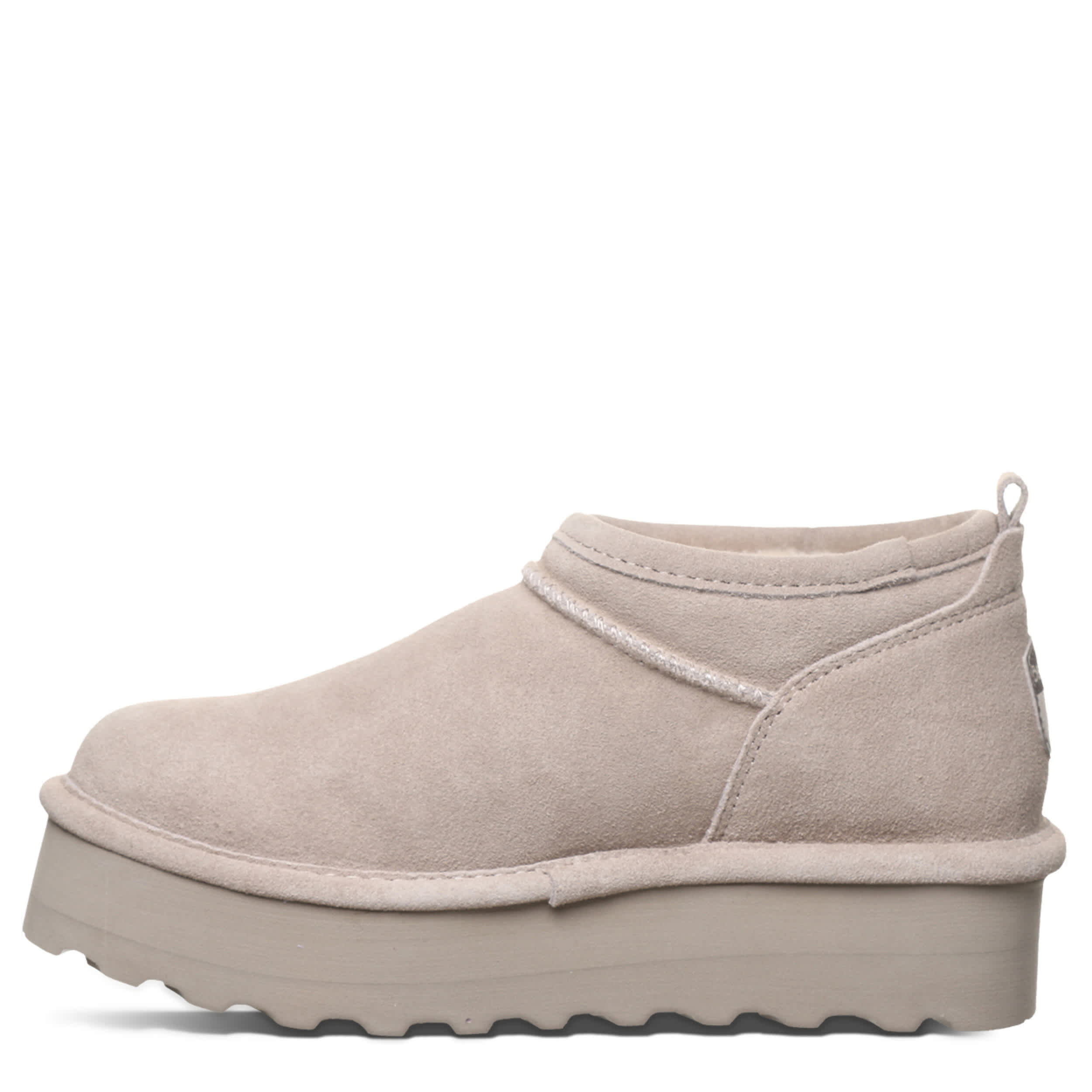 Have fun in the Retro Super Shorty women's fur boot by Bearpaw. With a suede upper featuring BearCoat® Rain and Stain repellent to protect against the elements, this pull-on bootie is still perfect for cold days out and about. The lining & footbed offer warm cushioning while the platform outsole adds some lift to your unbothered steps.