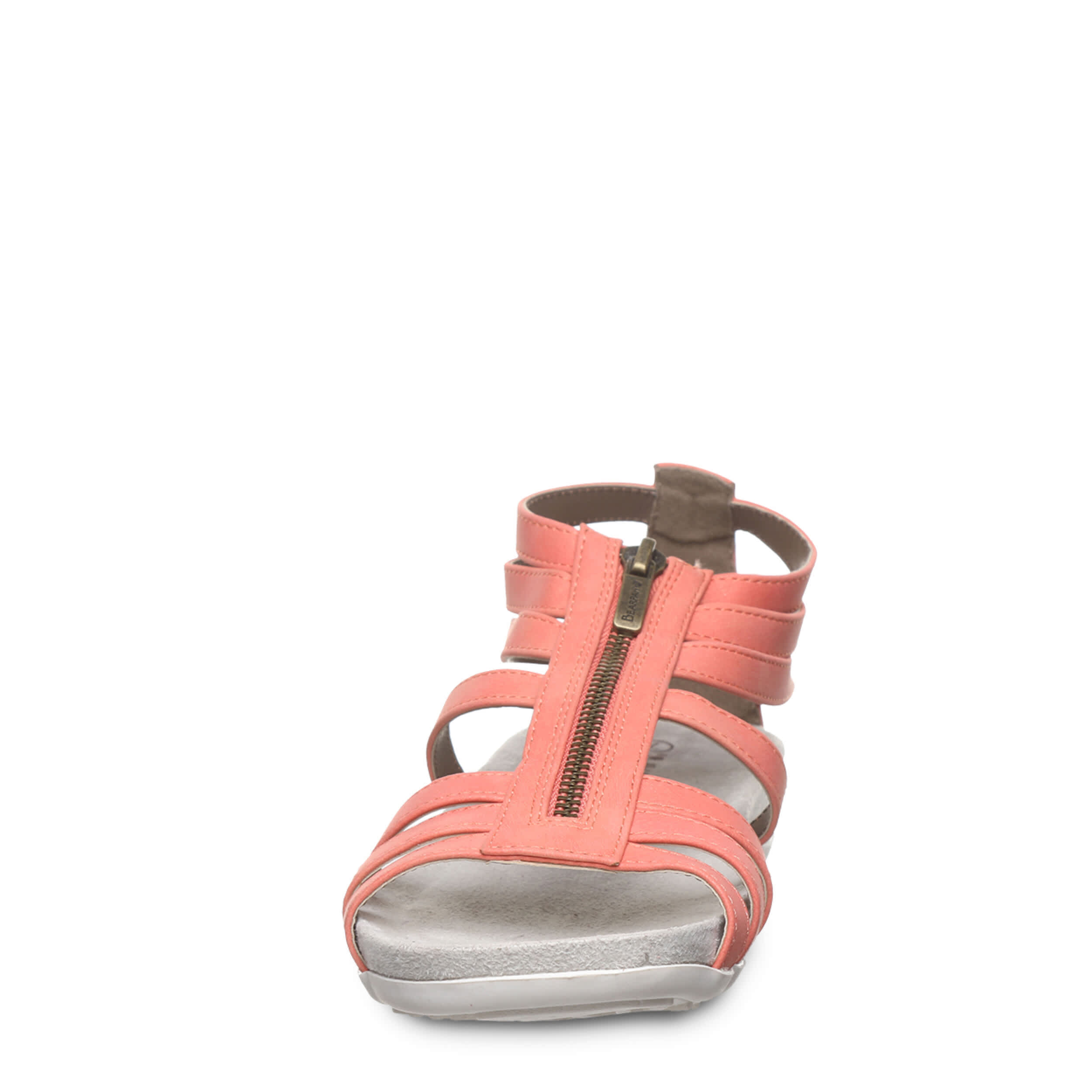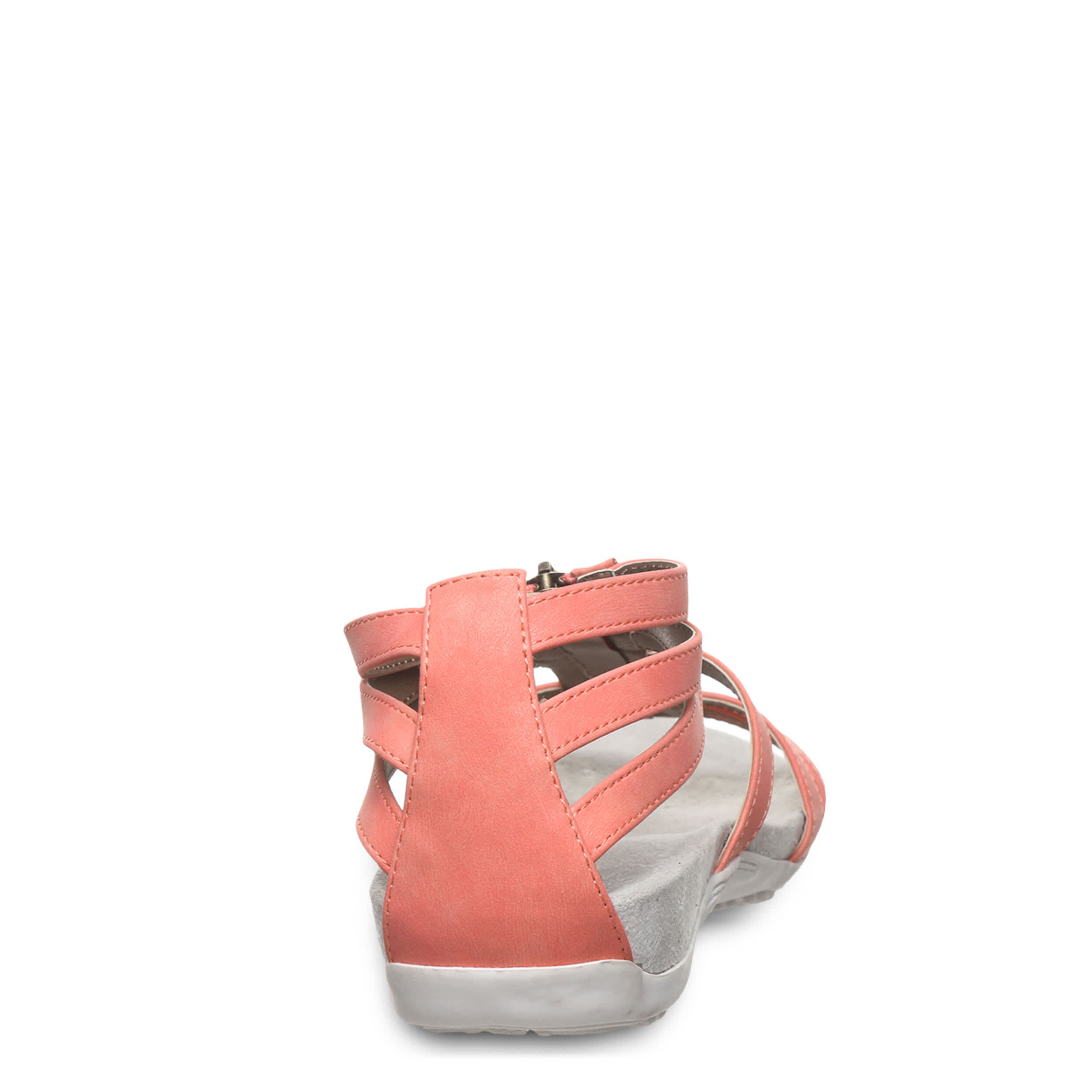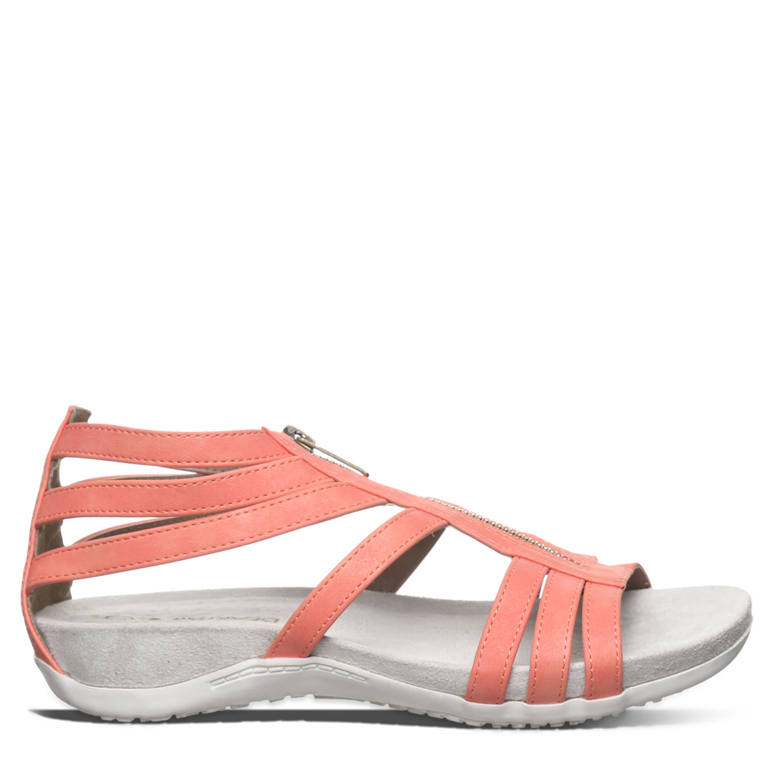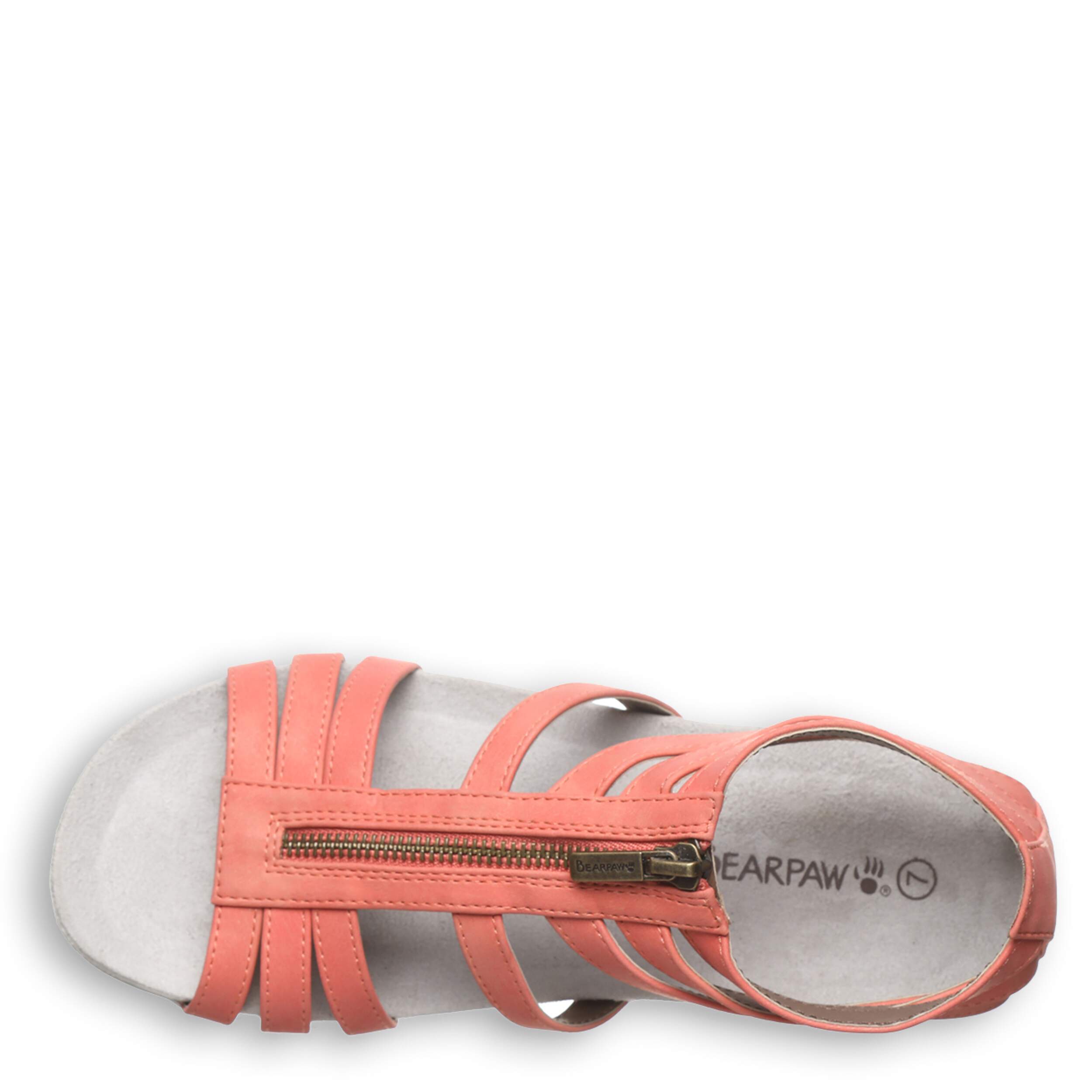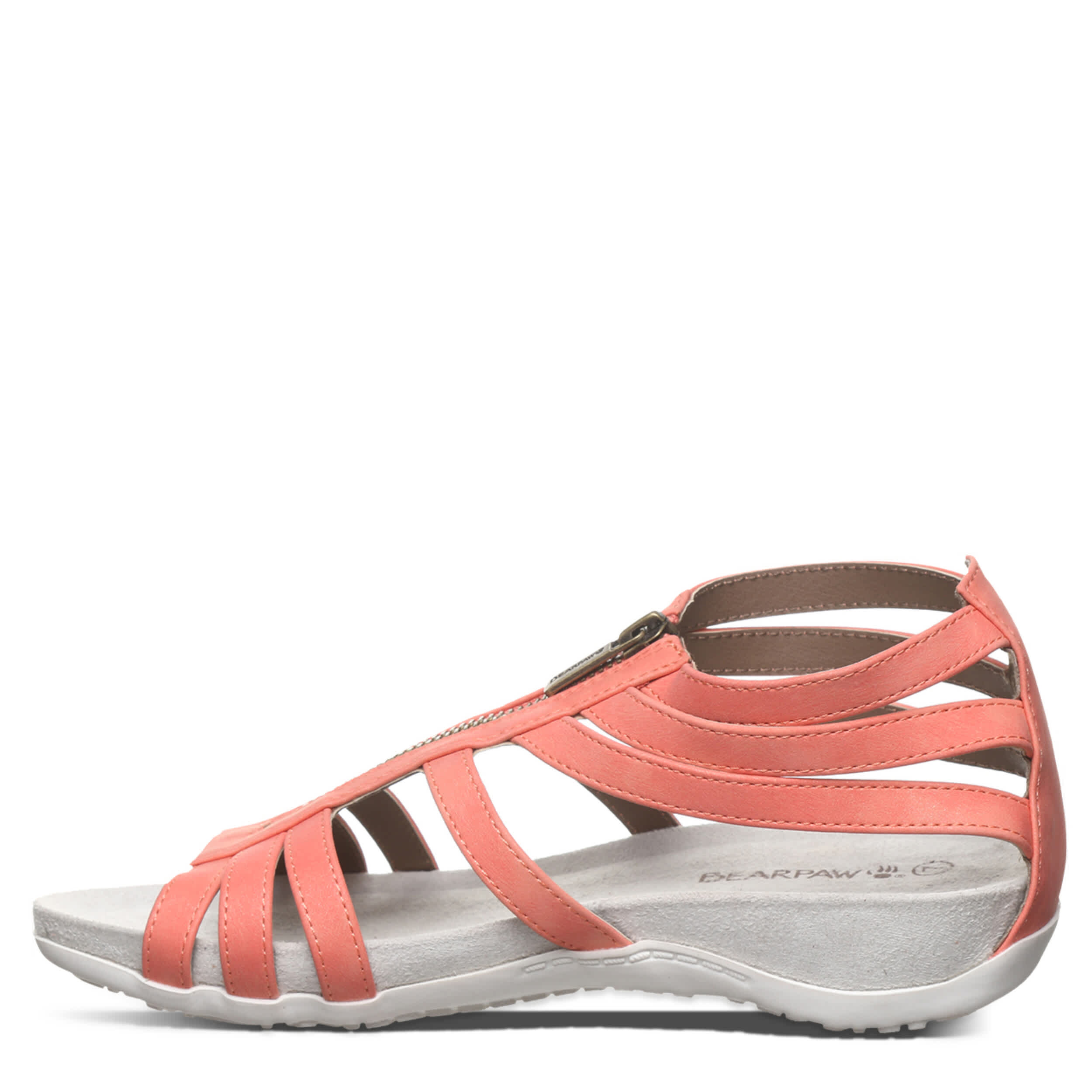 Effortless summer style - the Bearpaw Ronda women's sandal. Featuring a faux leather upper with a faux leather lining, this strappy sandal a front zipper for easy entry. The contoured, EVA footbed cradles your foot with microsuede softness, while the slight heel adds some lift.