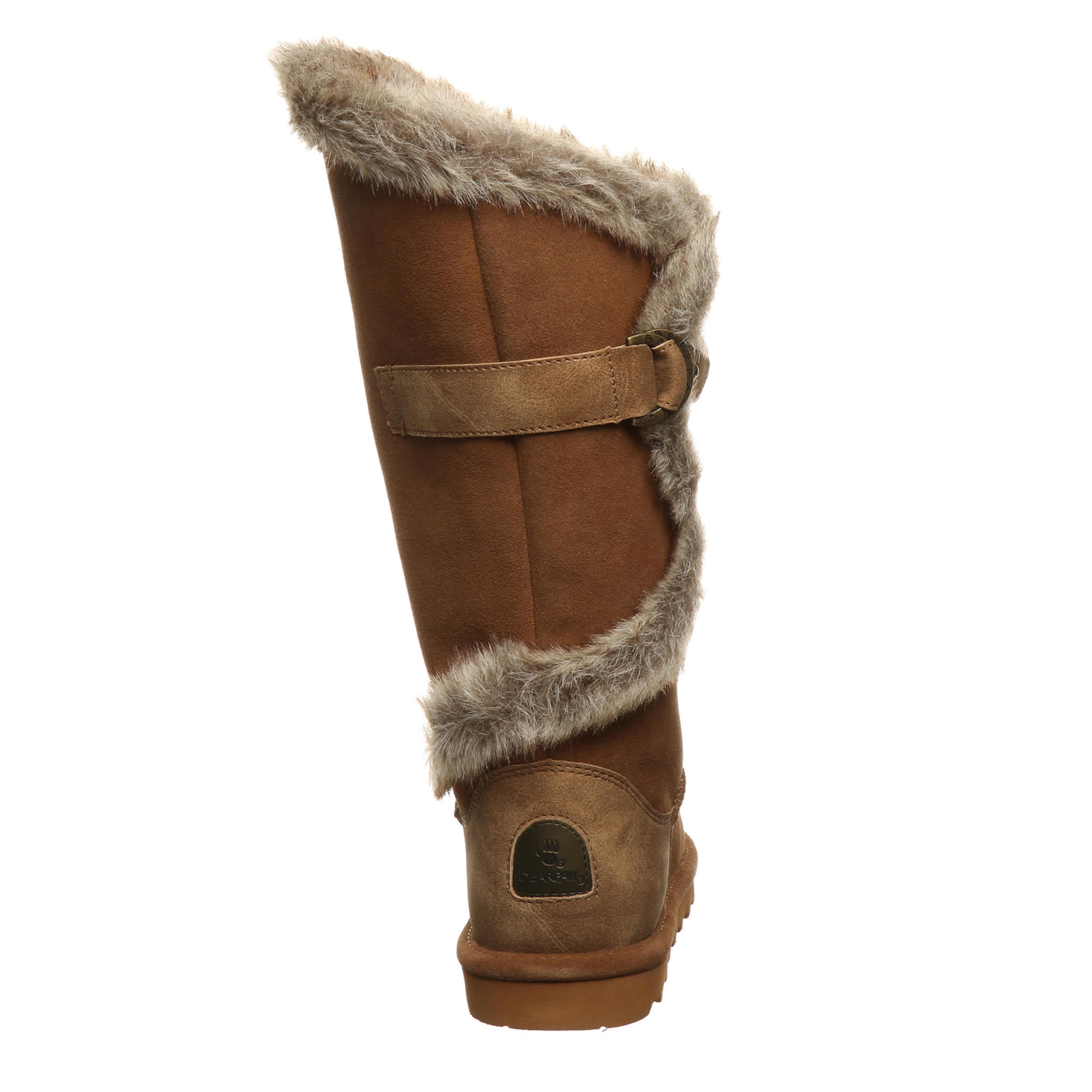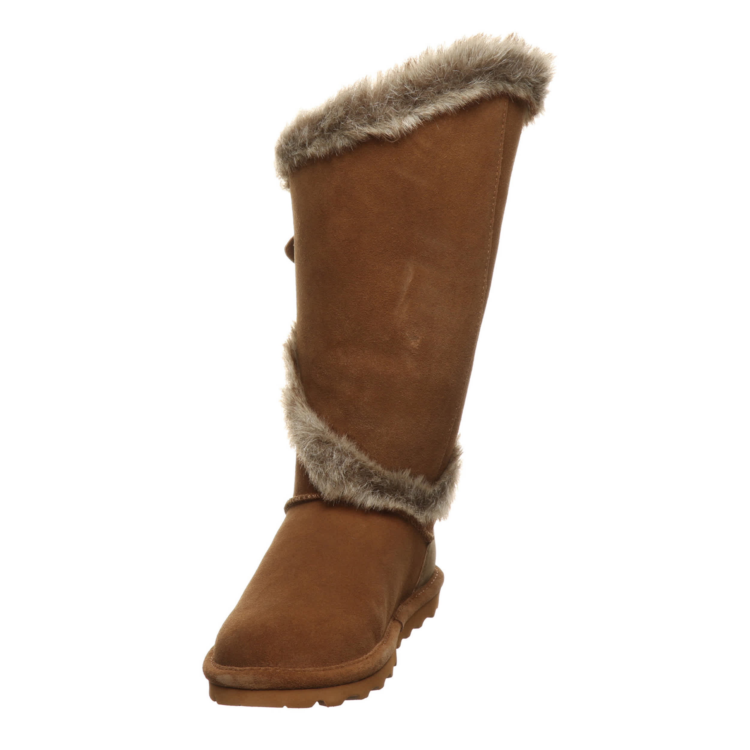 Run errands in style with the Sheilah women's fur boot from Bearpaw. With an asymmetrical top line and fluffy faux fur trim, these boots will make any trip look and feel better. Treated with BearCoatâ„¢ Rain and Stain Repellent ensures water won't ruin your fun and the comfort shearling footbed soothes as you go.