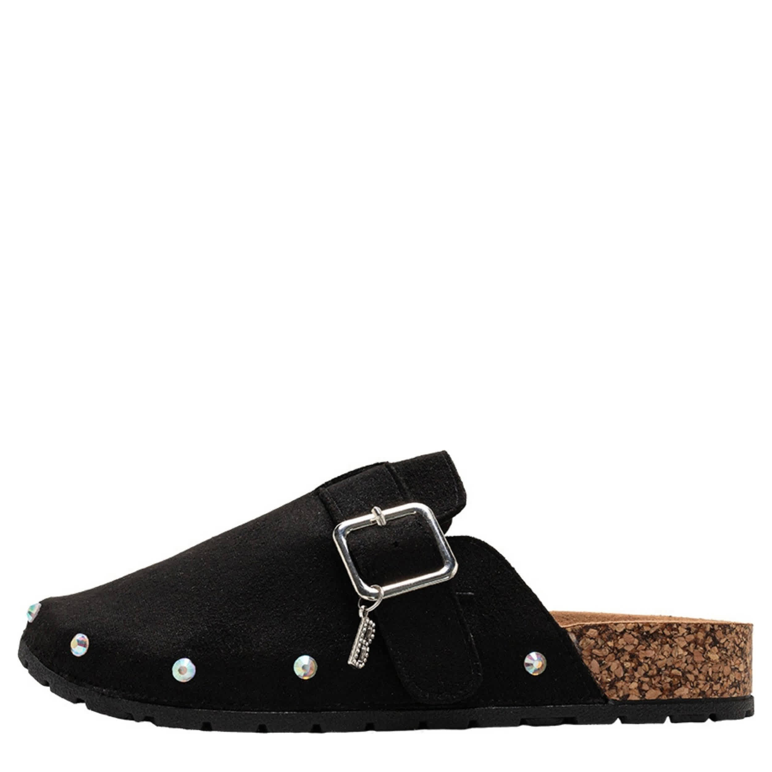 Sparkle and move forward in the Destiny girls' clog from bebe. Featuring a faux leather upper with a buckle strap and B dangle, this cute shoe is perfect with thick socks. The footbed cradles her foot, while the sole provides textured traction.