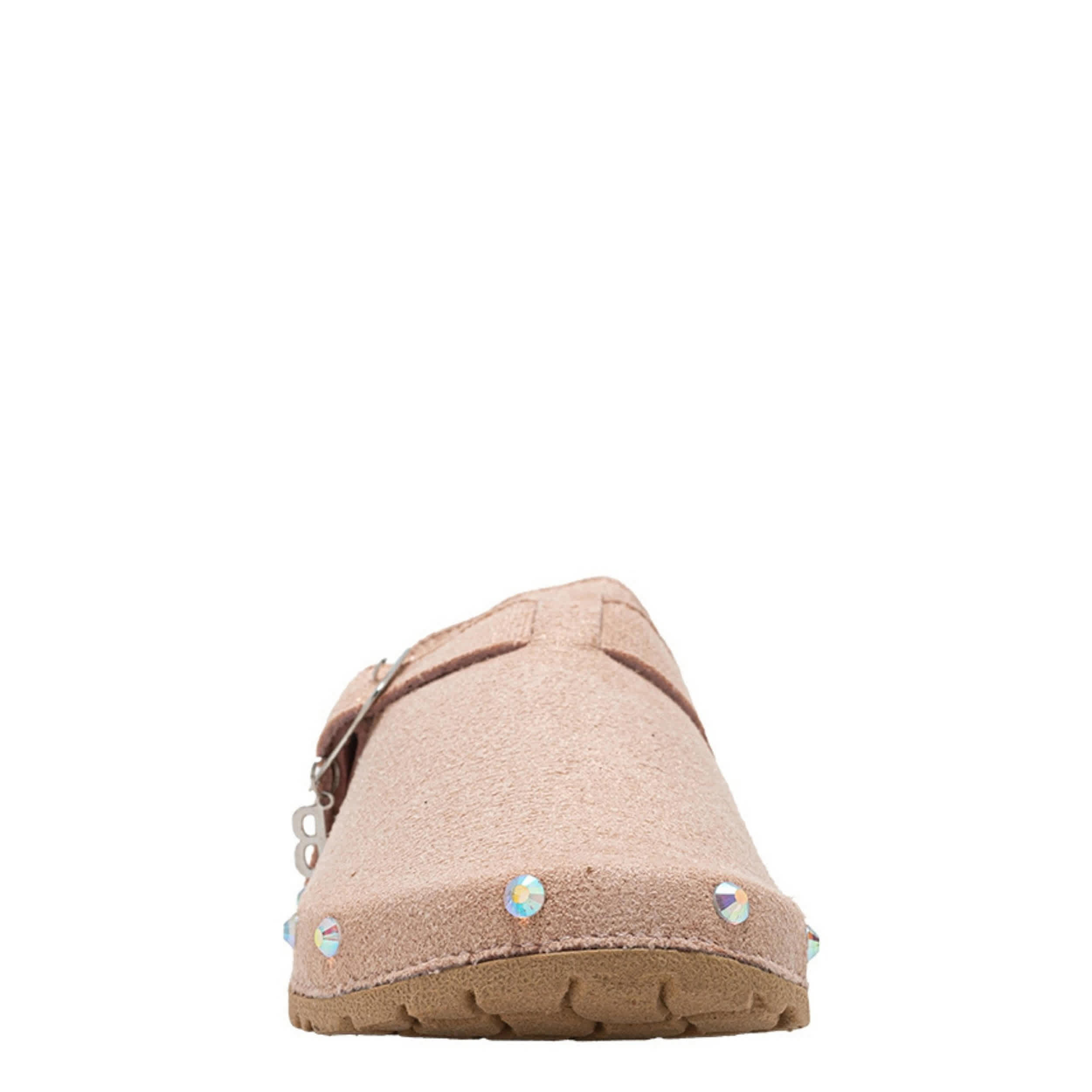Sparkle and move forward in the Destiny girls' clog from bebe. Featuring a faux leather upper with a buckle strap and B dangle, this cute shoe is perfect with thick socks. The footbed cradles her foot, while the sole provides textured traction.