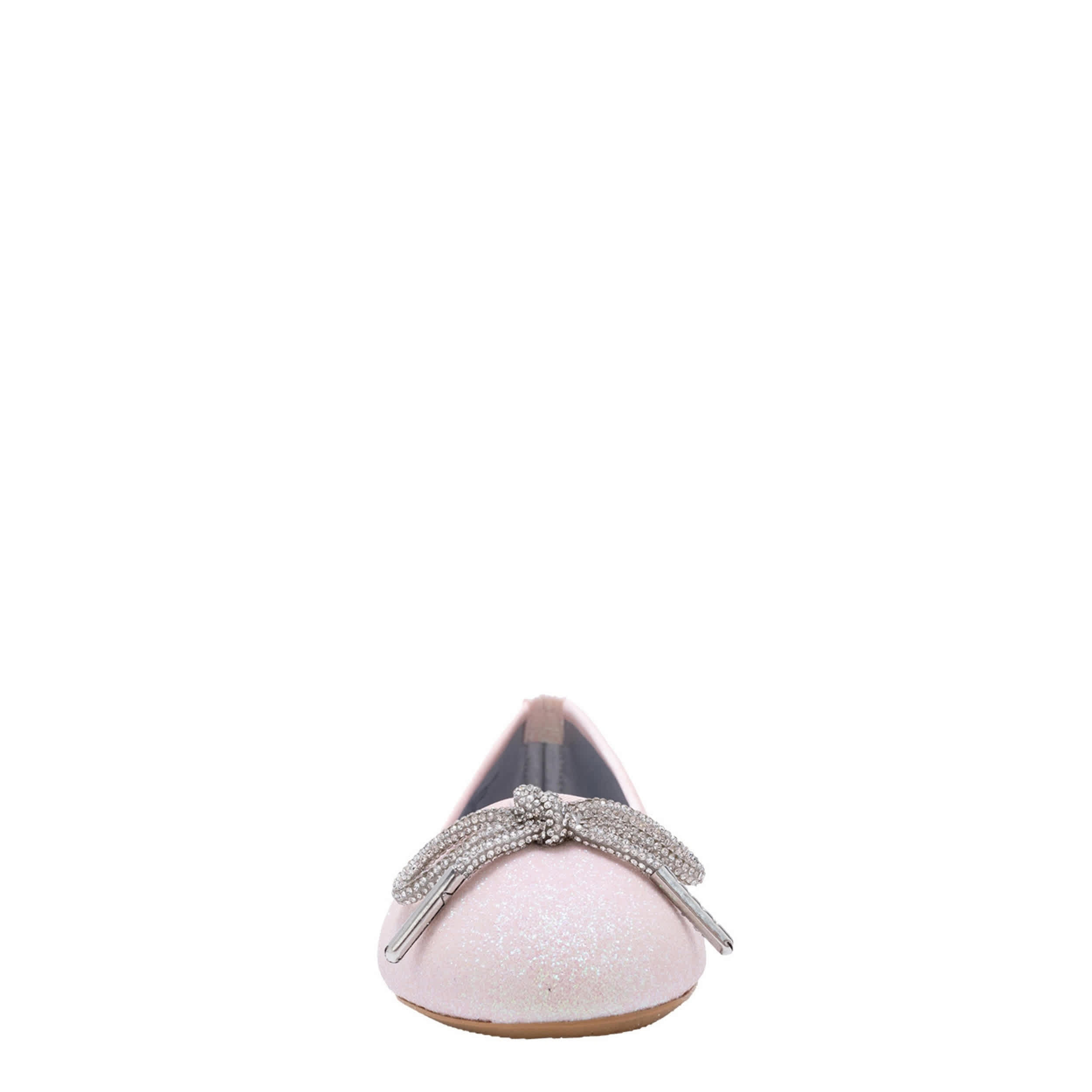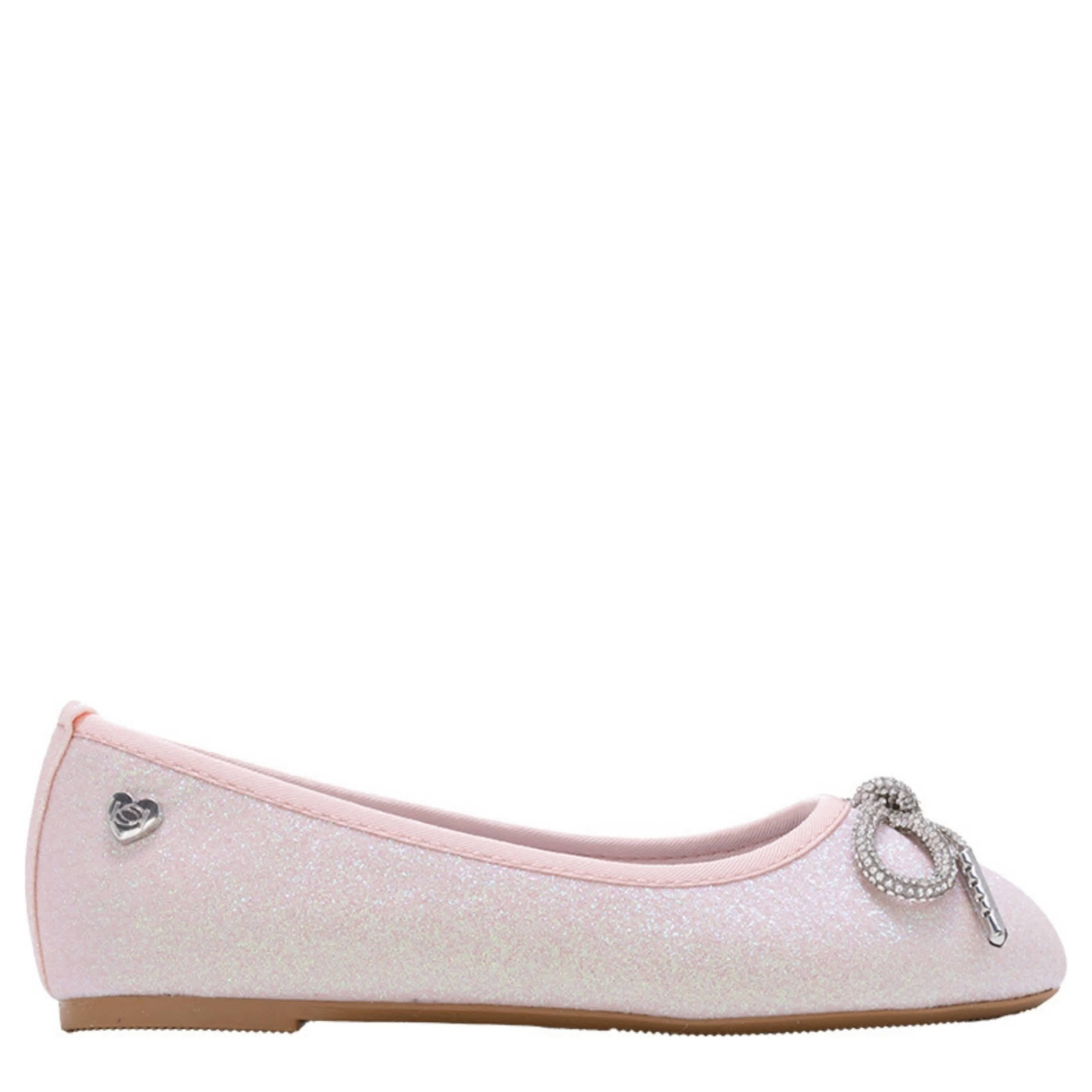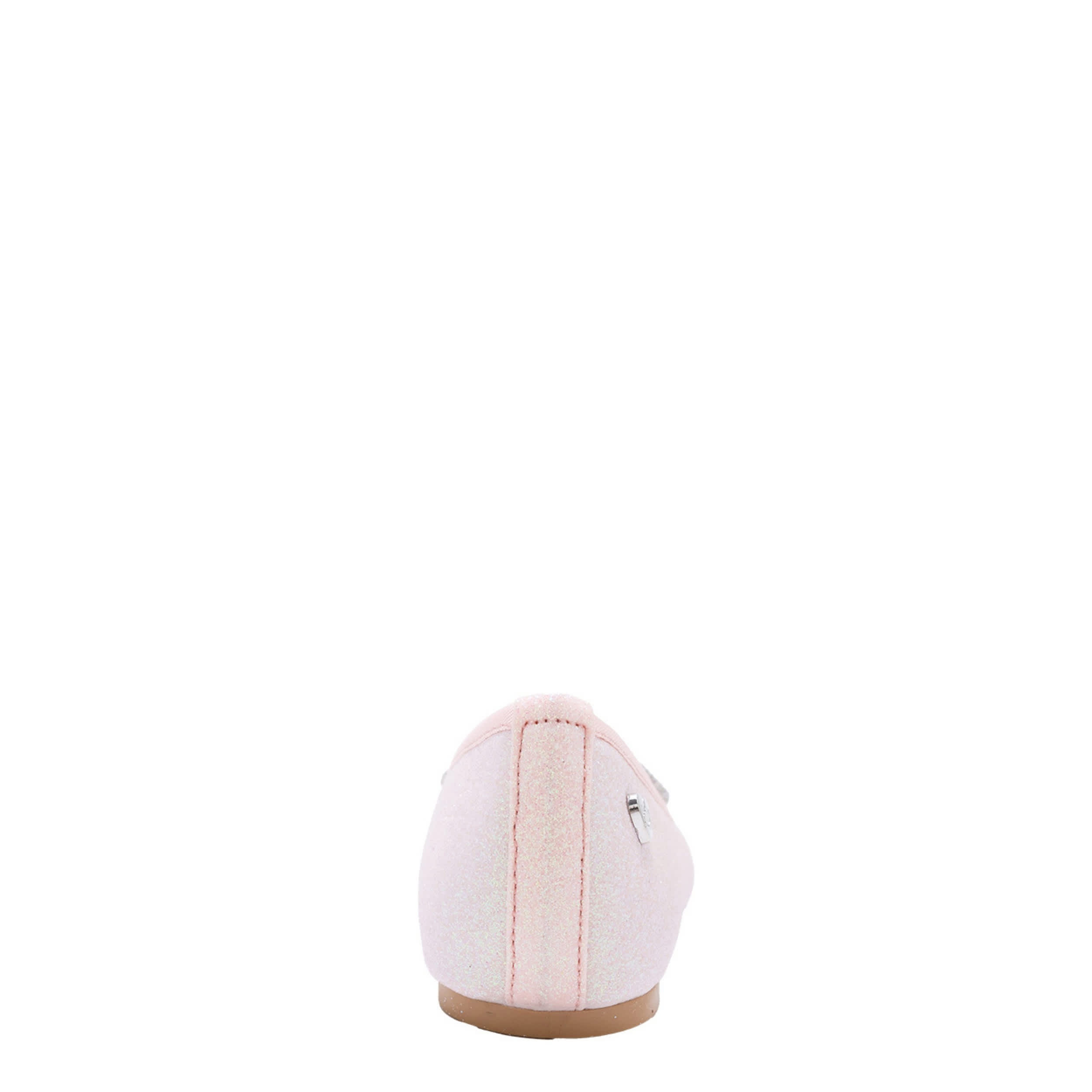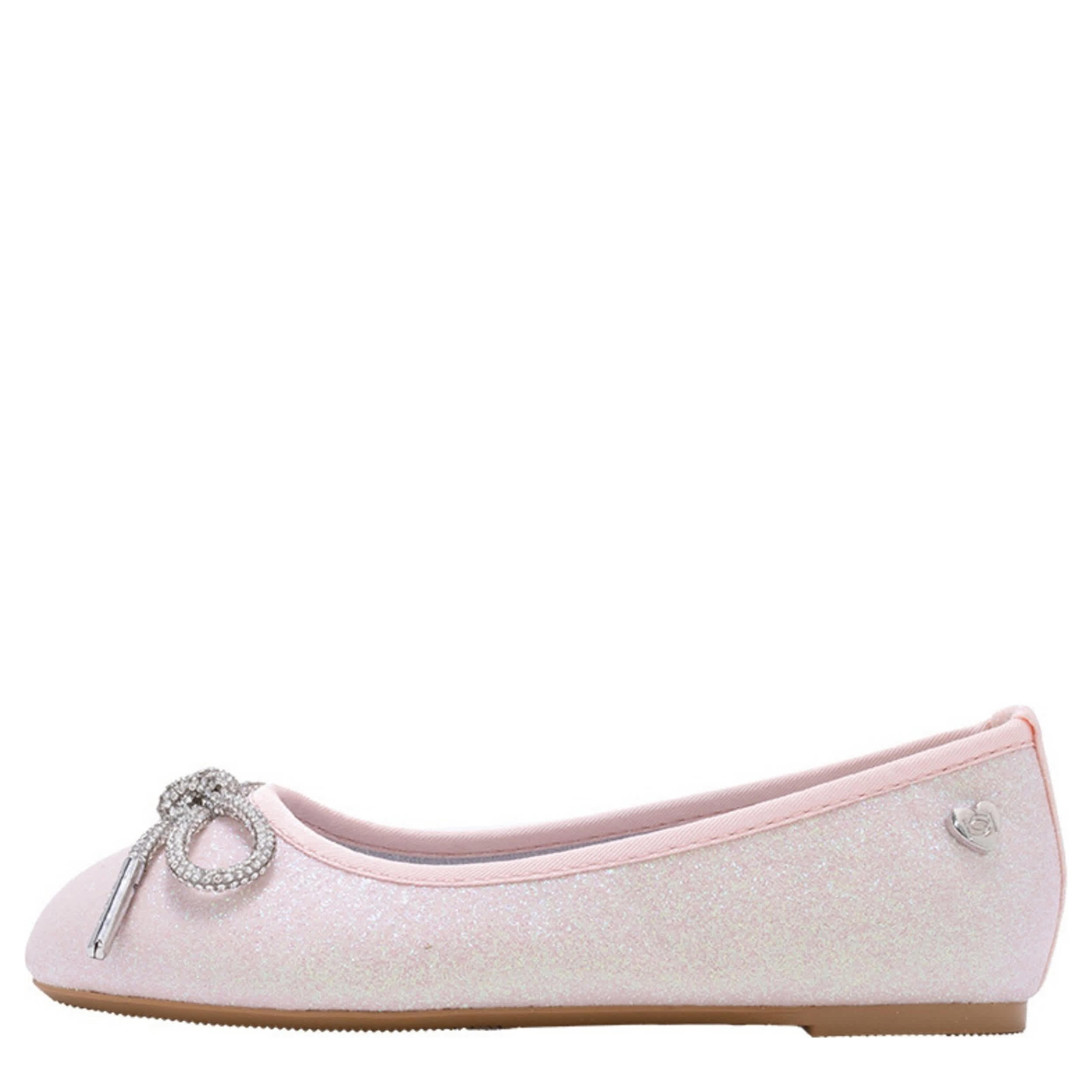Style her in the Gina girls' flat dress shoe from bebe. Featuring a glittery upper with a rhinestone-encrusted bow for extra flair, this flat also has a small heart ornament on the side. The footbed comforts her foot, while the sole provides durability.
