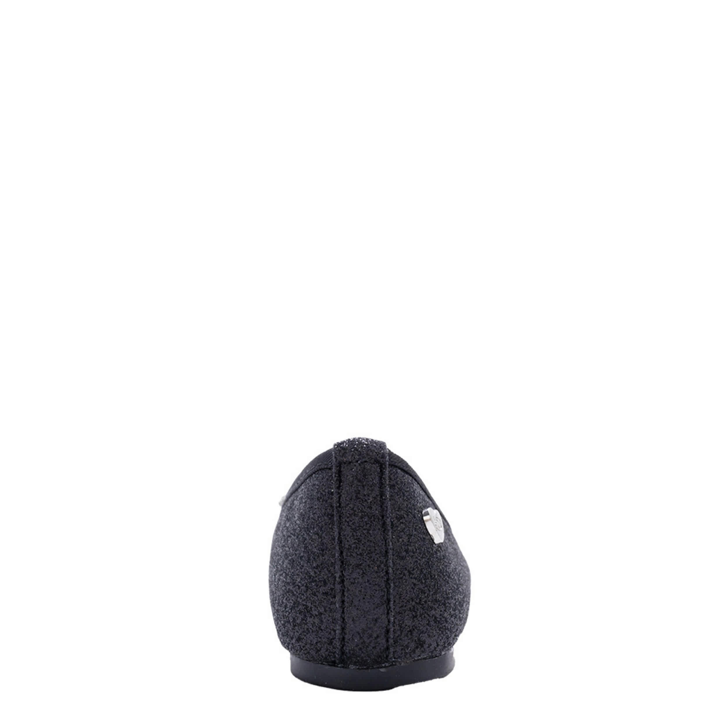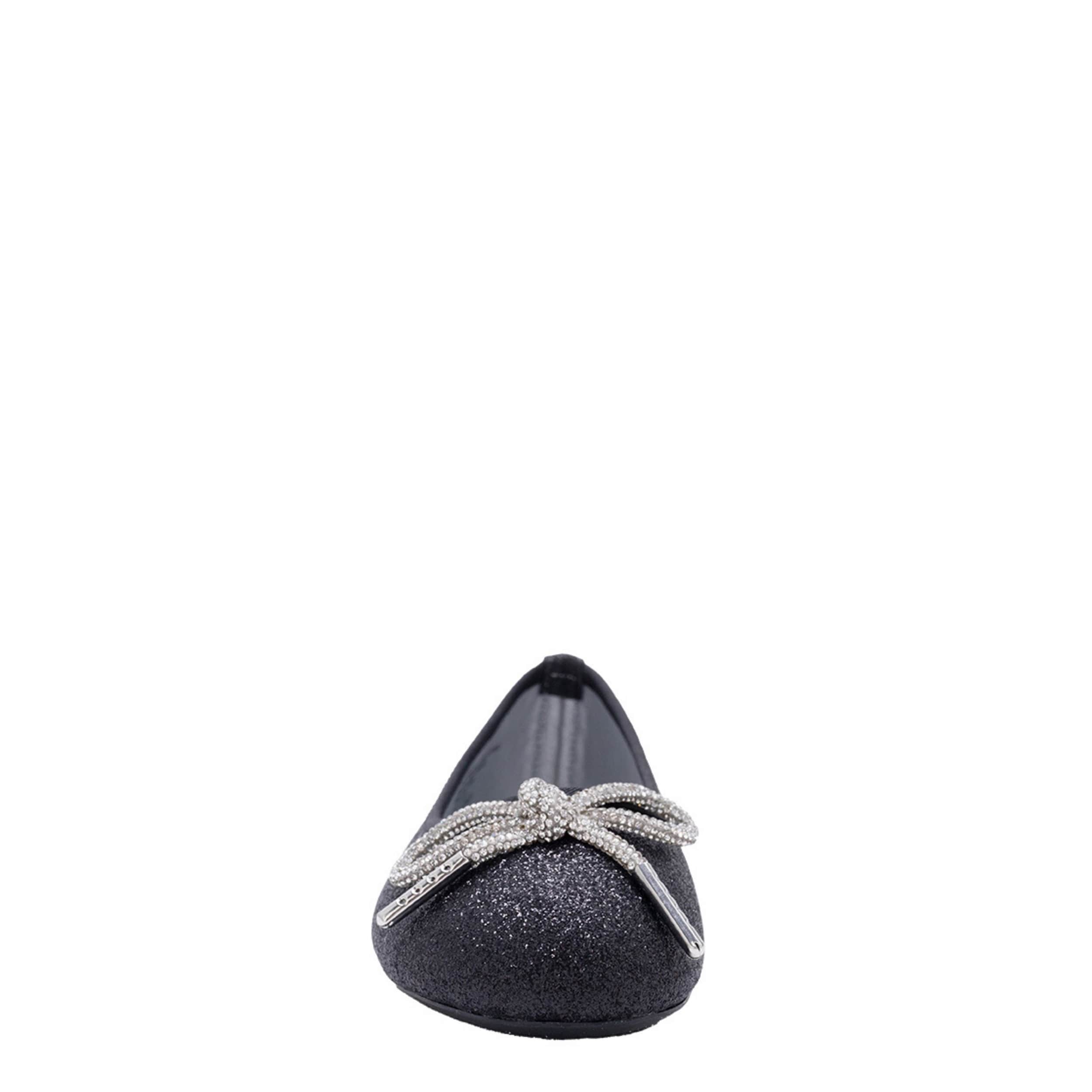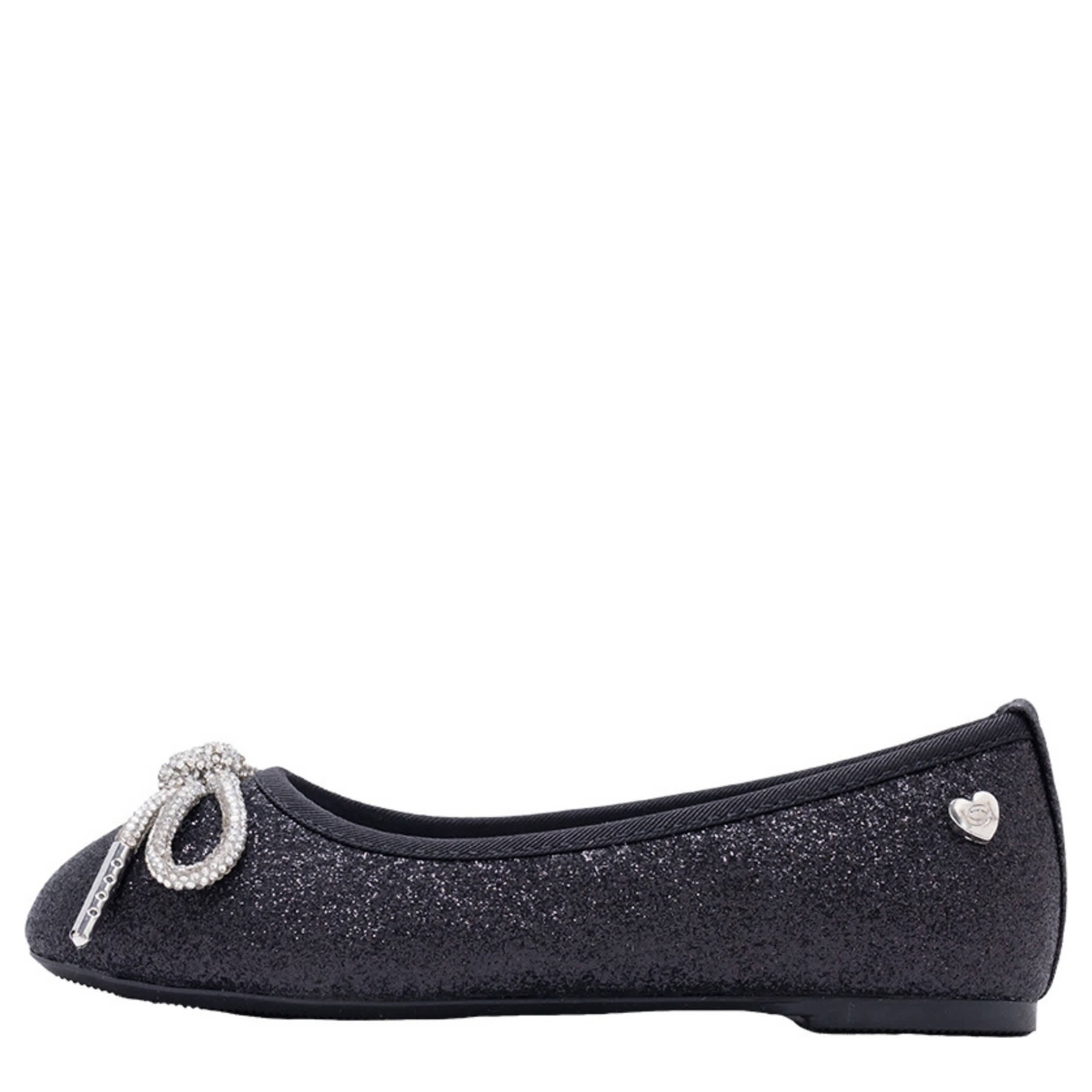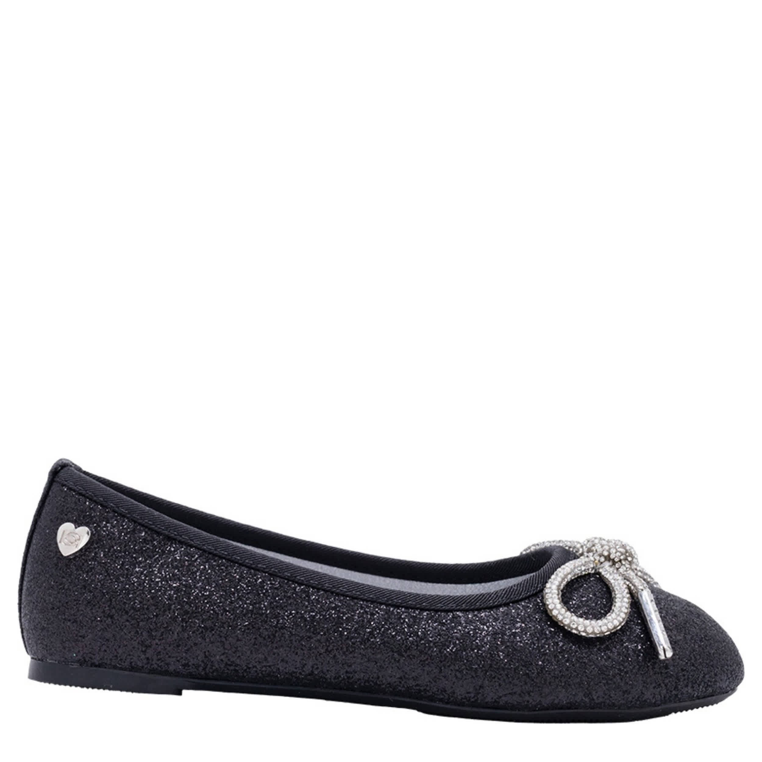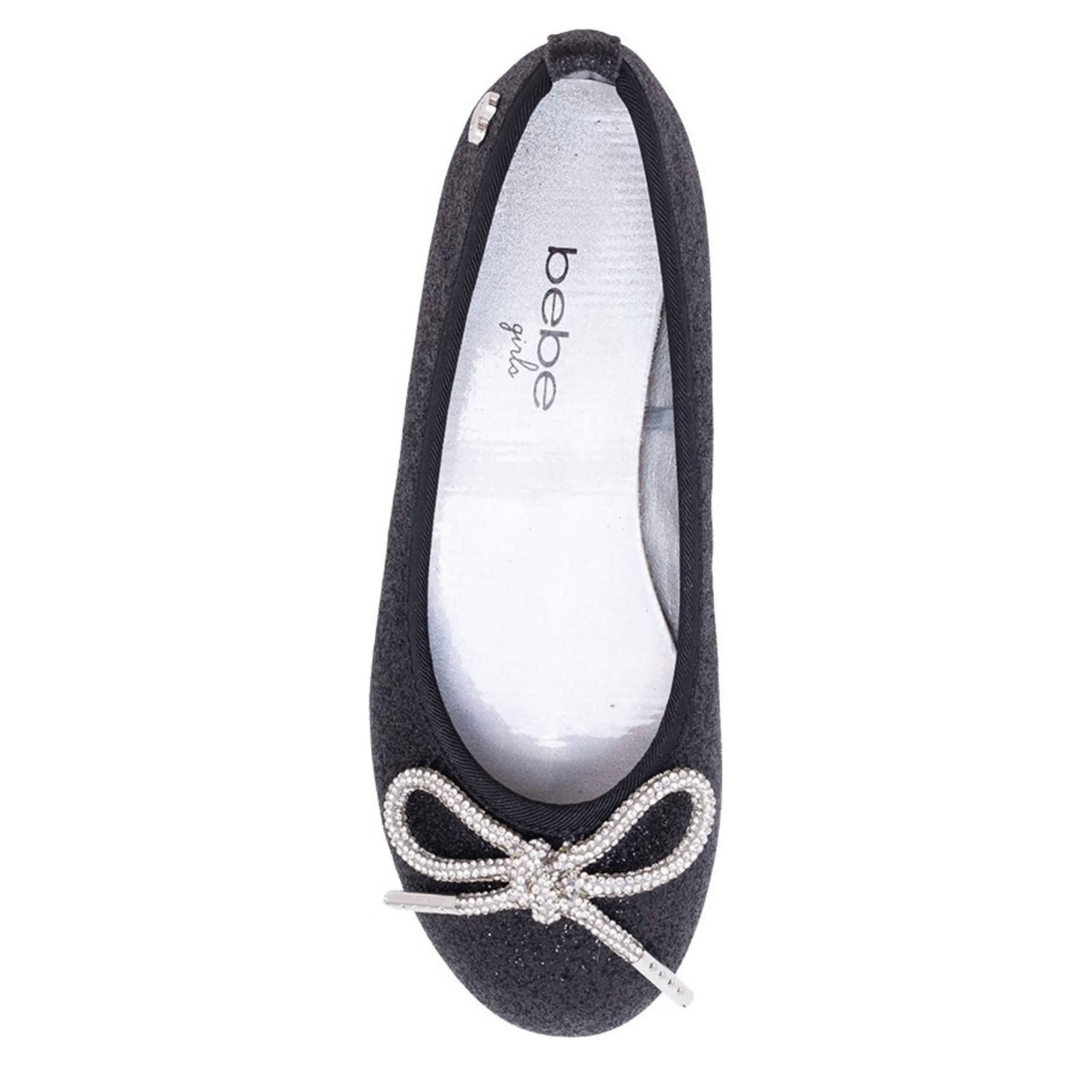Style her in the Gina girls' flat dress shoe from bebe. Featuring a glittery upper with a rhinestone-encrusted bow for extra flair, this flat also has a small heart ornament on the side. The footbed comforts her foot, while the sole provides durability.
