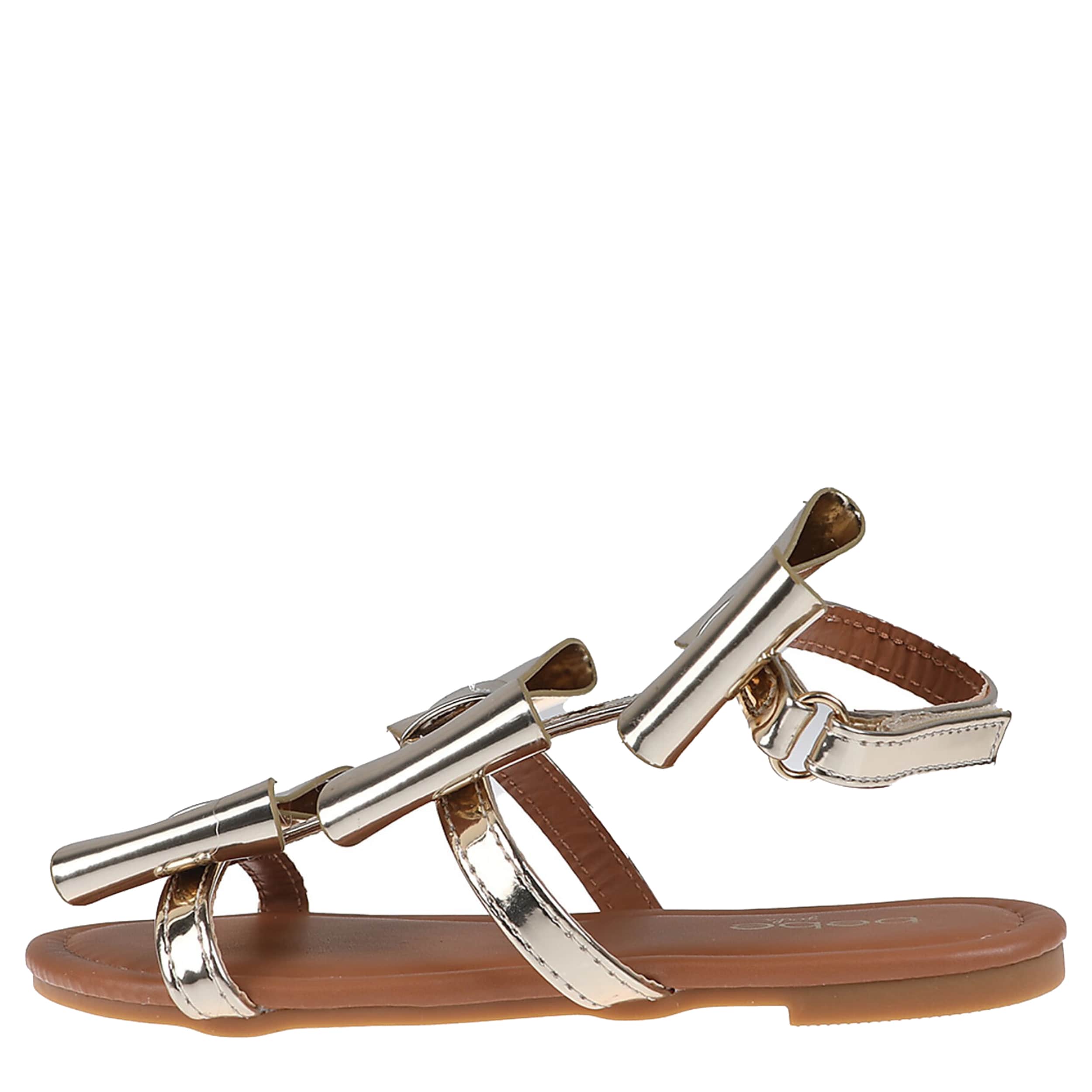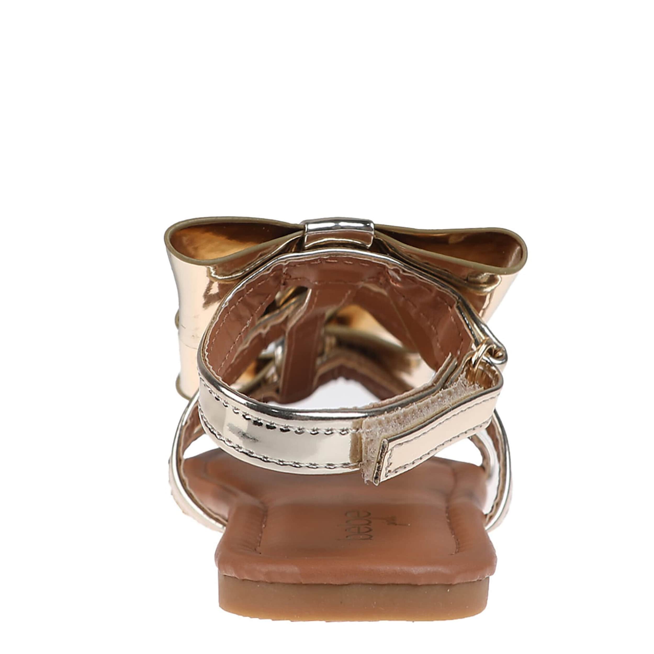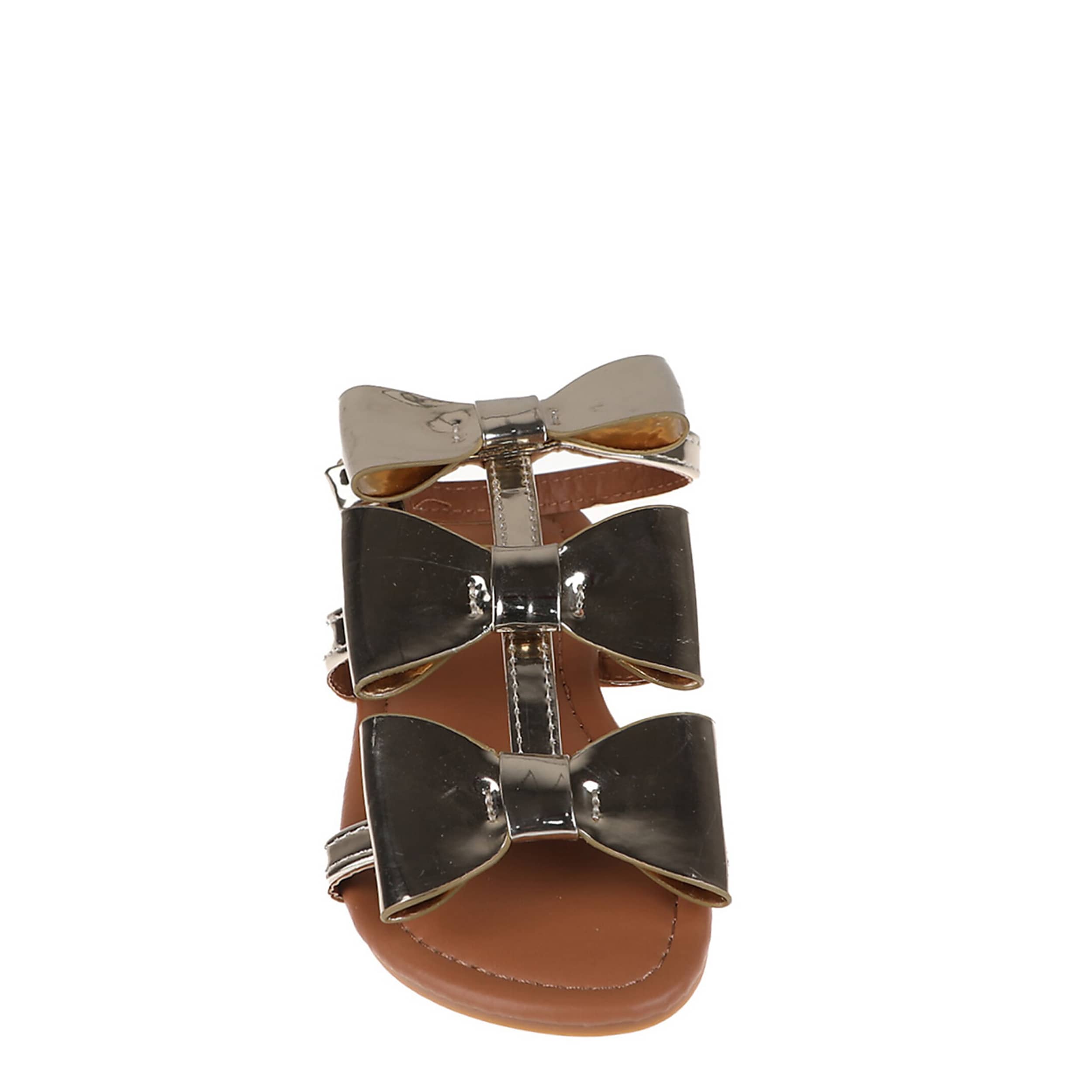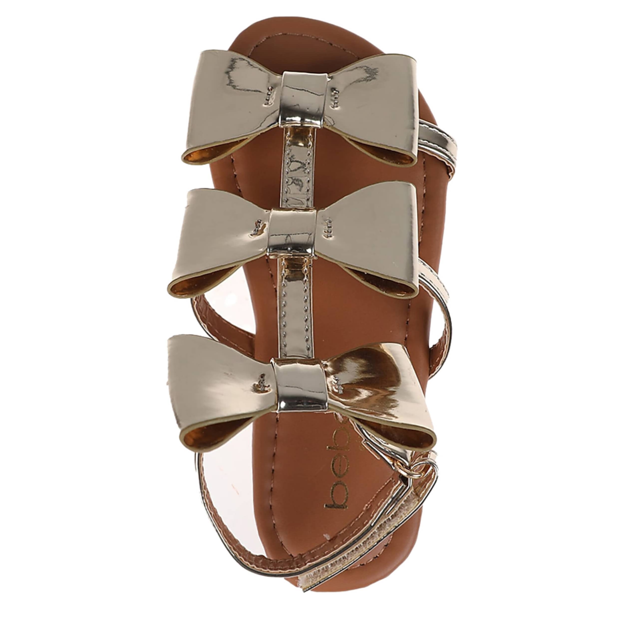 Top up her style with the bebe girls' sandal. Featuring a metallic shine upper in a minimalist style, this chic shoe fulfills her need to be a little fashionista. The insole cushions her steps, while the flat outsole offers durability.