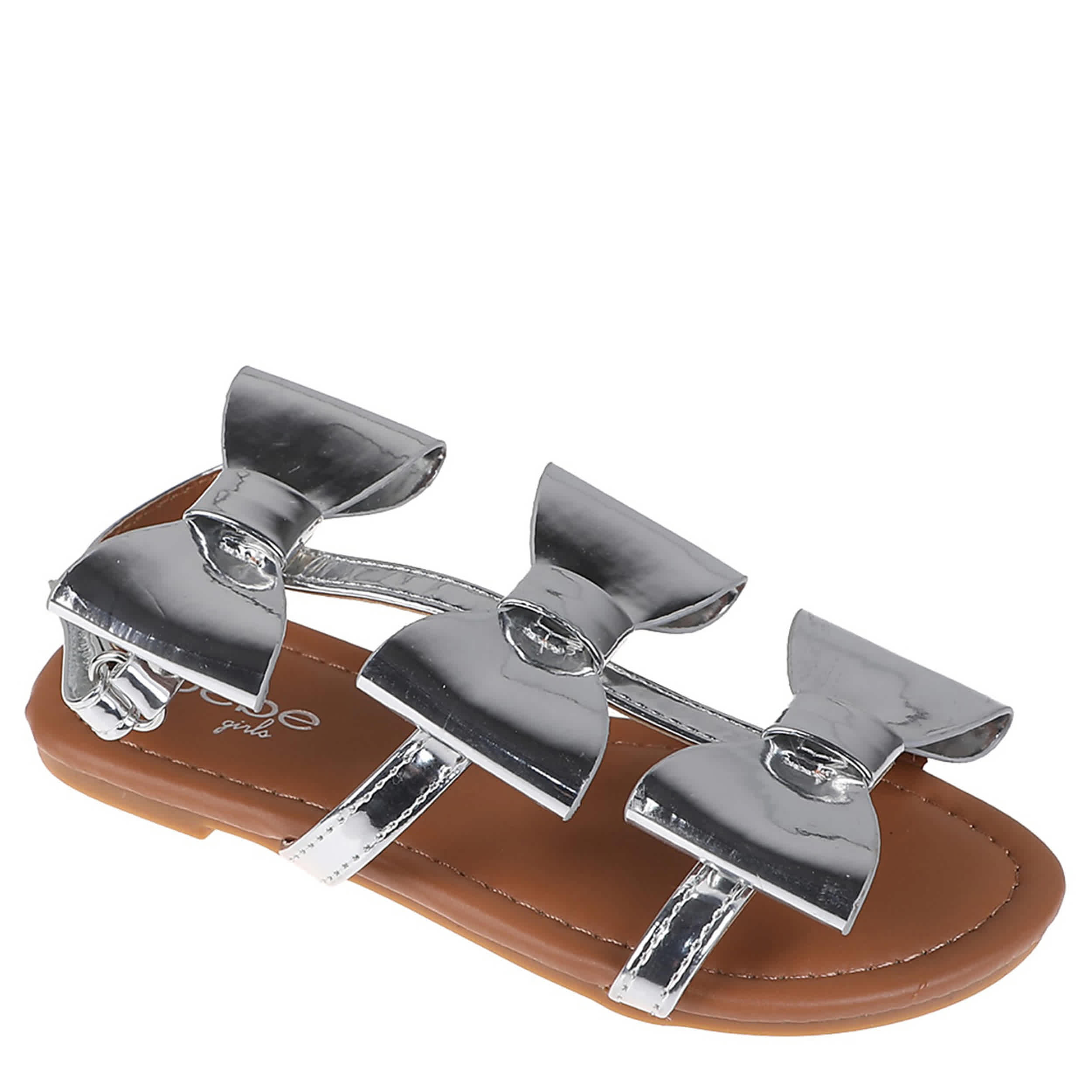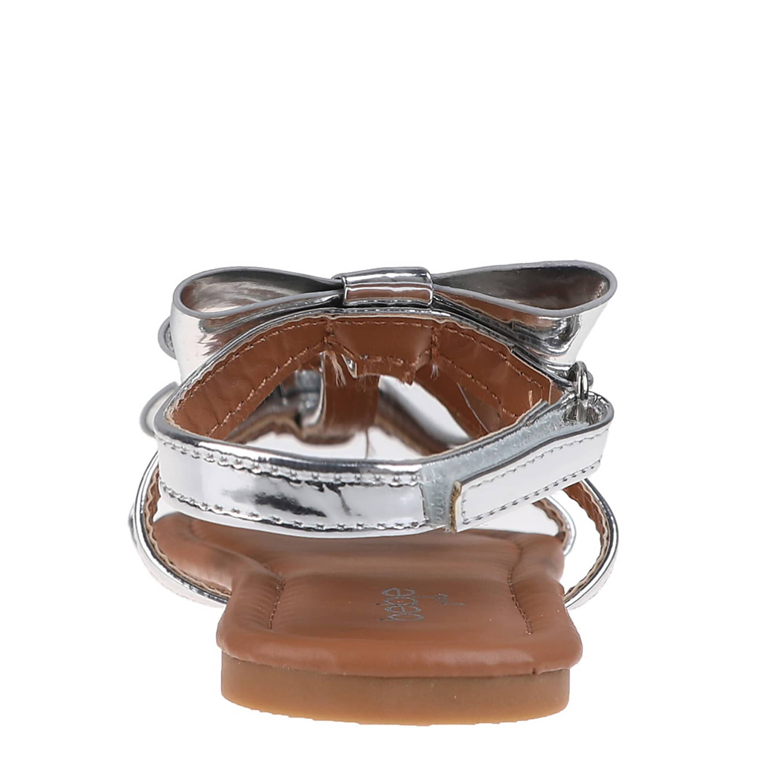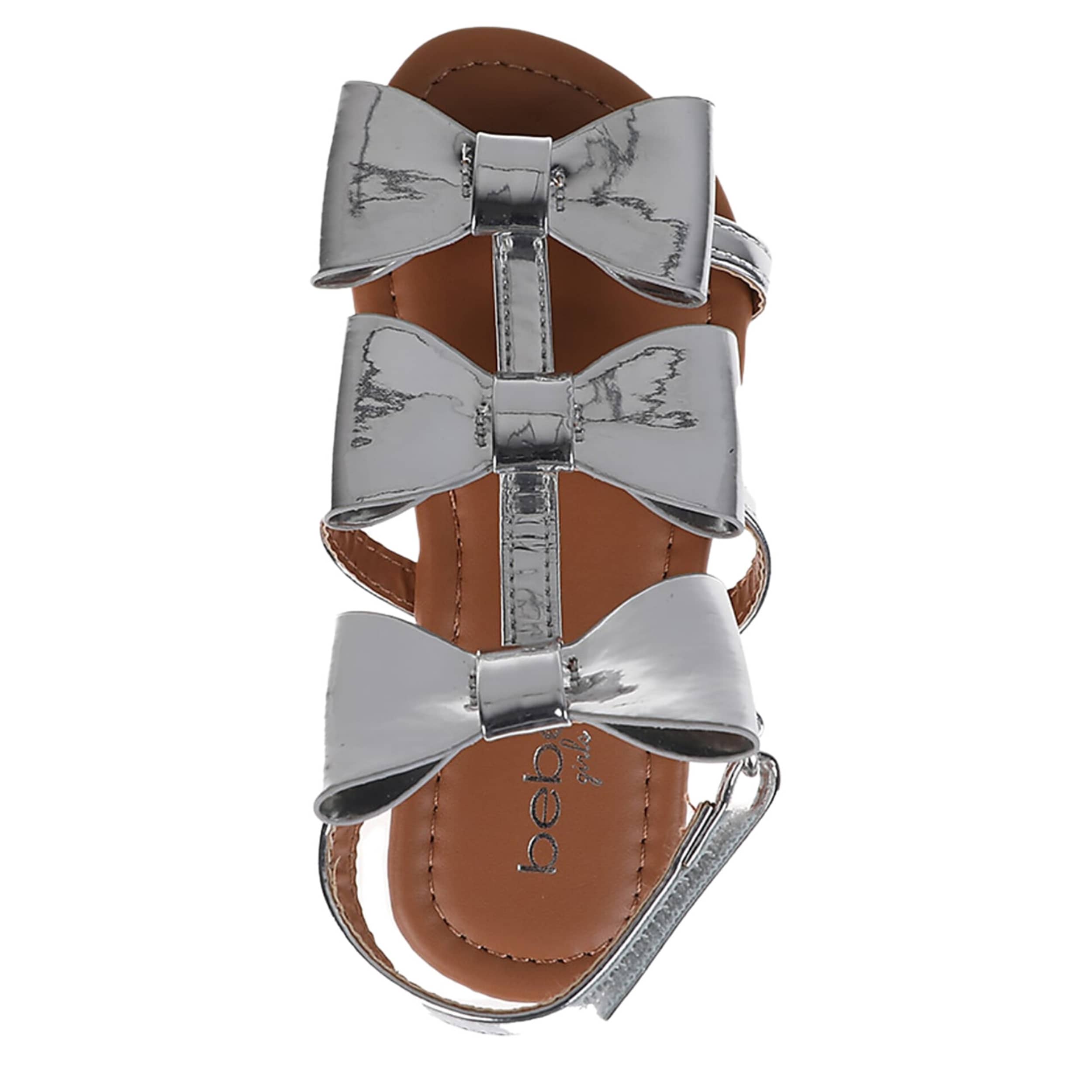 Top up her style with the bebe girls' sandal. Featuring a metallic shine upper in a minimalist style, this chic shoe fulfills her need to be a little fashionista. The insole cushions her steps, while the flat outsole offers durability.