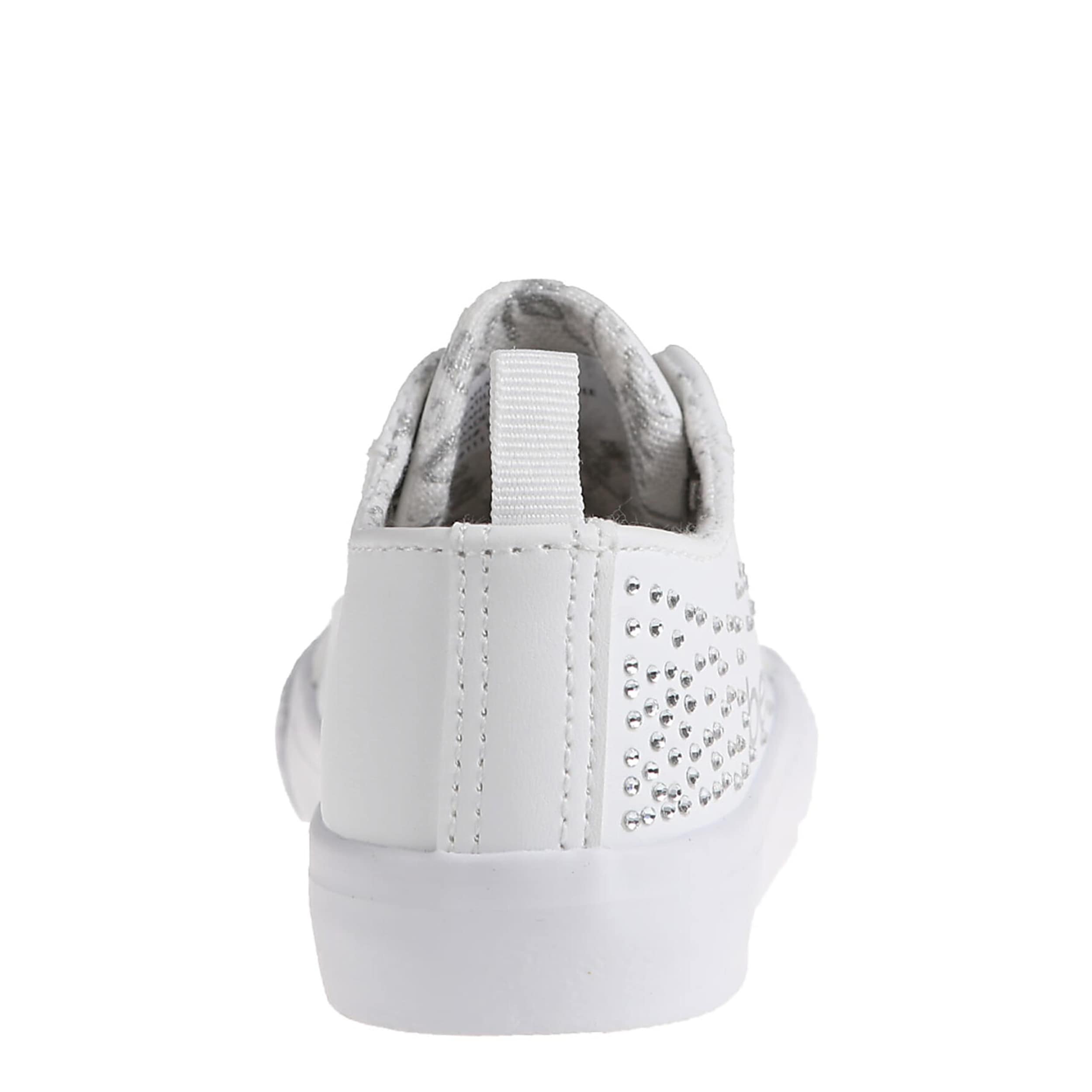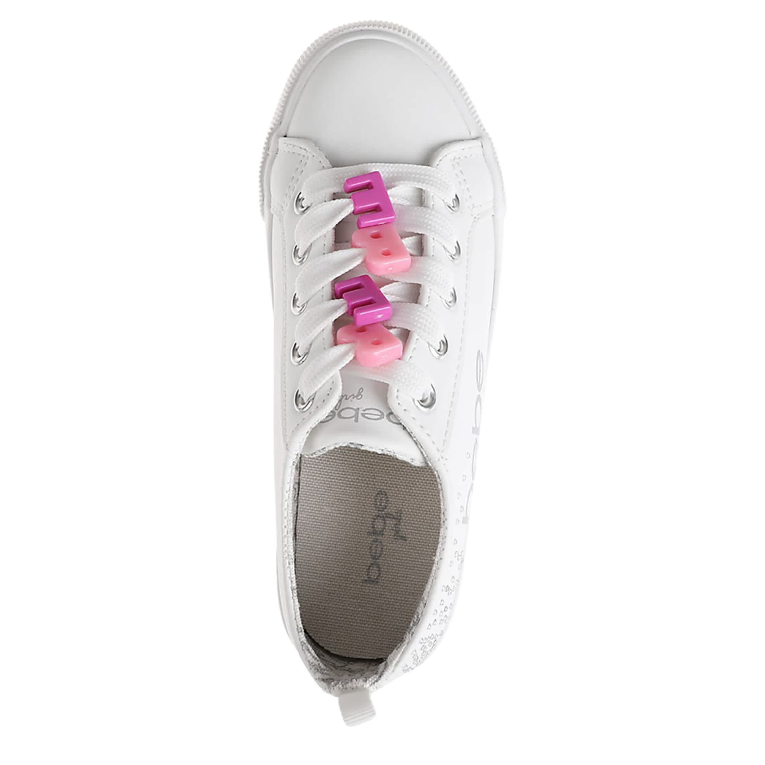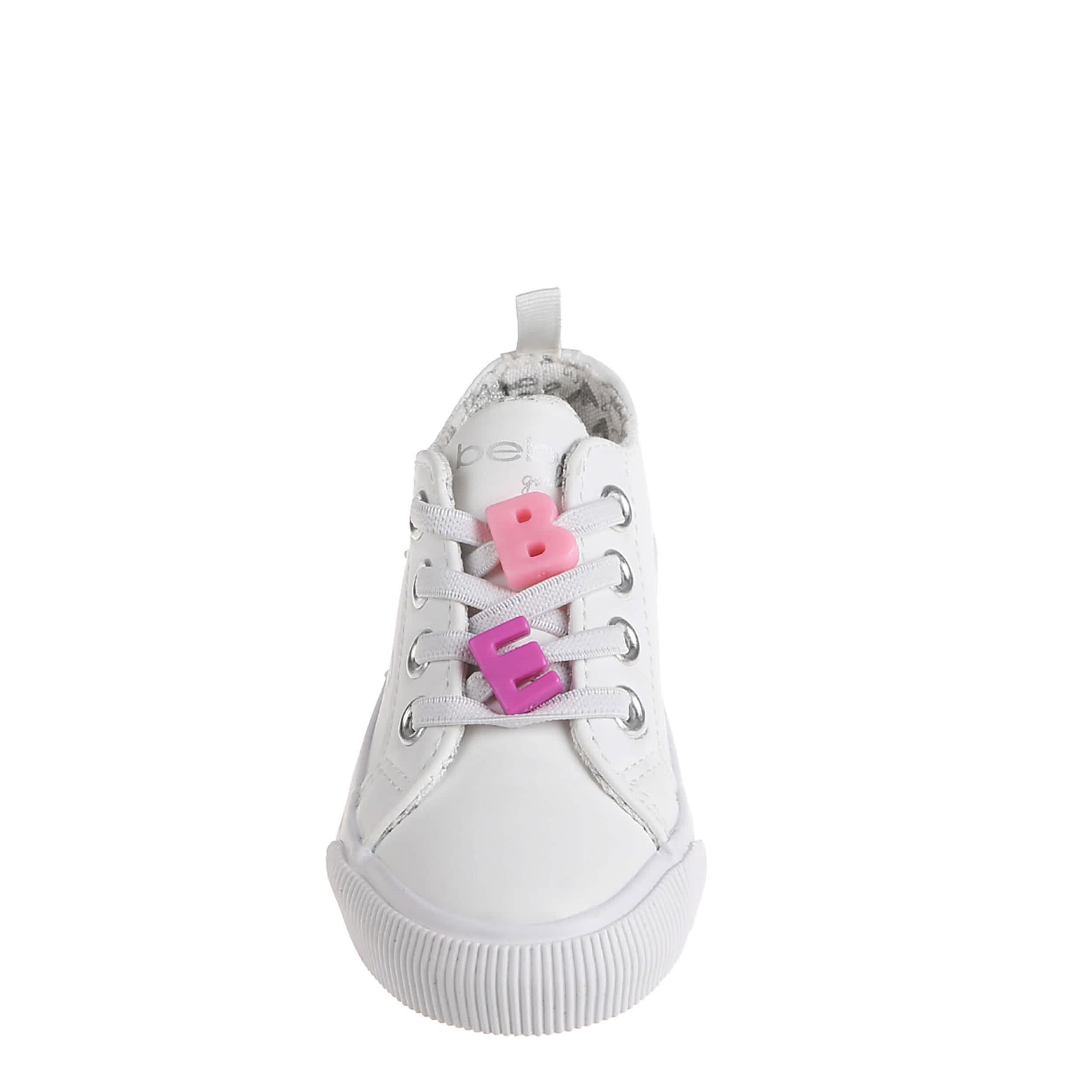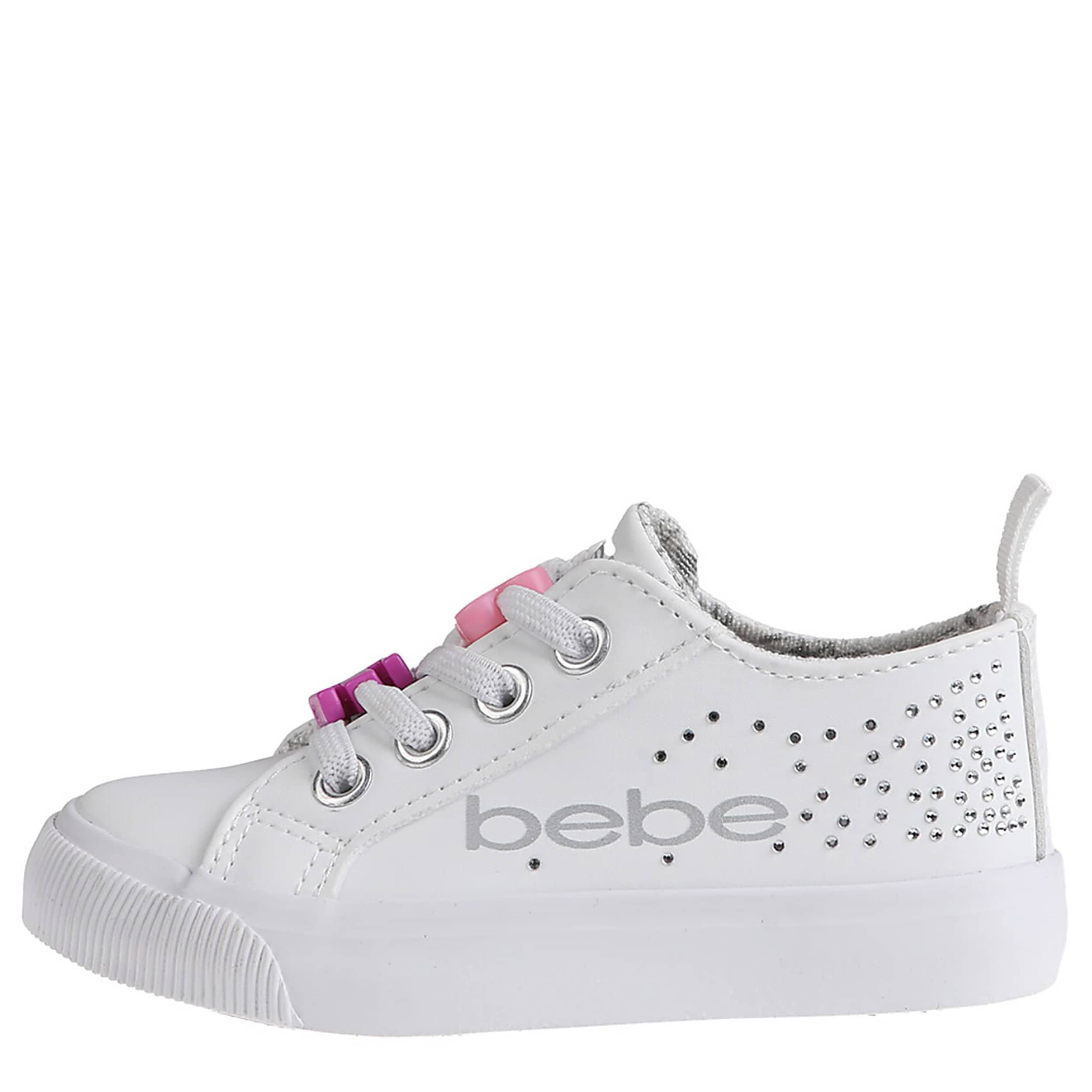 Add to her casual shoe collection with the bebe Toddler Girls' sneaker. This shoe, sporting a faux leather upper with beaded accents on the faux laces, has studded detailing on the sides for extra glam. The hele pull tab allows for easy entry, while the cushioned footbed and synthetic outsole ensure supported steps.