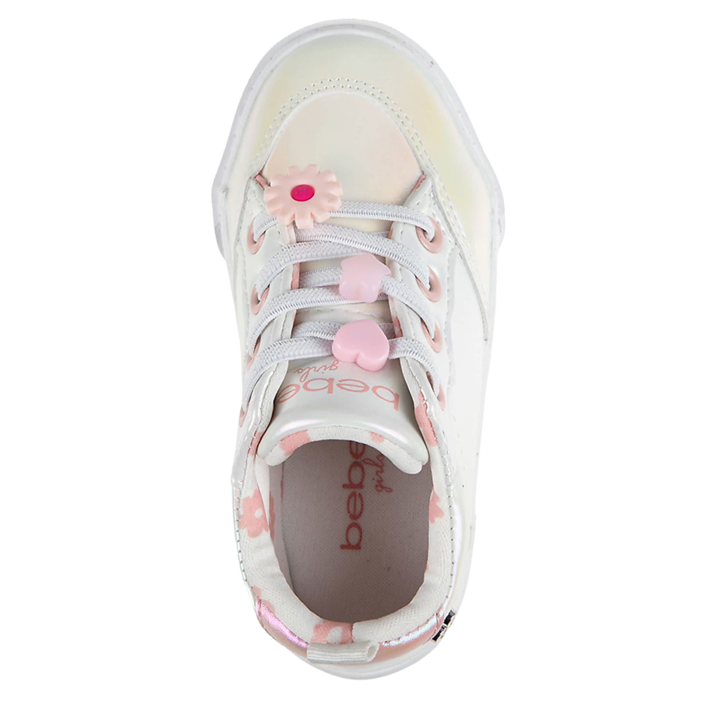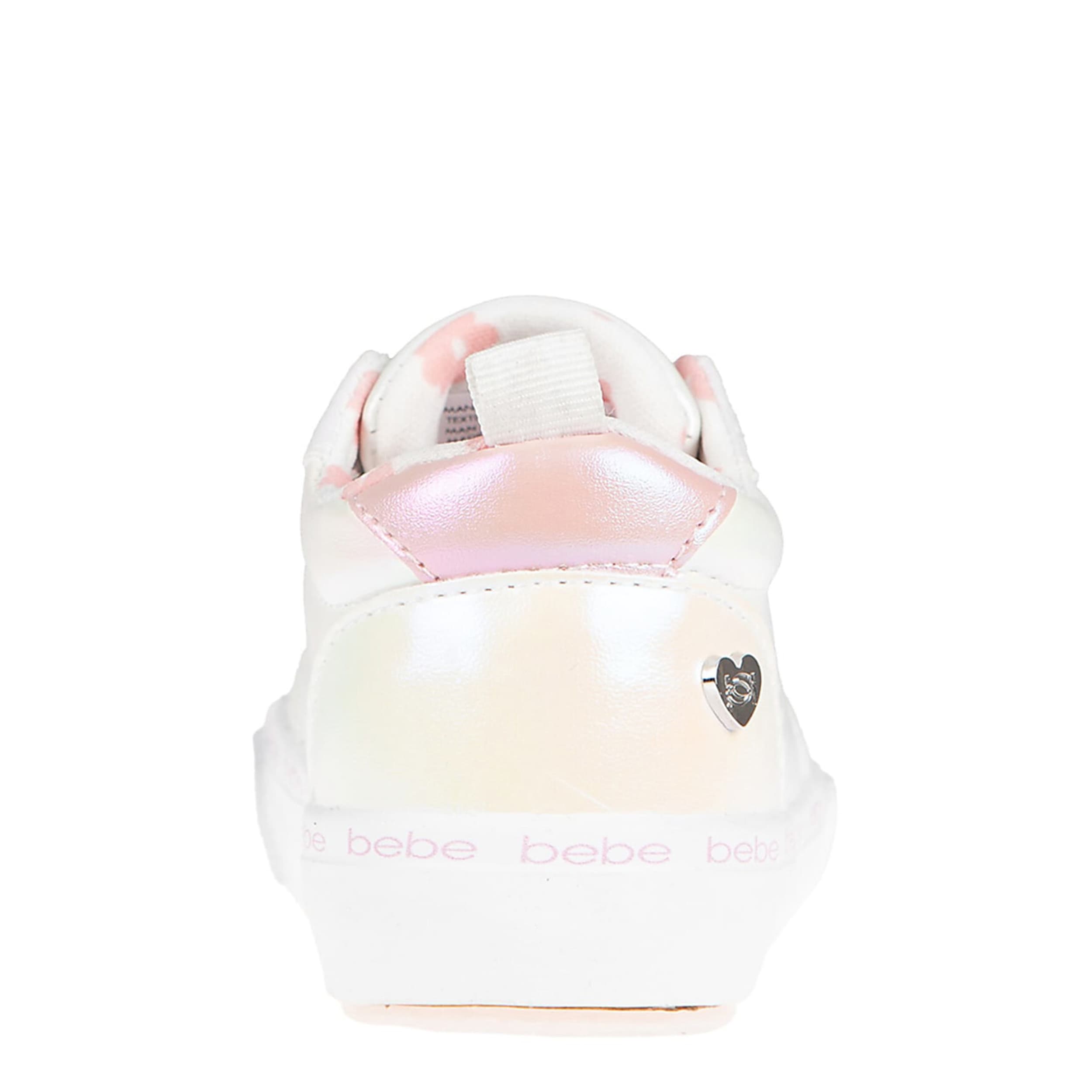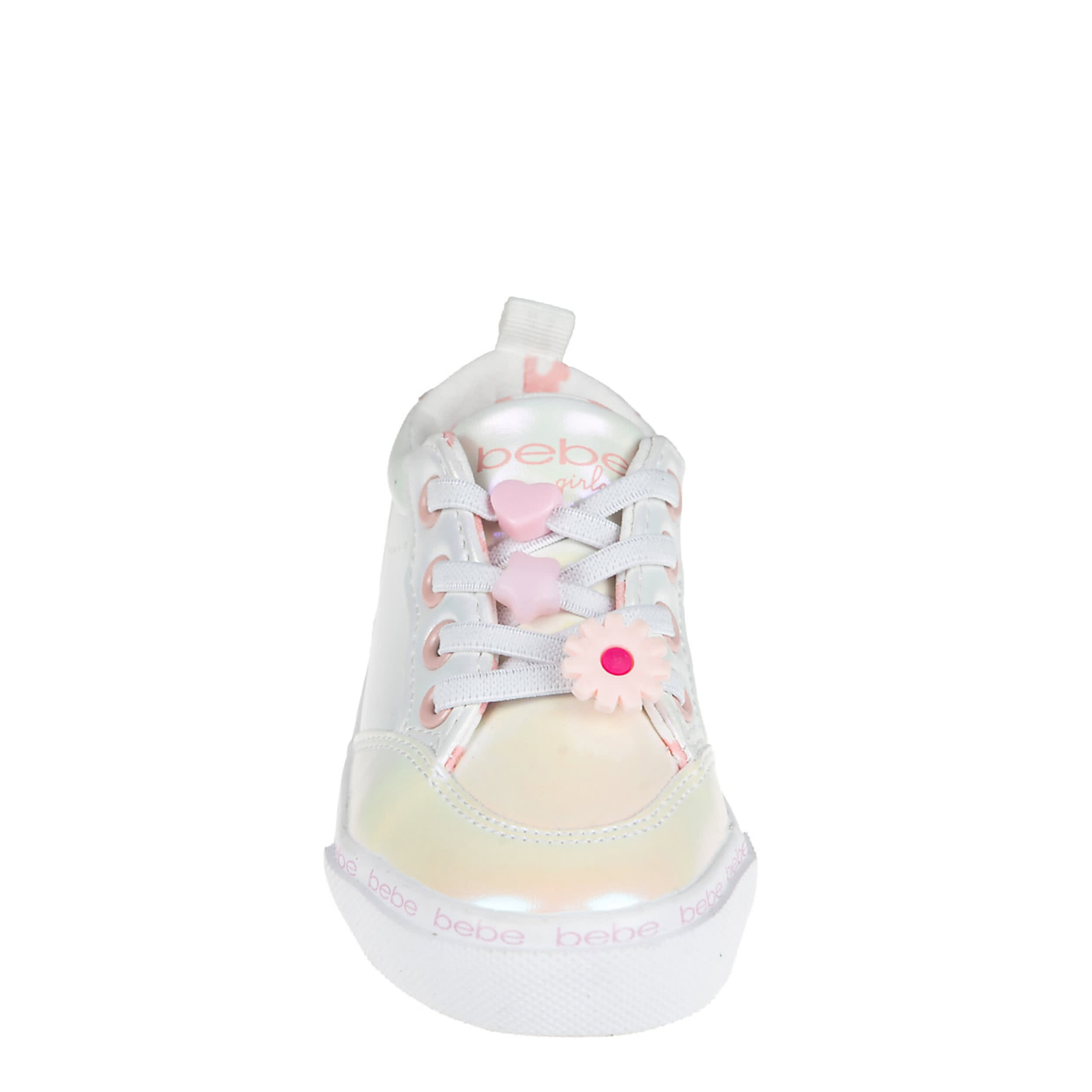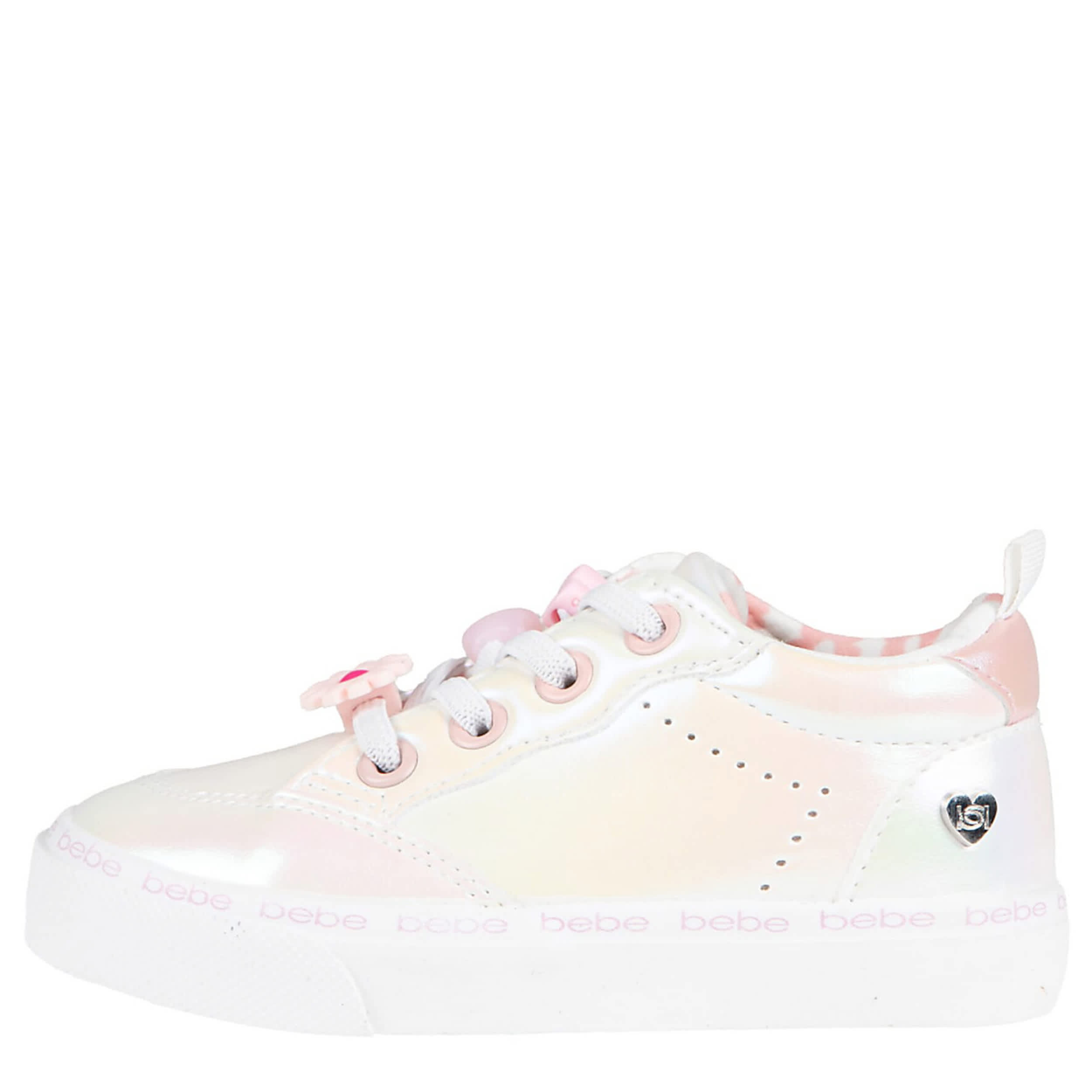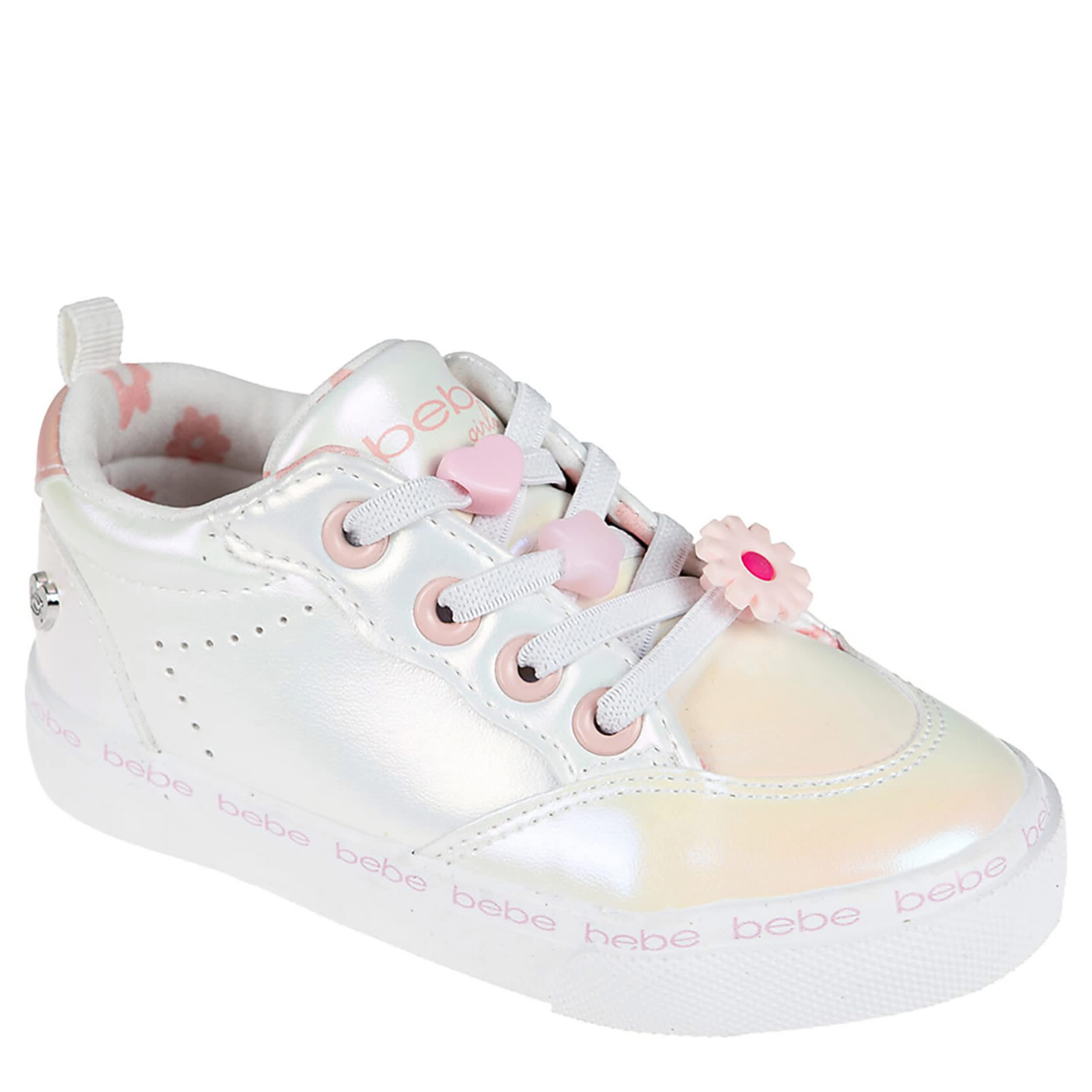 She'll show off her cute personality in the bebe infant girls' sneaker. With a pearlized faux leather upper featuring a logo chain on the midsole, this shoe also has charms on the laces for a fun touch. The soft footbed and durable outsole support her steps while she's on the move.