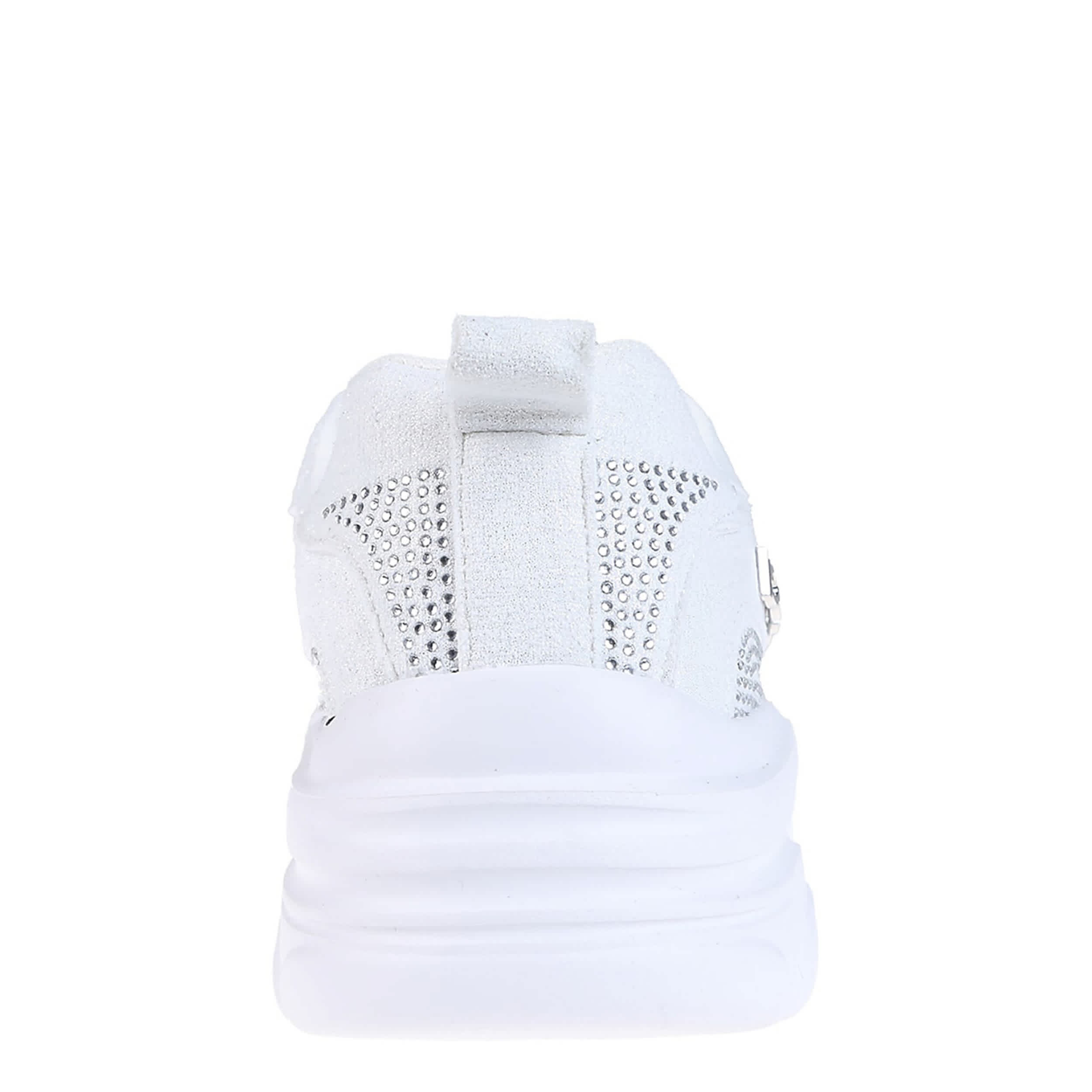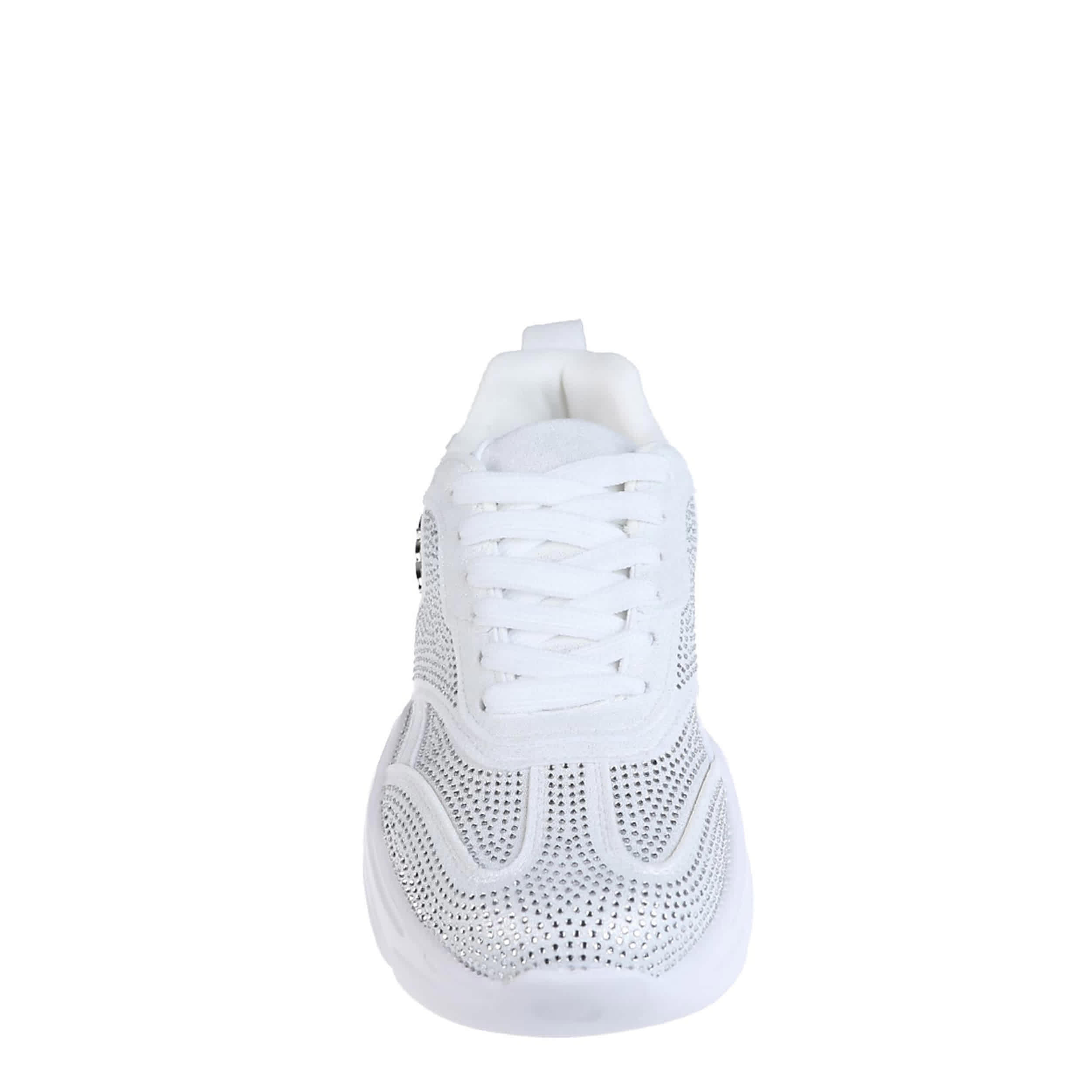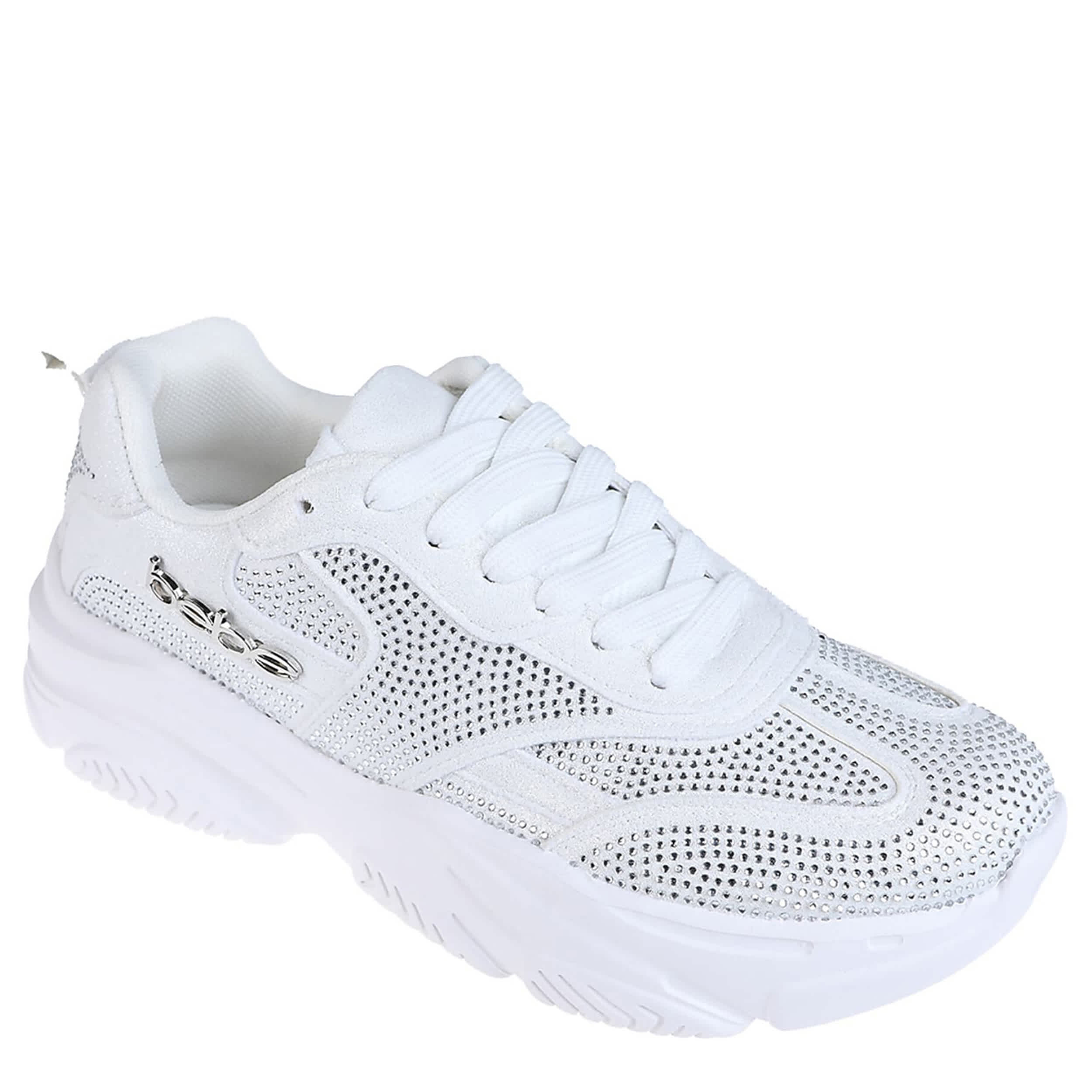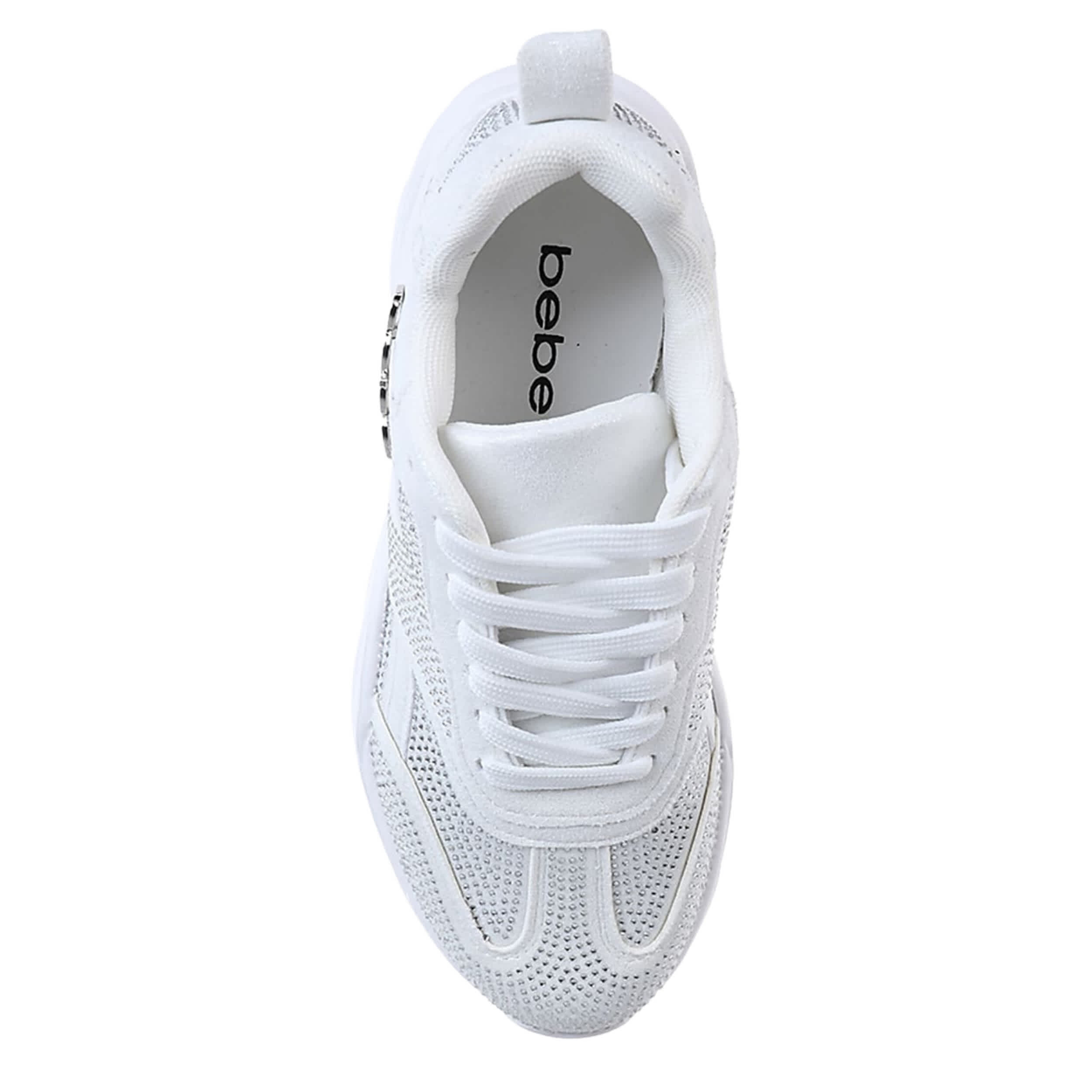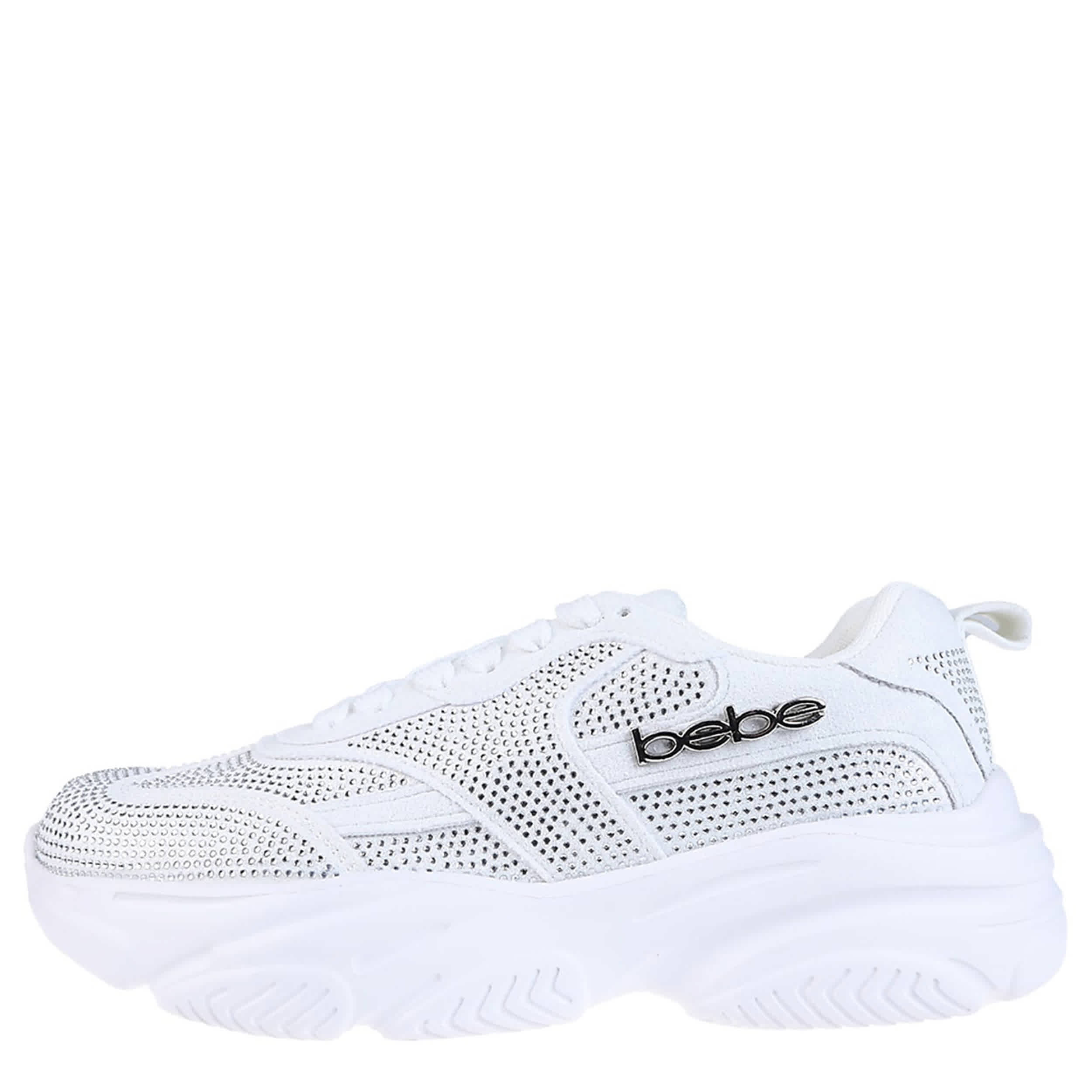 bebe Aimee Women's Sneaker – White Get the sporty retro look with the bebe Aimee sneaker. Featuring a faux leather upper adorned with rhinestone detailing and a “bebe" logo hardware detail, this shoe accents any outfit with its sparkly, timeless silhouette. The cushioned footbed offers all-day comfort, while the chunky outsole gives a trendy lift.