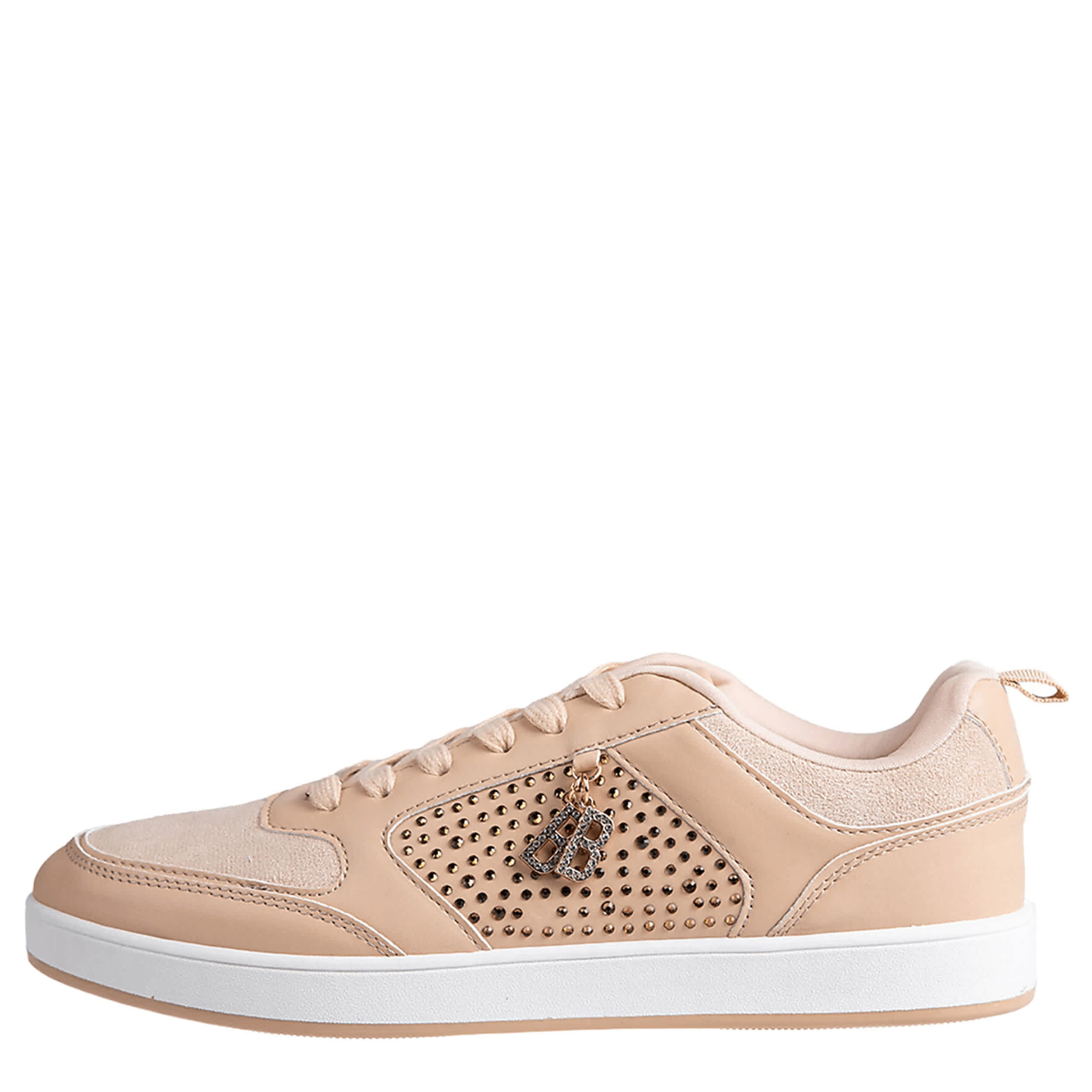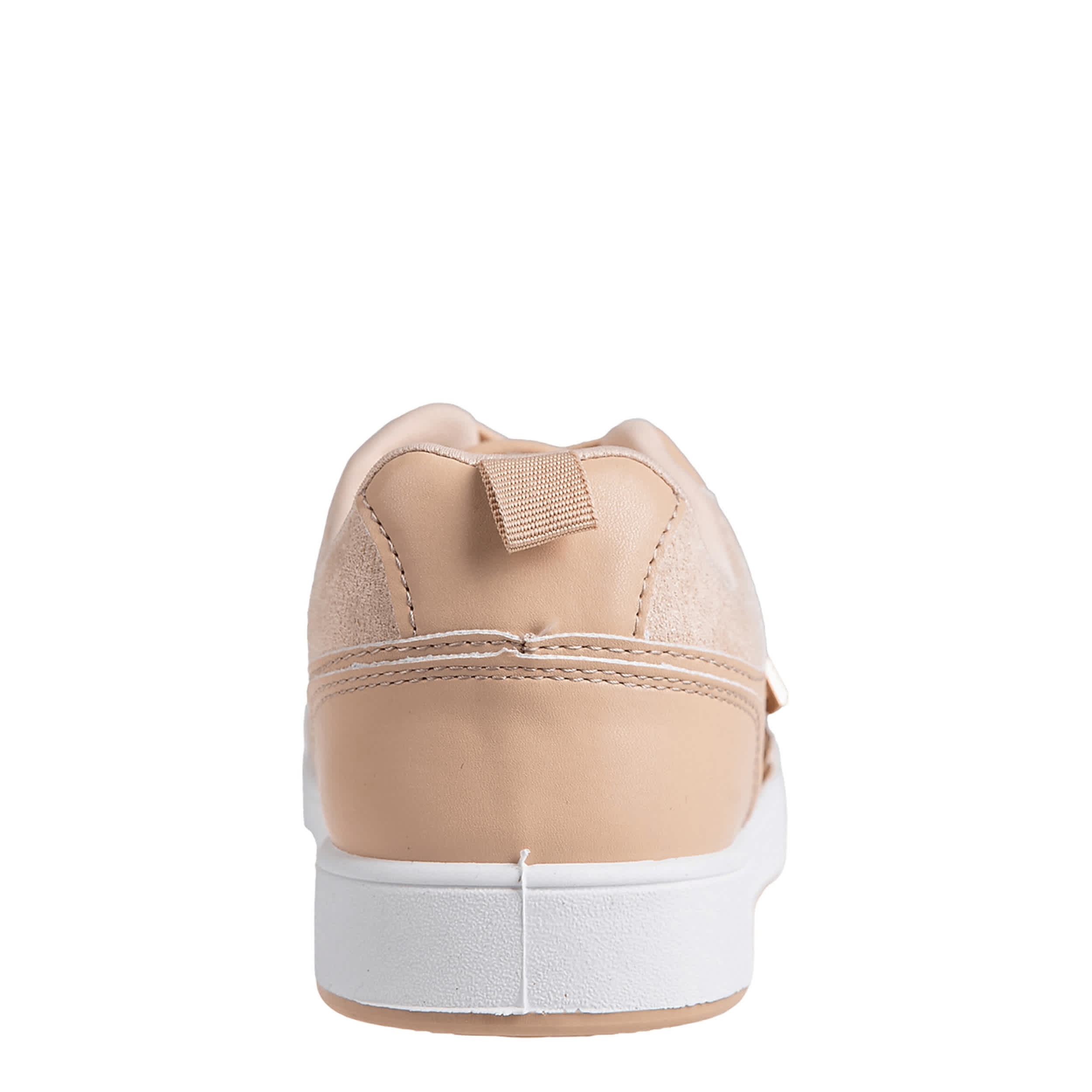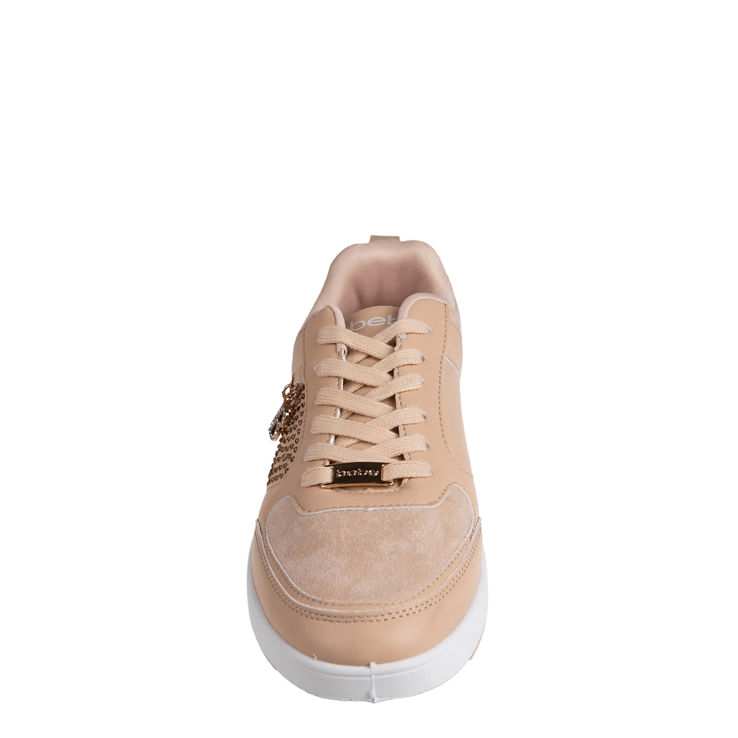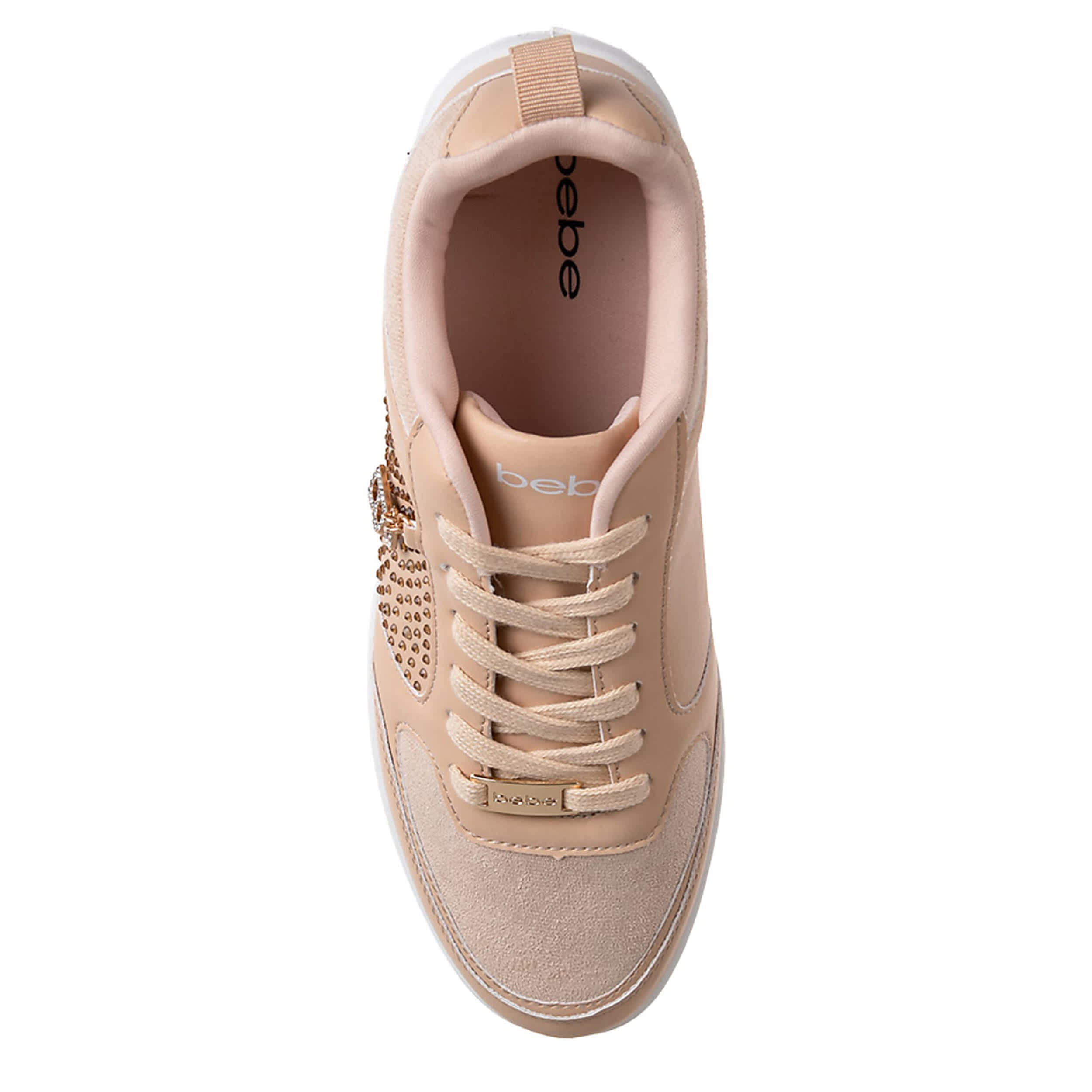 bebe Emma Women's Sneaker – Nude Highlight your casual outfits with the bebe Emma sneaker. Featuring a crisp faux leather upper with rhinestone side detailing, this shoe is perfect for adding a little glam to your everyday look. The cushioned footbed comforts your steps, while the synthetic outsole supports with traction.