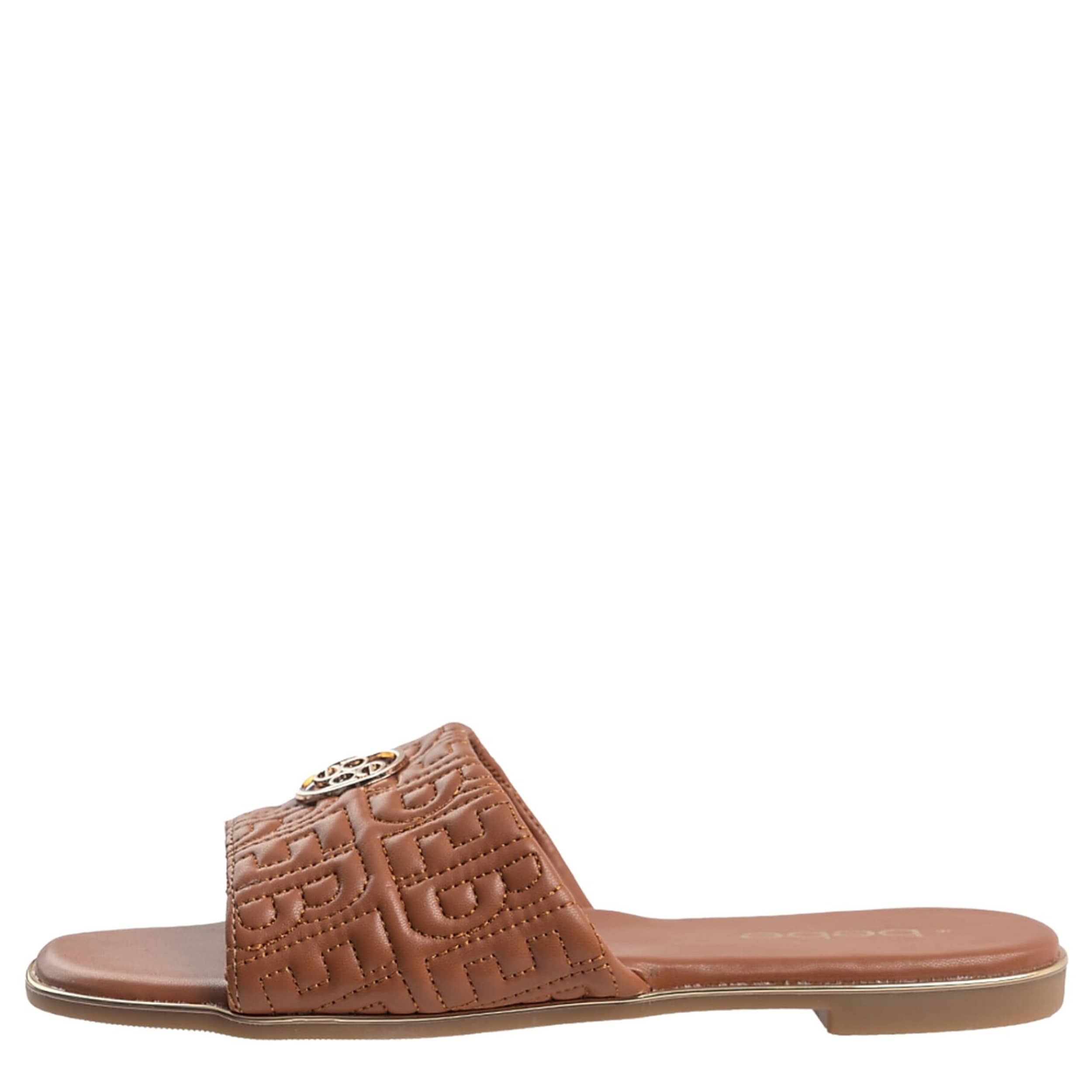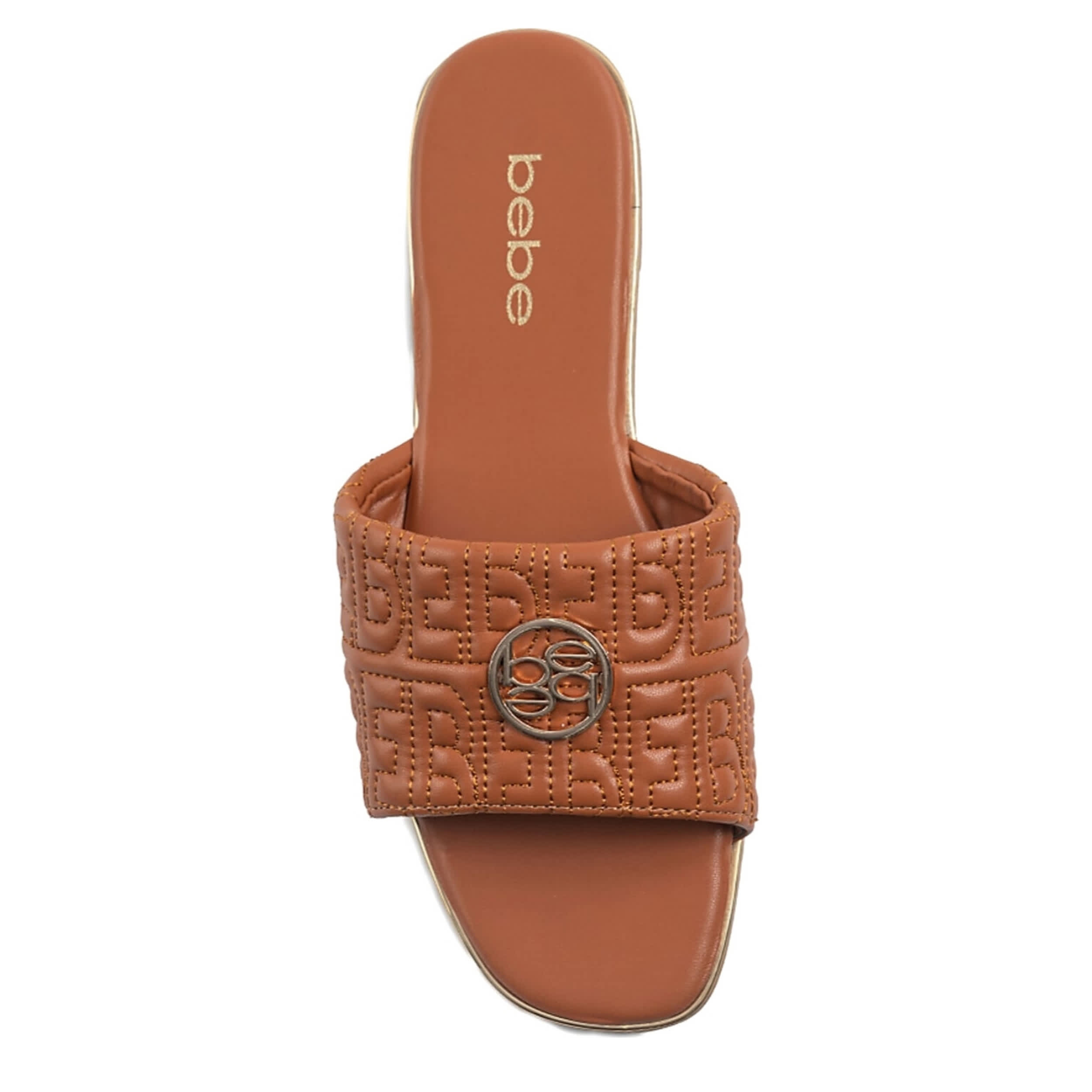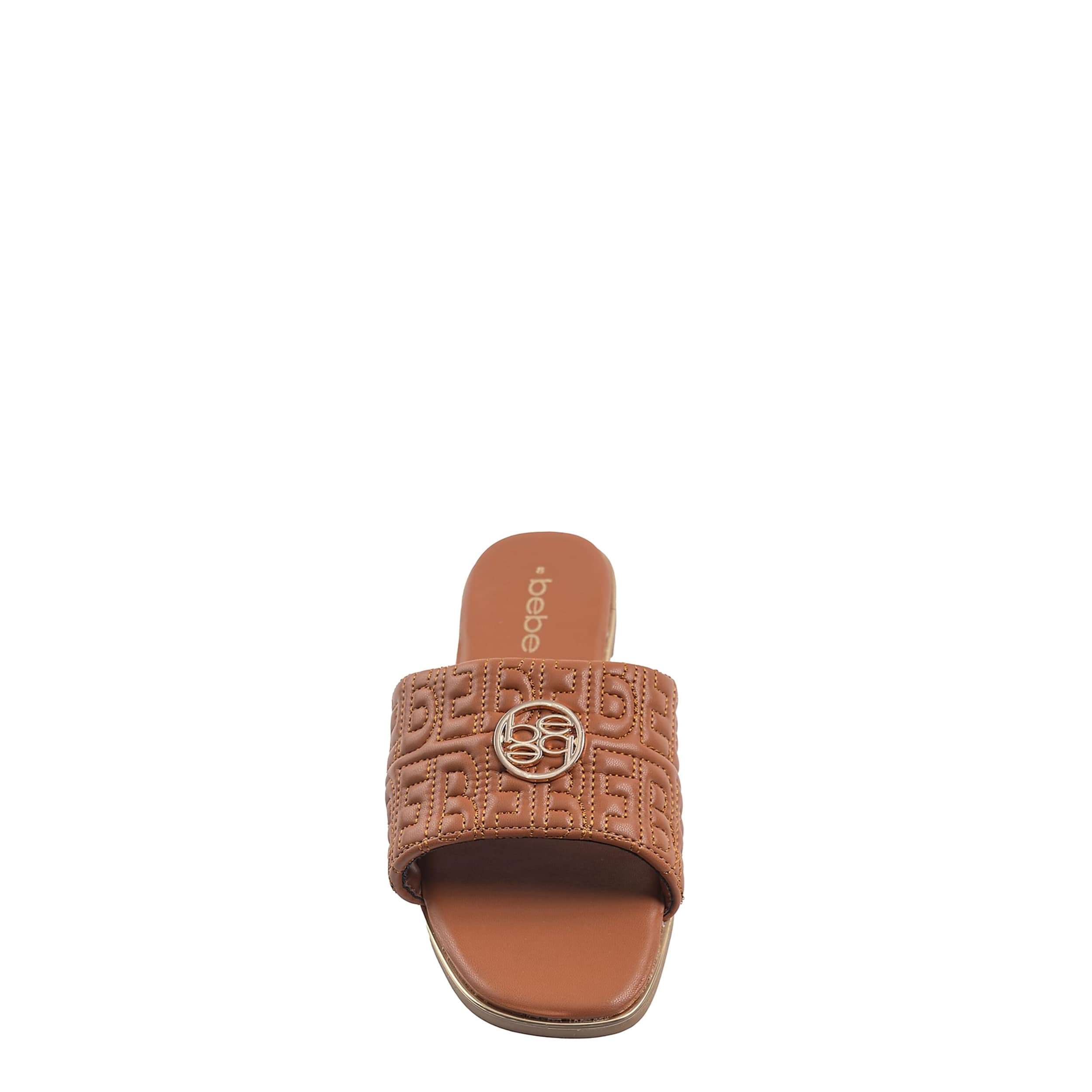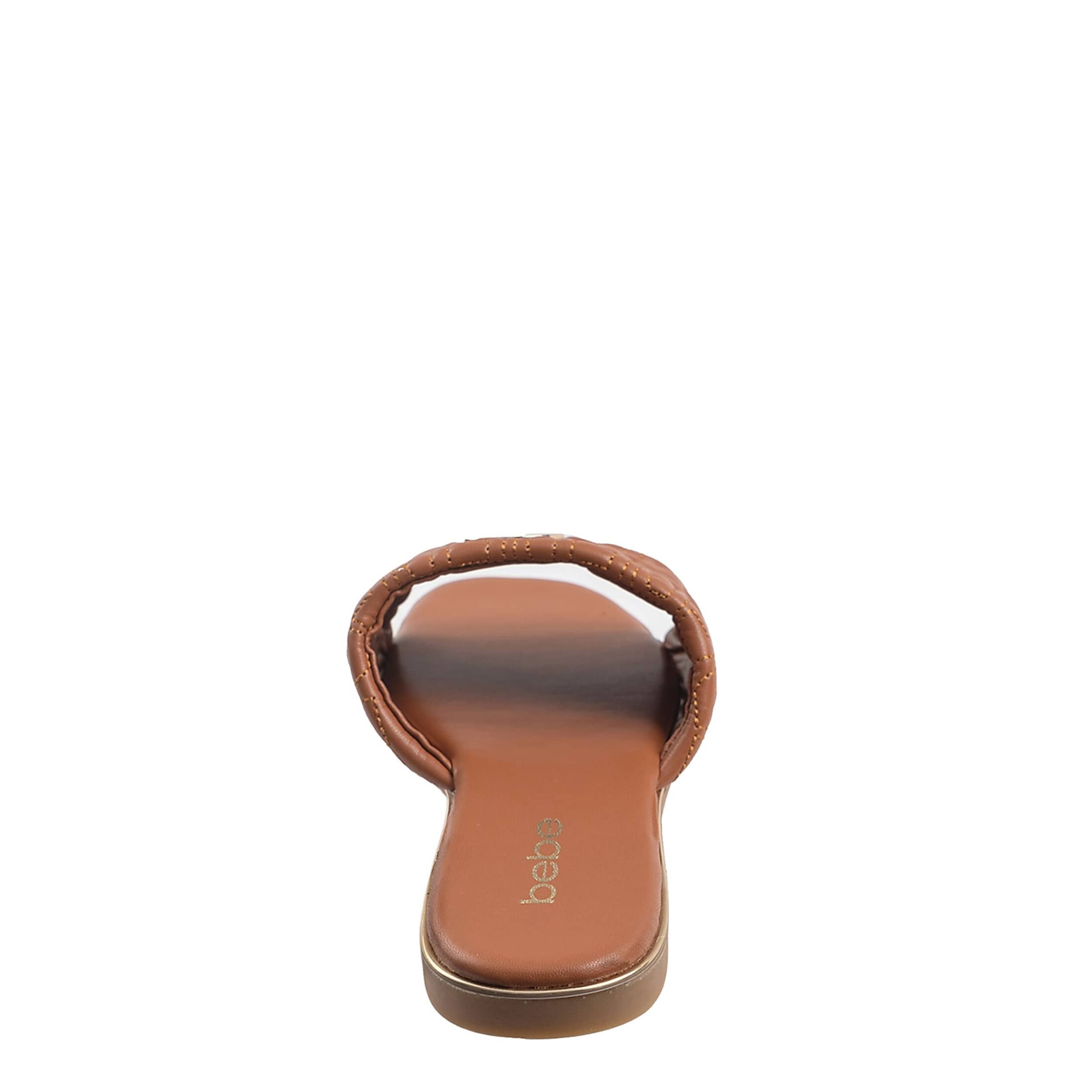 Refined style with the elegant bebe Felicity slide sandal. Featuring a stitched faux leather upper creating a quilted "BEBE" logo print alongside the medallion logo, this slide is perfect for going out on a warm summer night. The insole soothes your foot, while the durable outsole supports with textured traction.