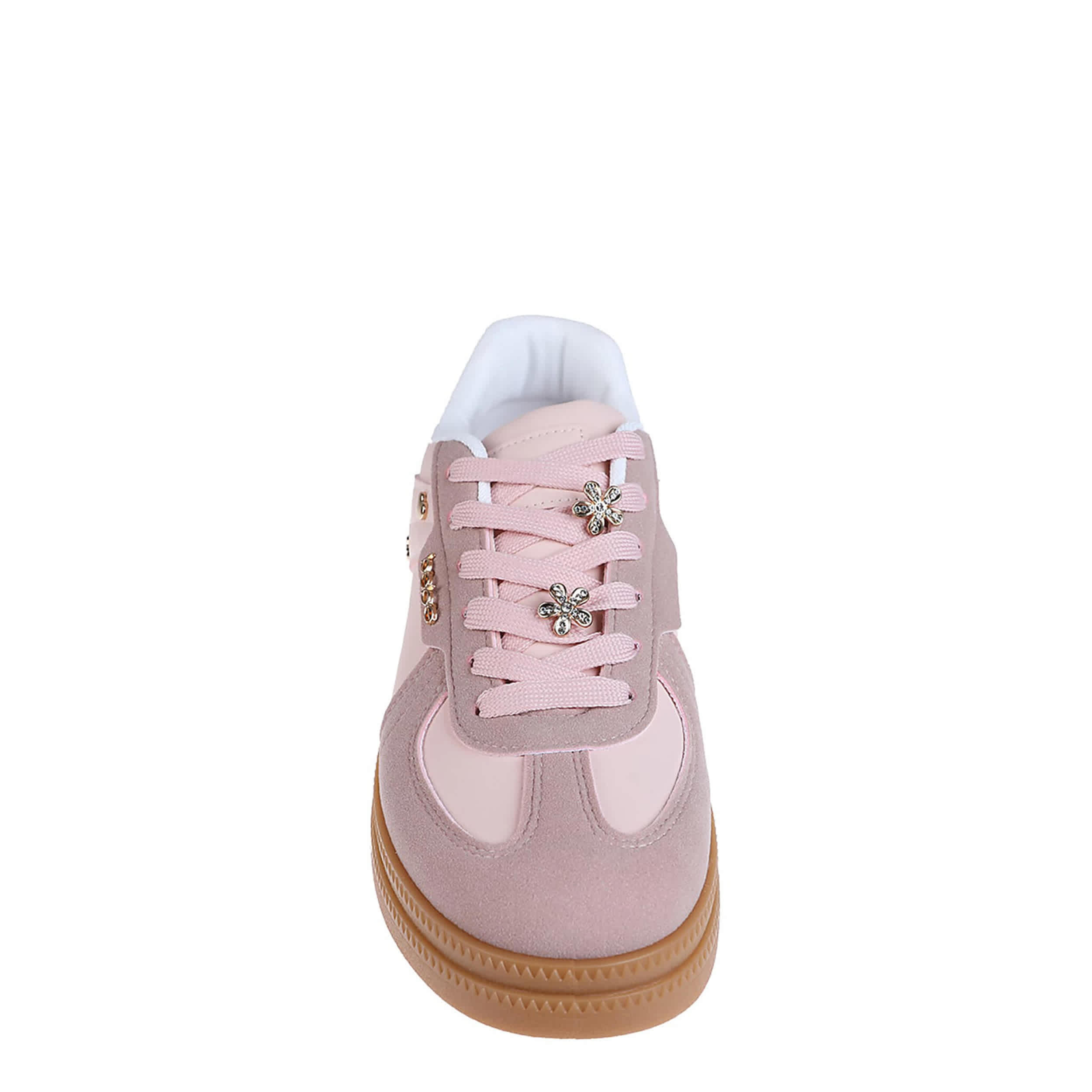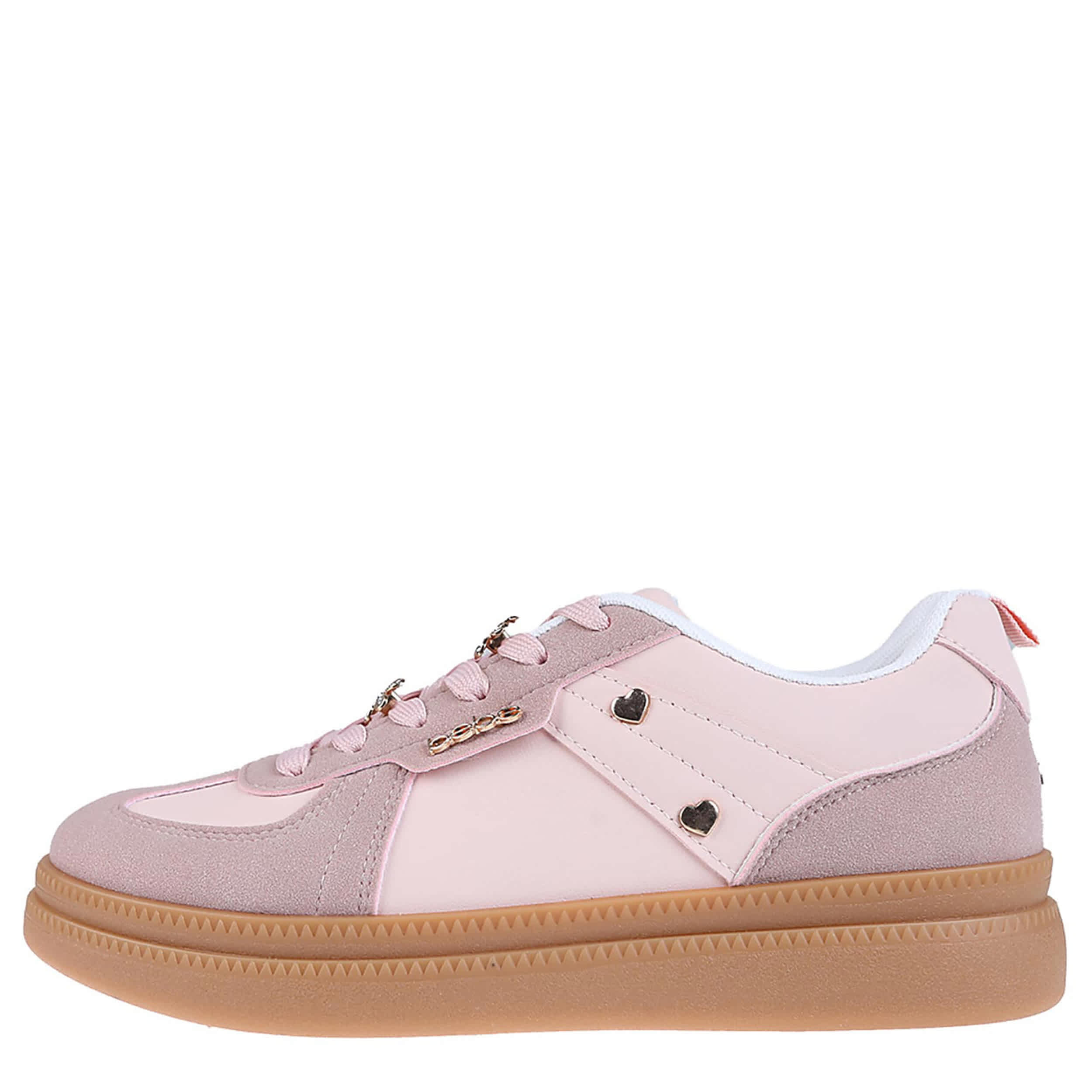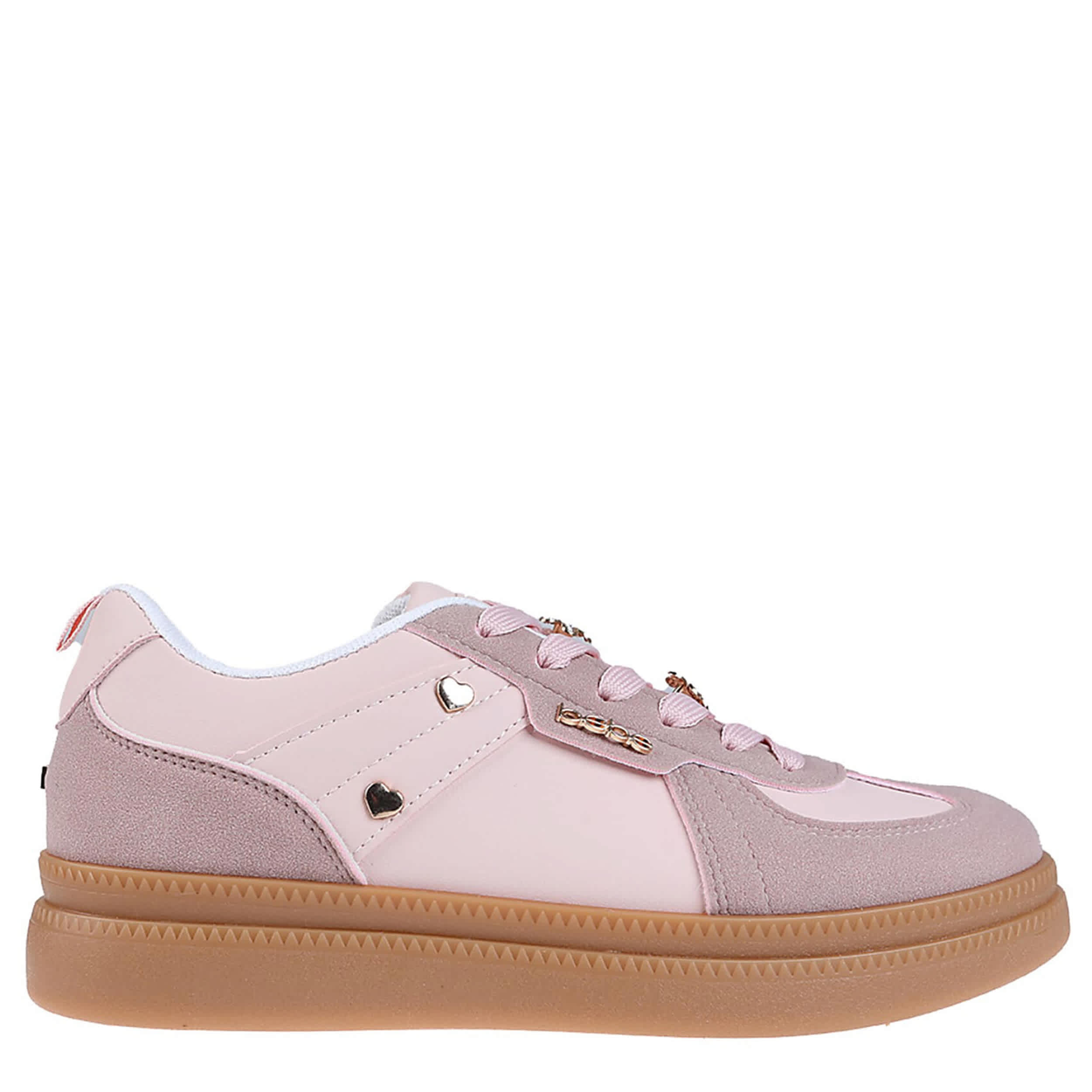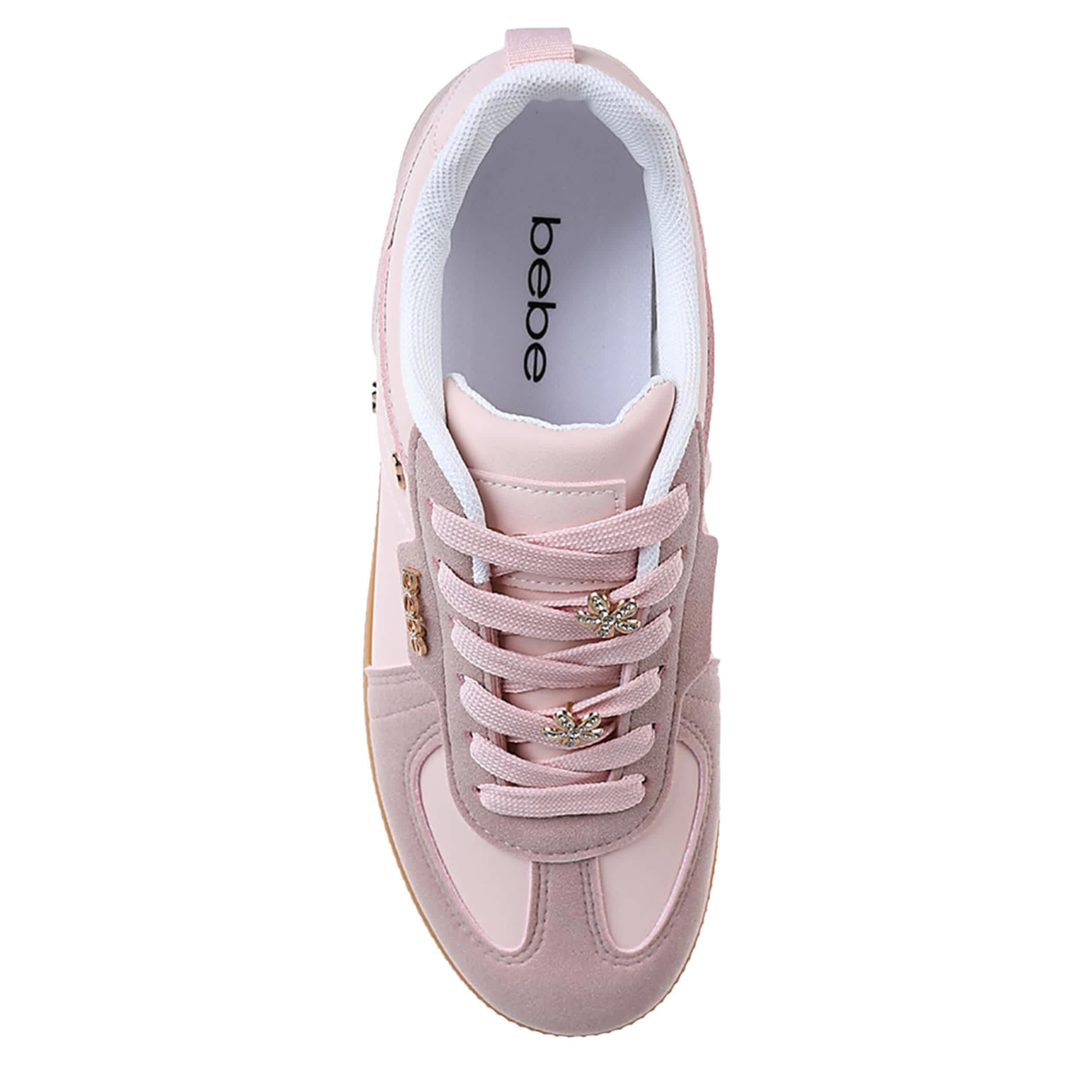 bebe Heidi Women's Sneaker – Blush The Heidi sneaker is the perfect girly sneaker to add to your closet. Featuring a color-blocked faux leather upper with cute lace charms and metal heart accents, this shoe exudes charm and daintiness. The cushioned footbed comforts your steps, while the platform gum sole offers traction.