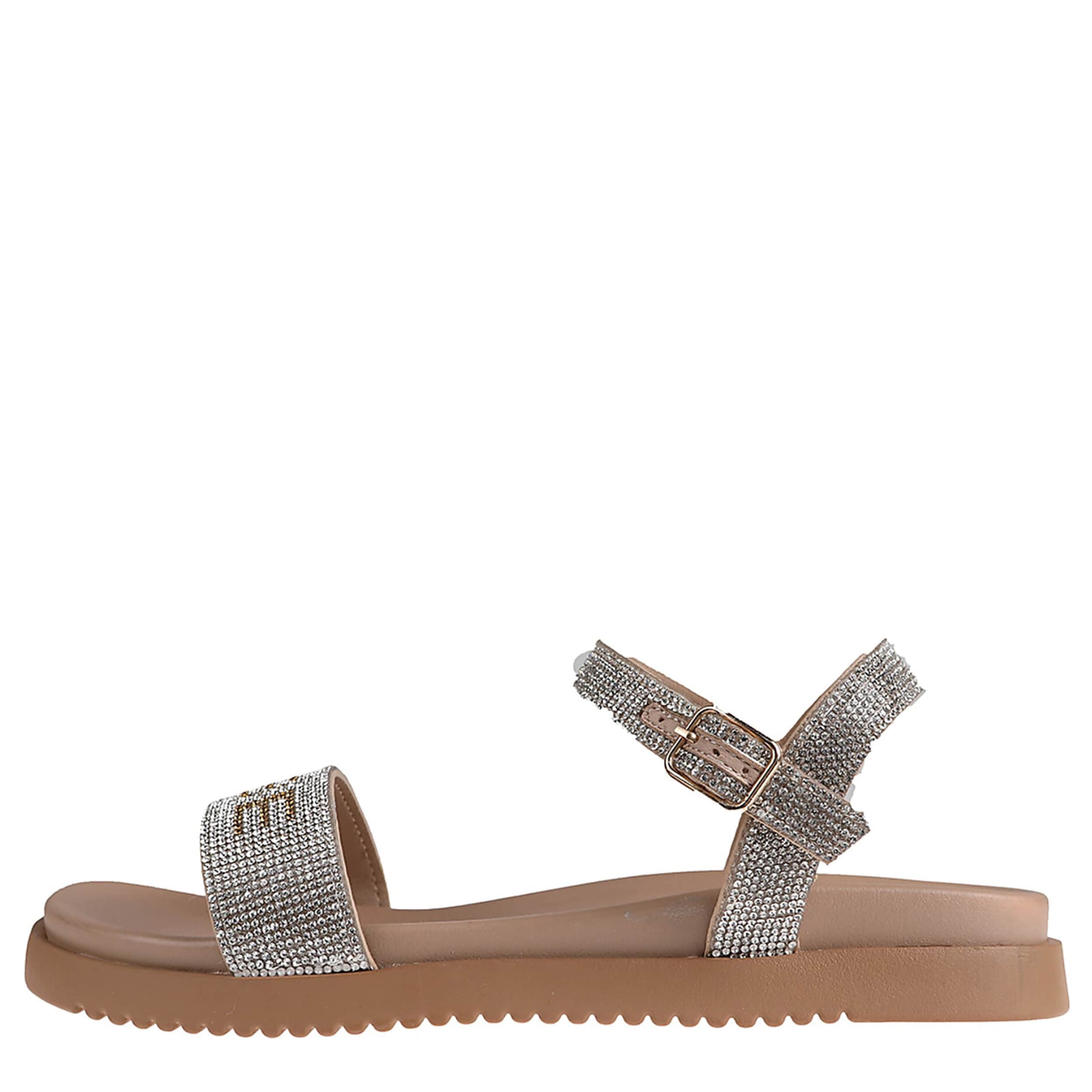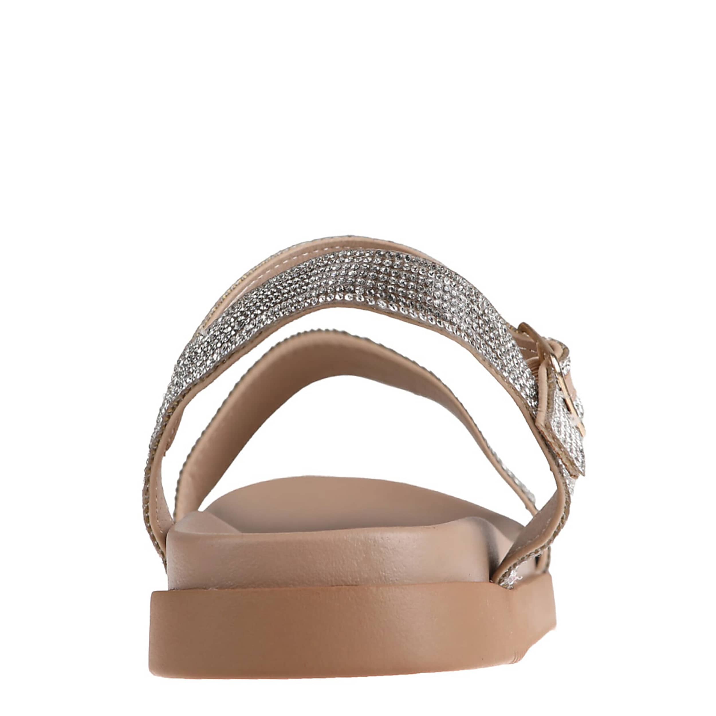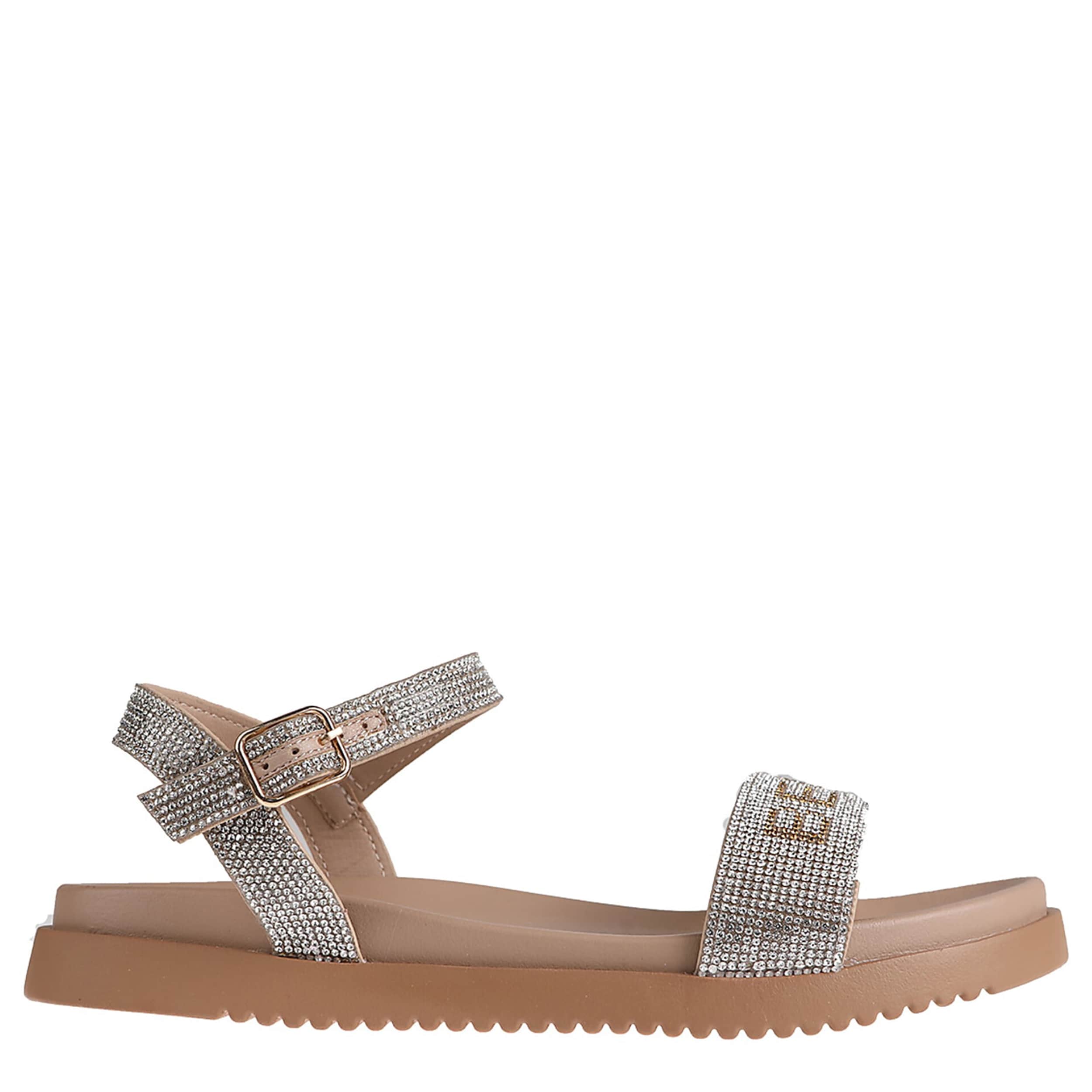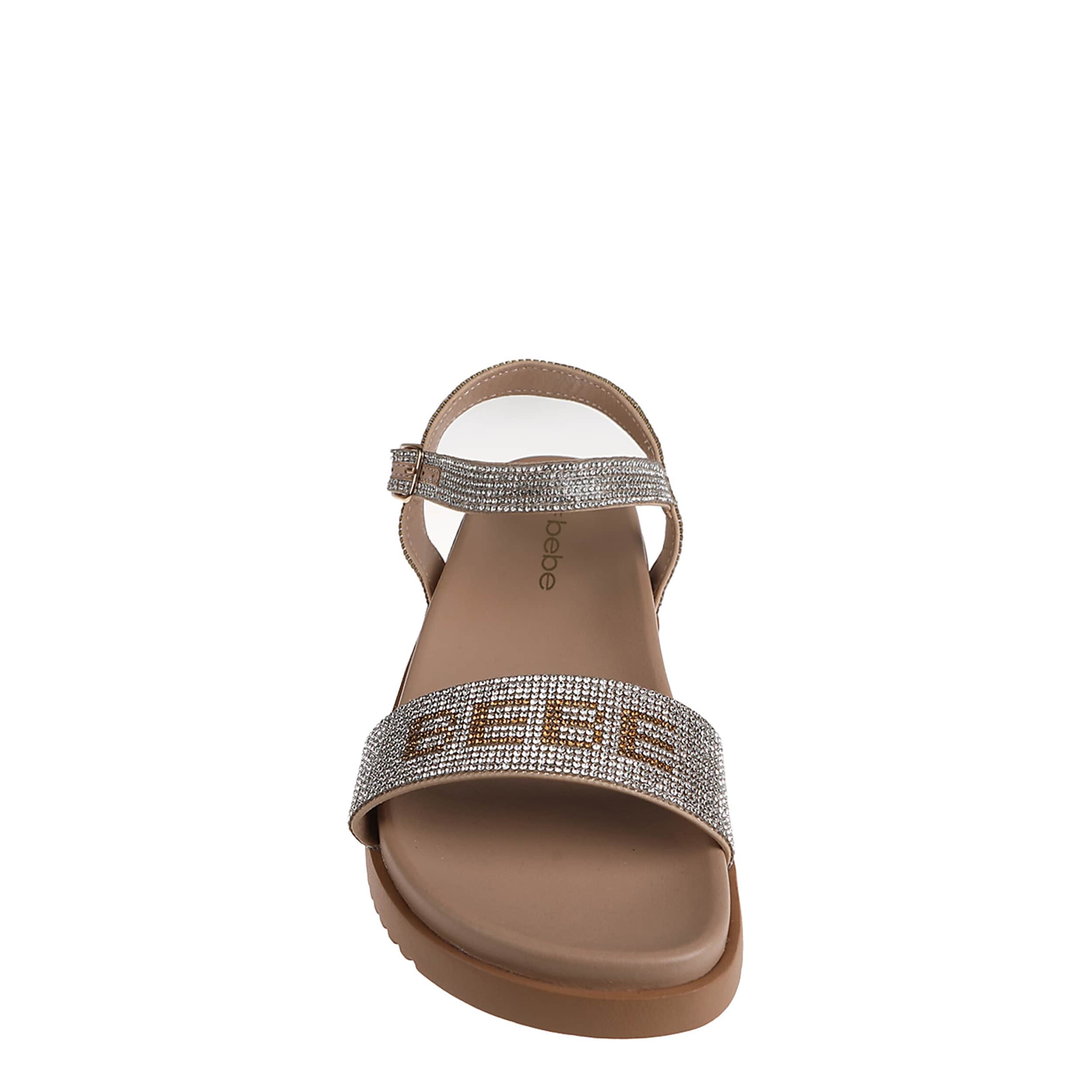 Let your style sparkle with the bebe Kelly sandal. With faux leather upper, this shoe has a chic rhinestone detail that's sure to turn heads. The padded insole cradles your foot, while the durable outsole offers some traction.