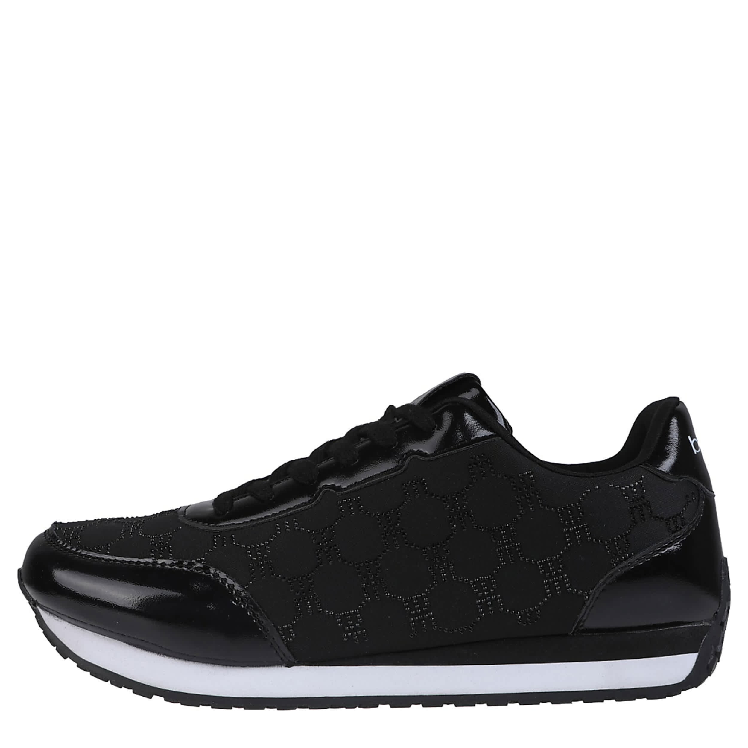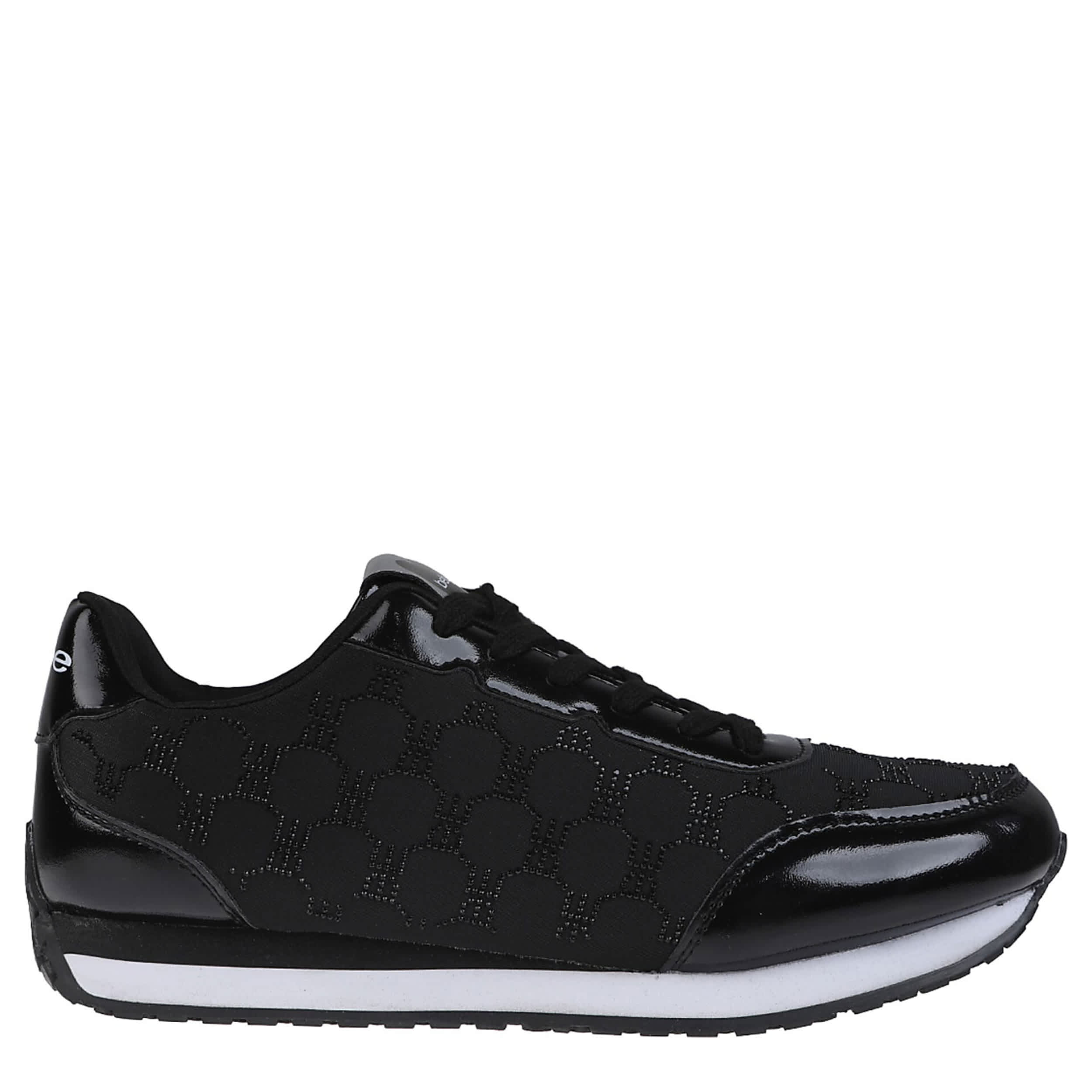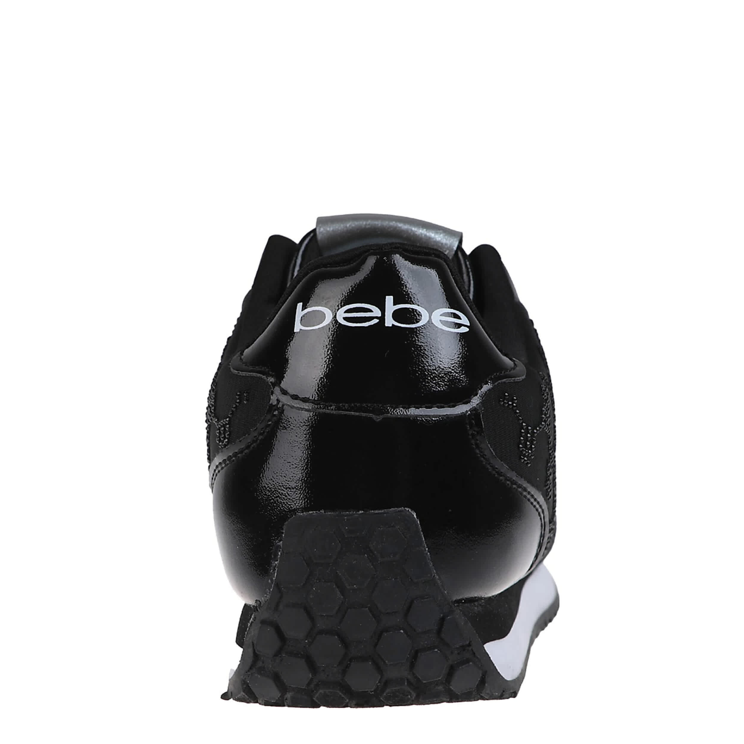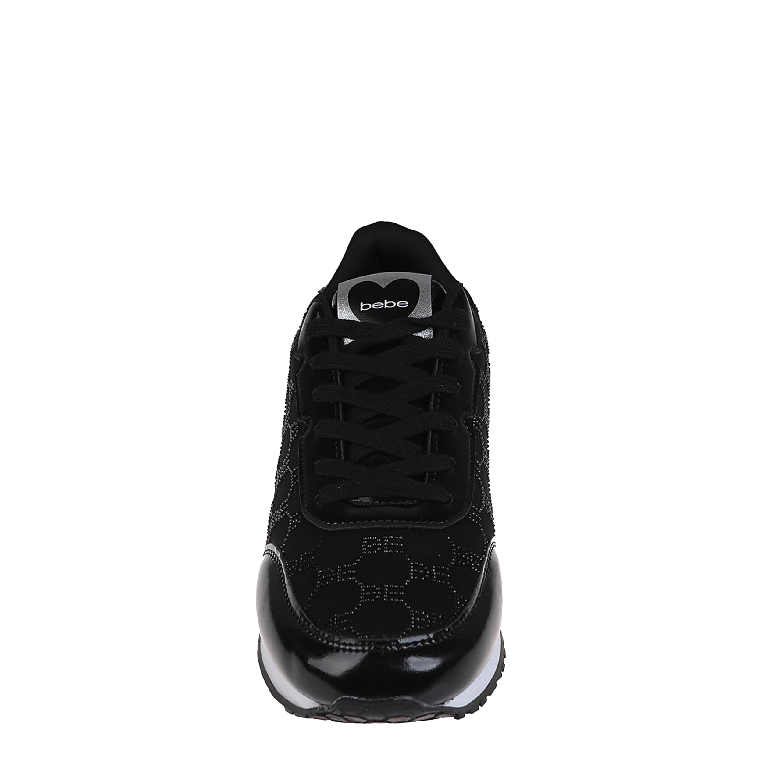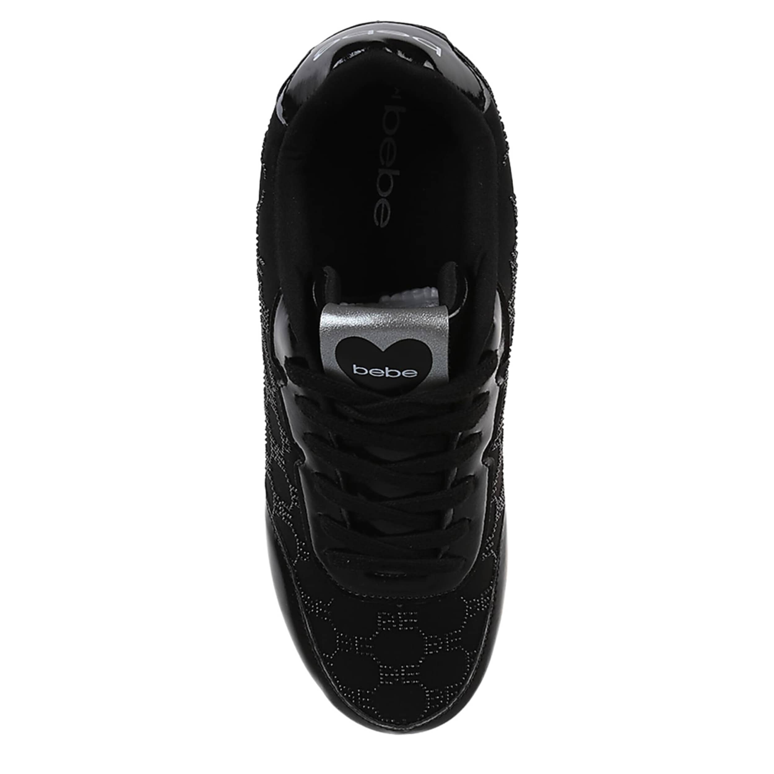 bebe Polly Women's Sneaker – Black Switch up your everyday look with the bebe Polly sneaker. This shoe exudes sporty elegance with a sleek faux leather upper and allover symmetrical print. The cushioned footbed comforts your steps, while the tread pattern outsole offers enhanced traction.