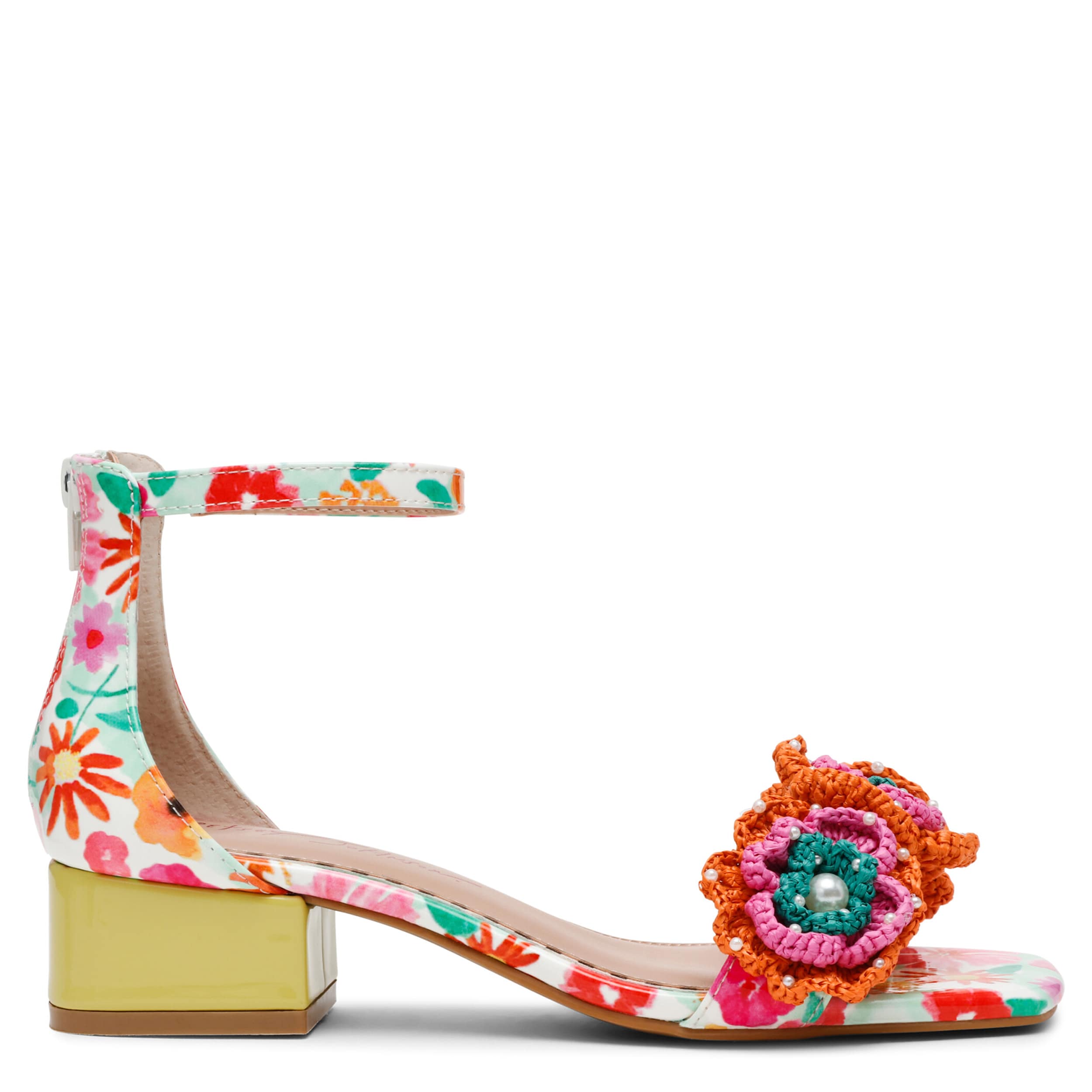 Freshen up your summer closet with the Betsey Johnson Brandee sandal. The faux leather upper is adorned with lively macrame flower accents for a chic touch. Enjoy all-day comfort with the synthetic footbed, while the back zipper closure ensures easy entry. For any casual or dressy outfit, the block heel offers the perfect lift.