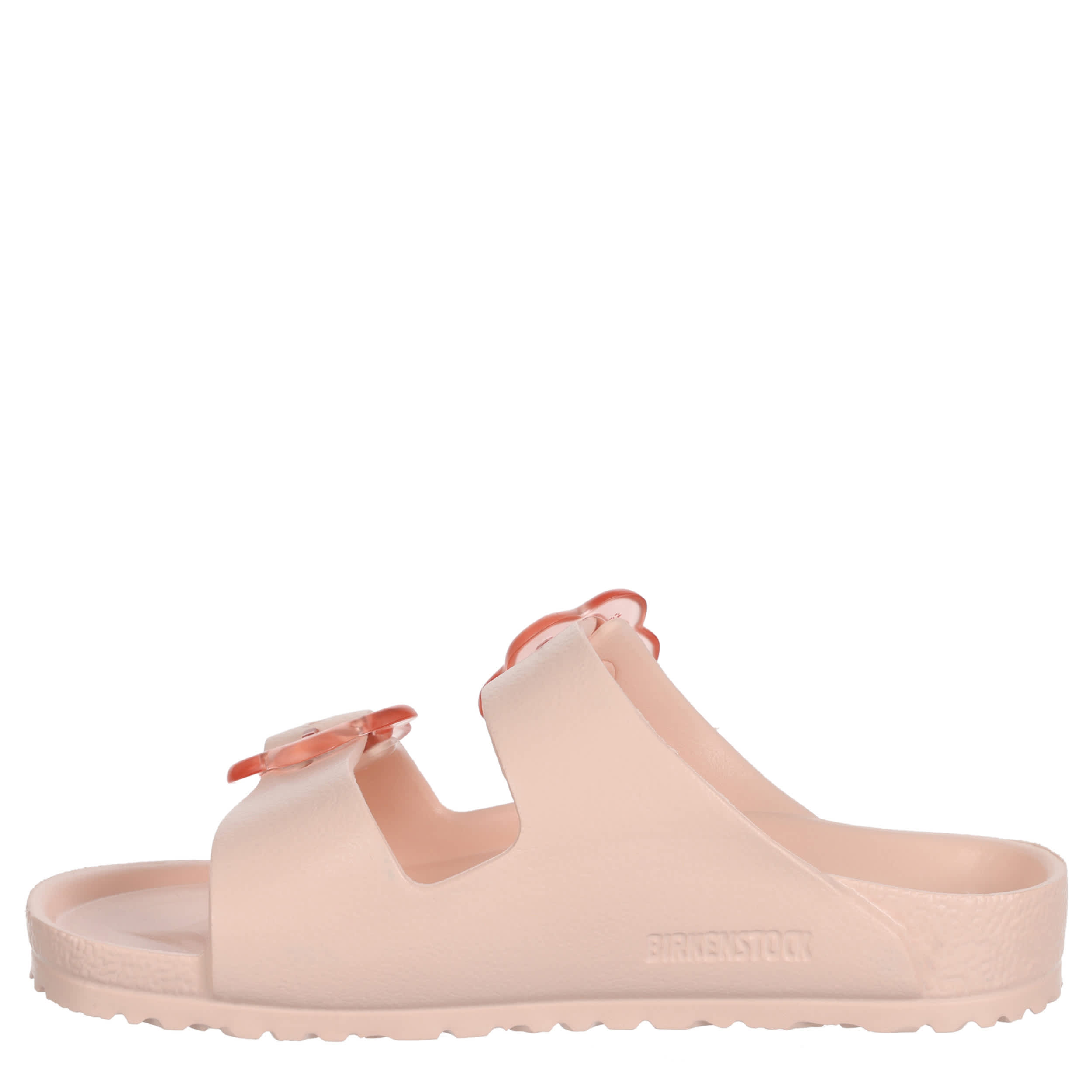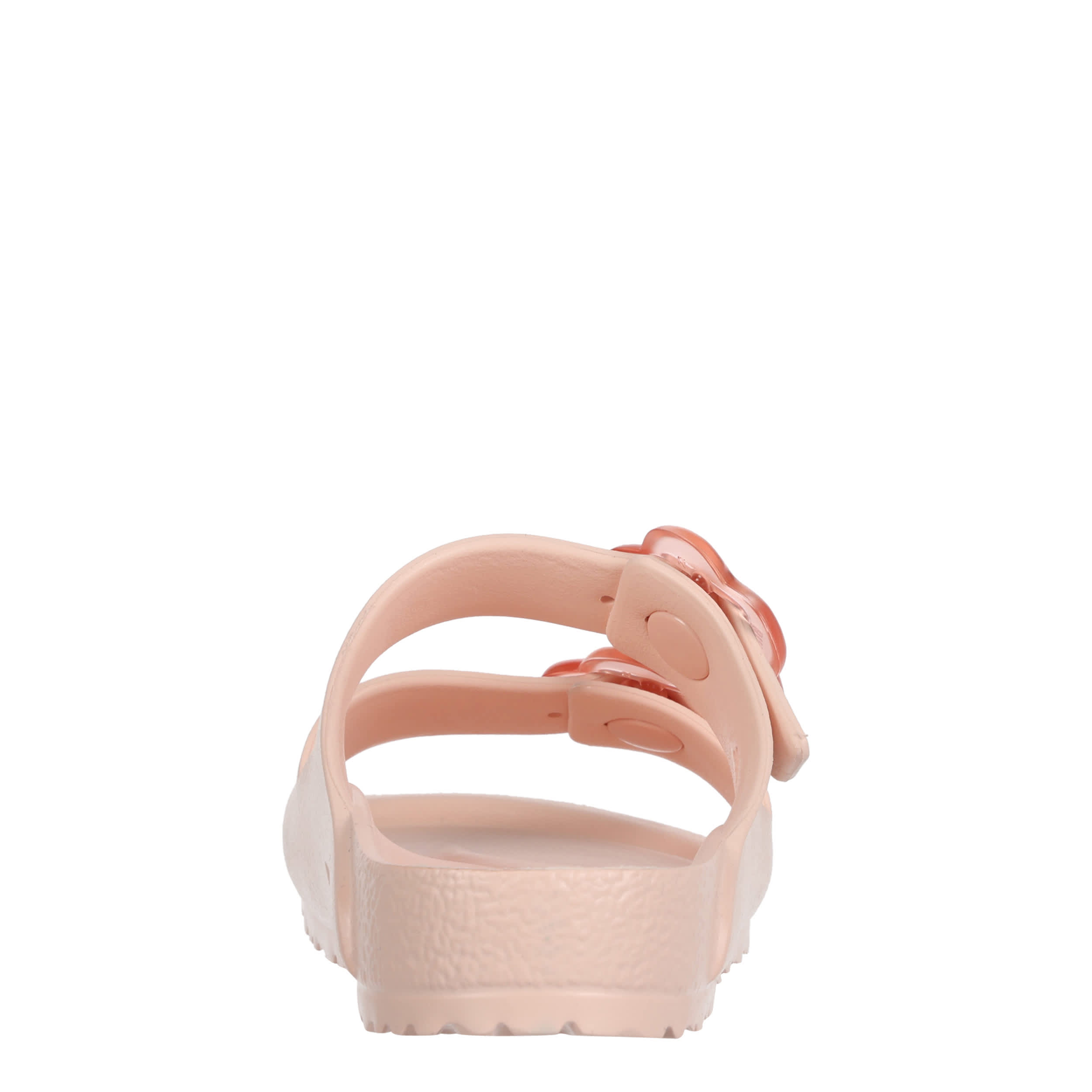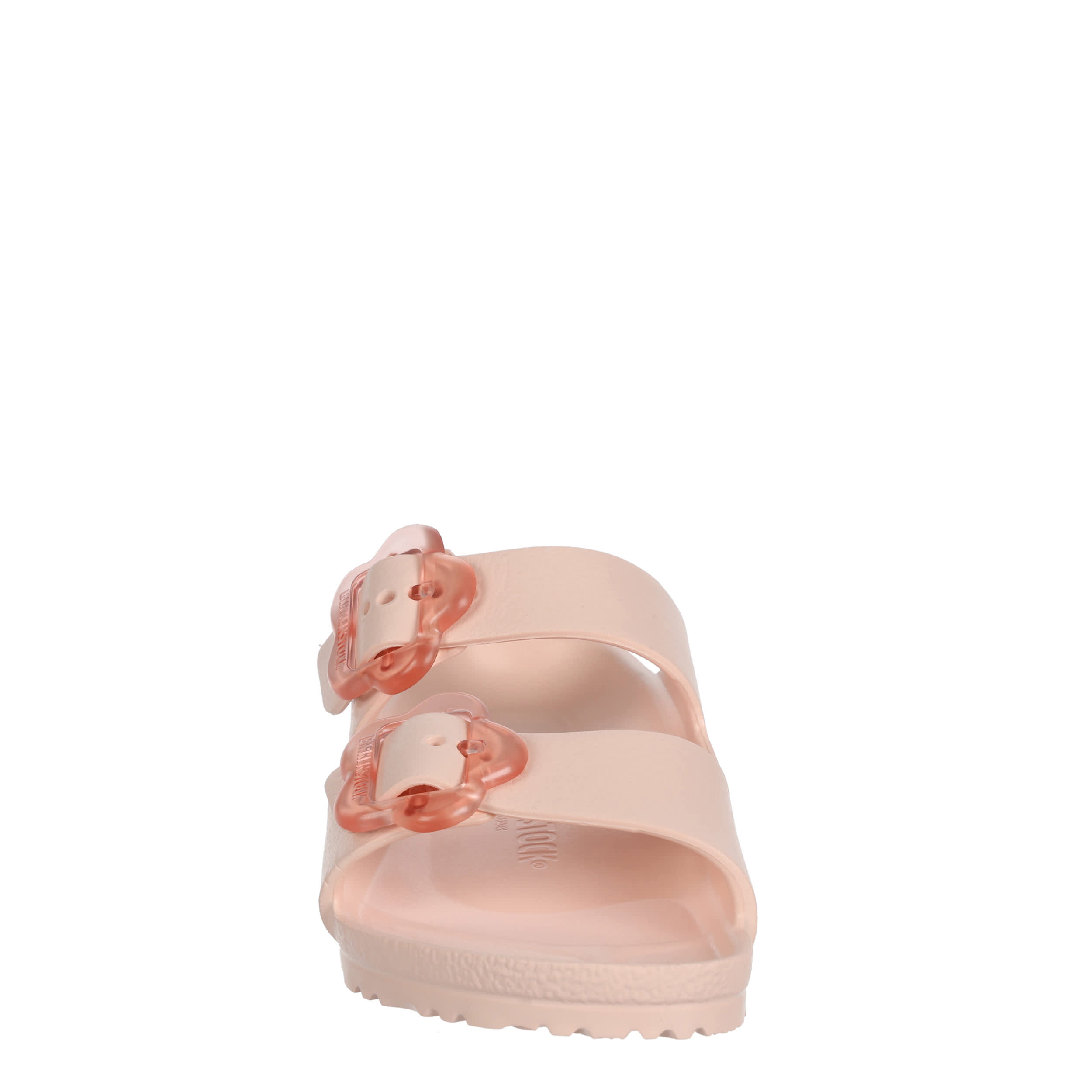Take the fun outside in the BIRKENSTOCK Arizona Flower Buckle infant girls' footbed sandal. With an EVA upper, this sandal still offers the pronounced arch support, roomy toe box, and deep heel cup your little one absolutely loves. Two straps with translucent floral buckles provide an adjustable fit.