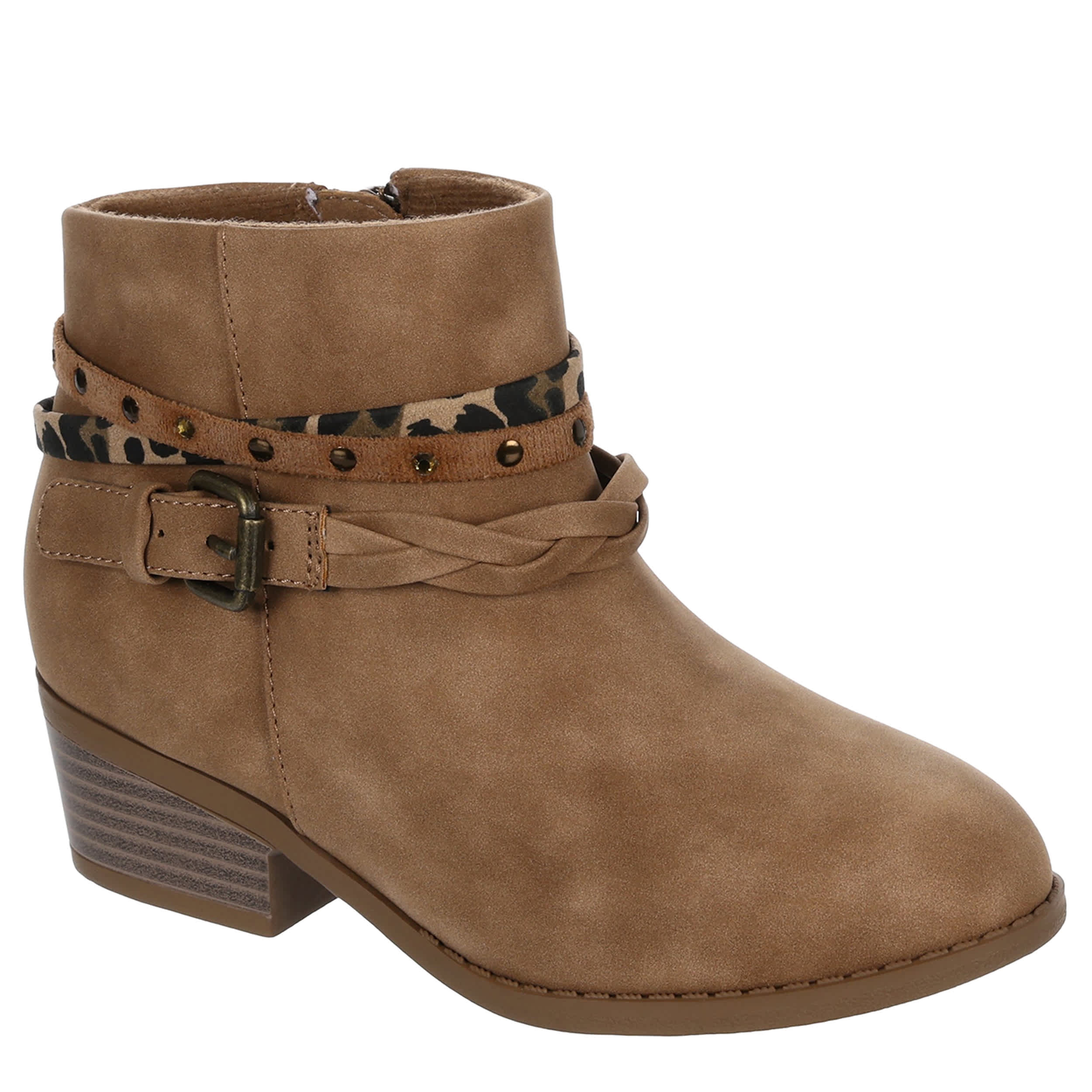 Cowgirl flavor is easy in the Sierra-K girls' Western boot from Blowfish Malibu. Featuring a faux suede upper with a braided buckle, leopard print and studded decorative straps, this easy zip bootie has relaxed down to a tee. The footbed comforts, while the stacked heel adds just enough lift.