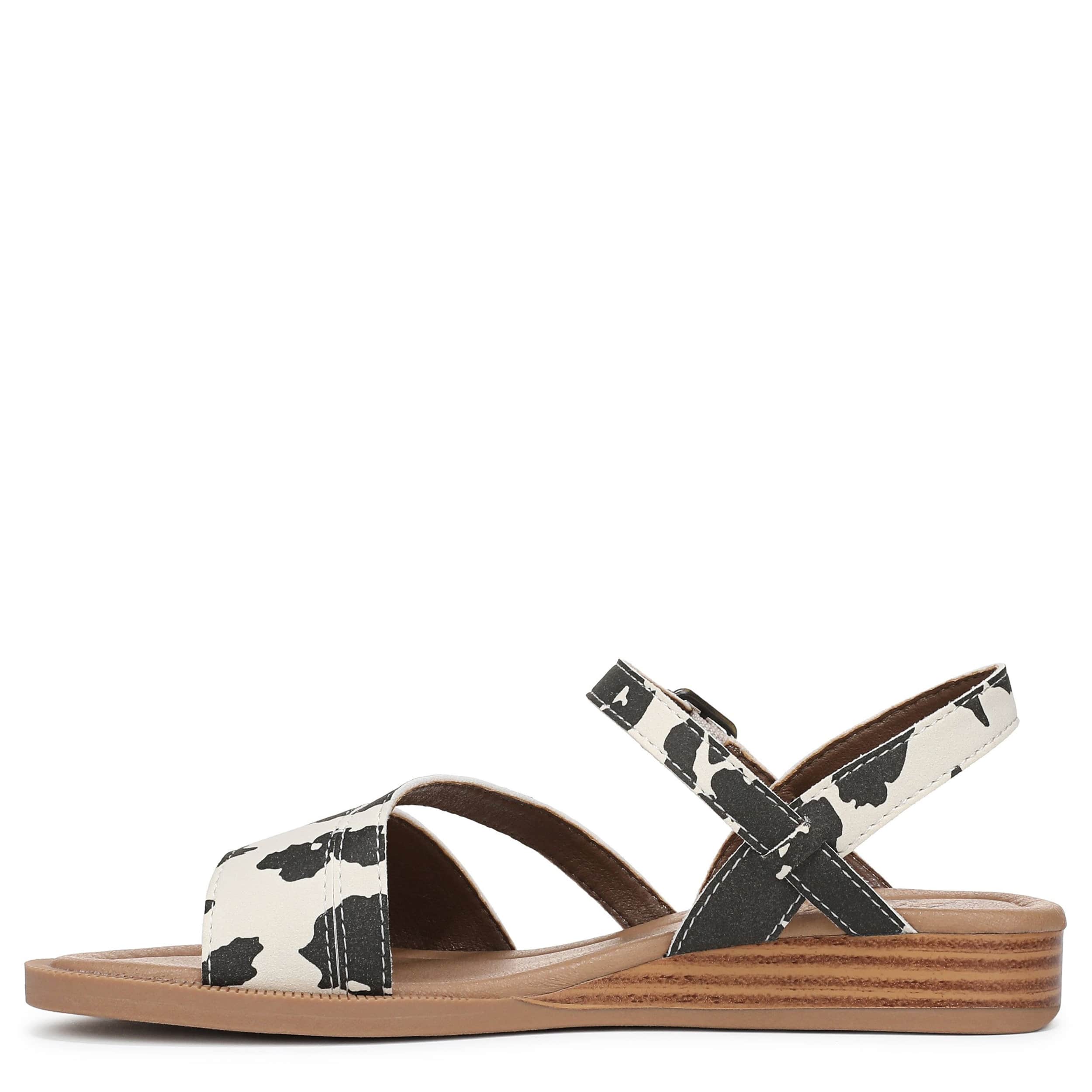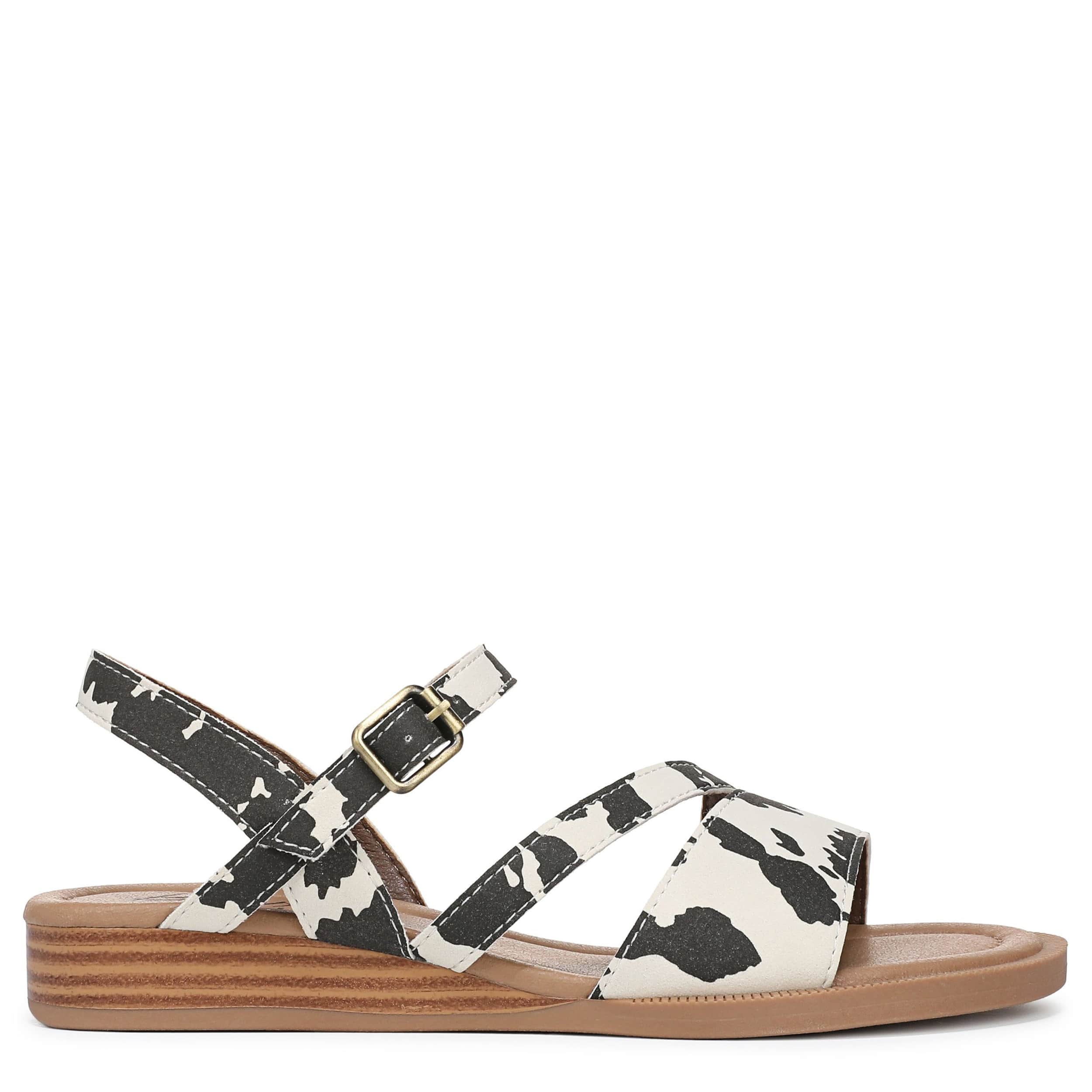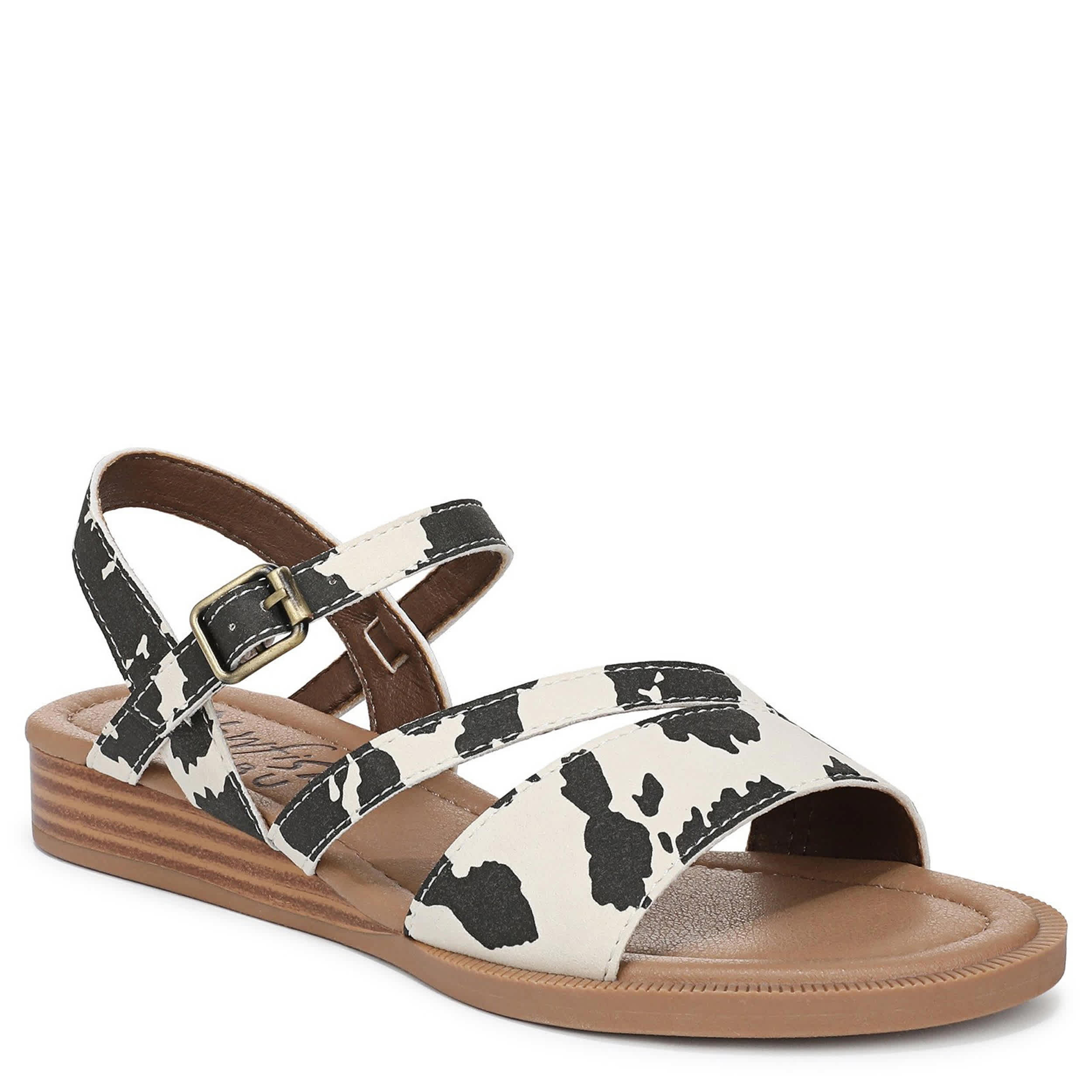 Shoot straight for the sand with the Blowfish Malibu Arrow sandal. Featuring a cow print faux nubuck upper, this strappy sandal is a great addition to your summer vacation. The slight wedge and low heel add extra comfort.