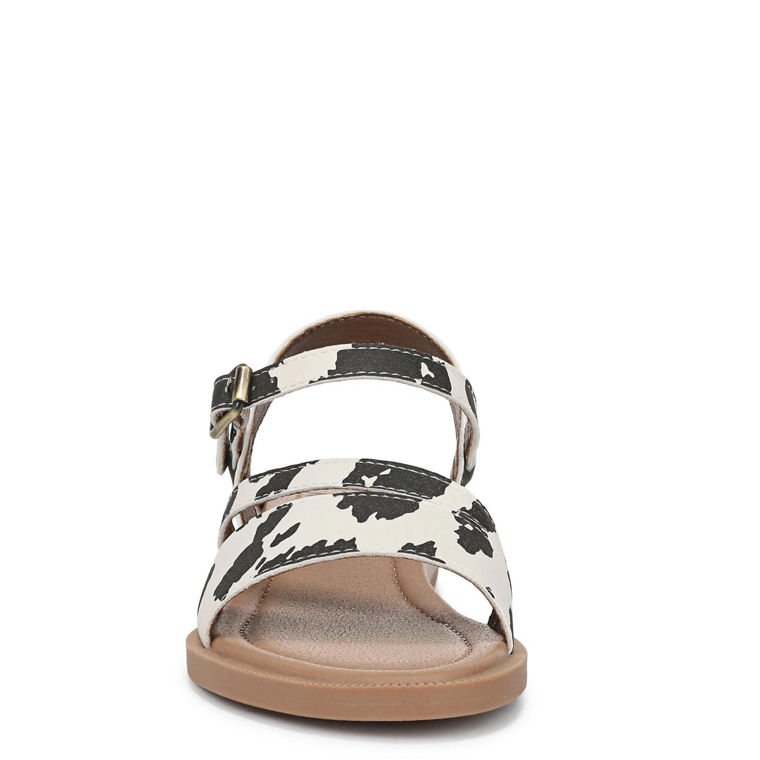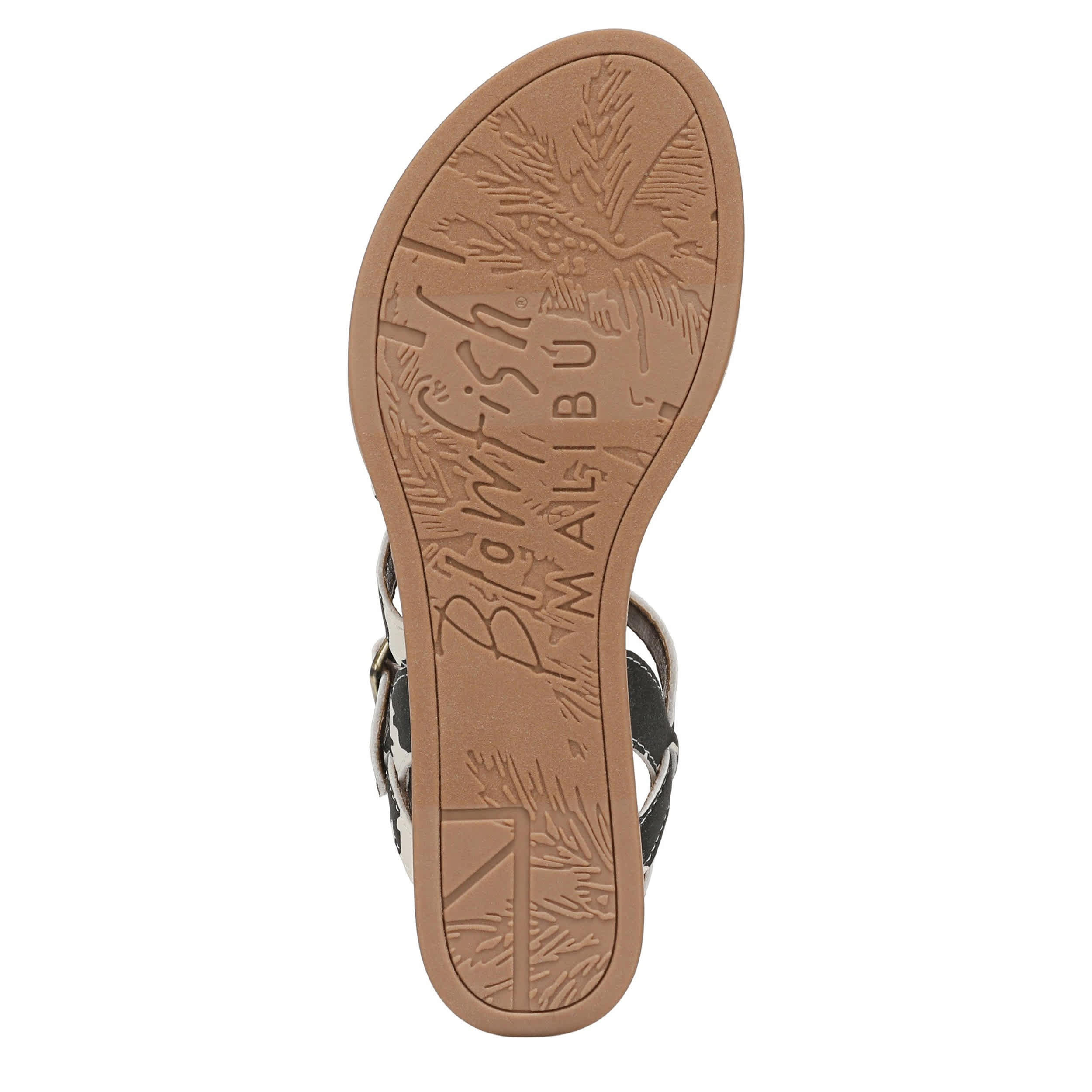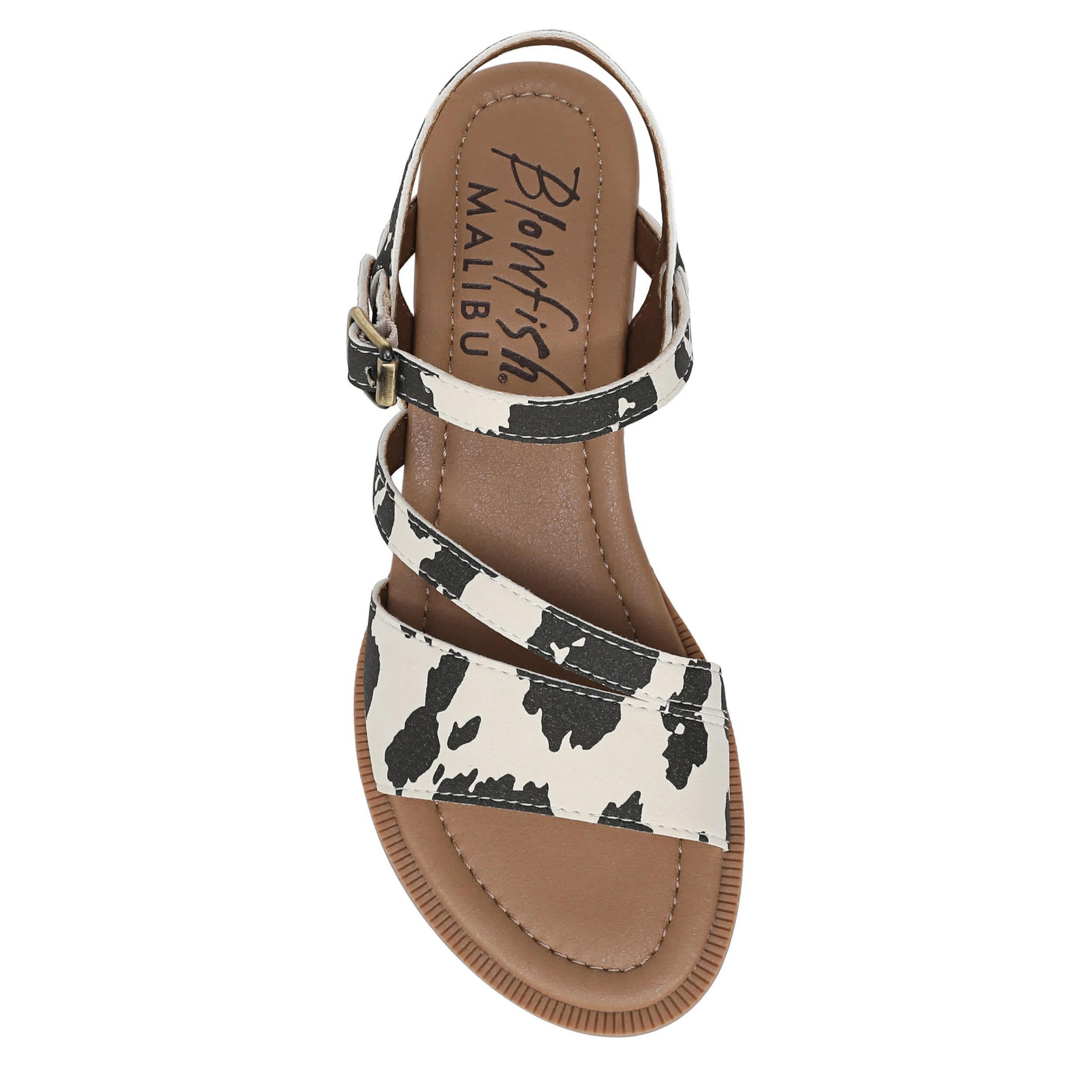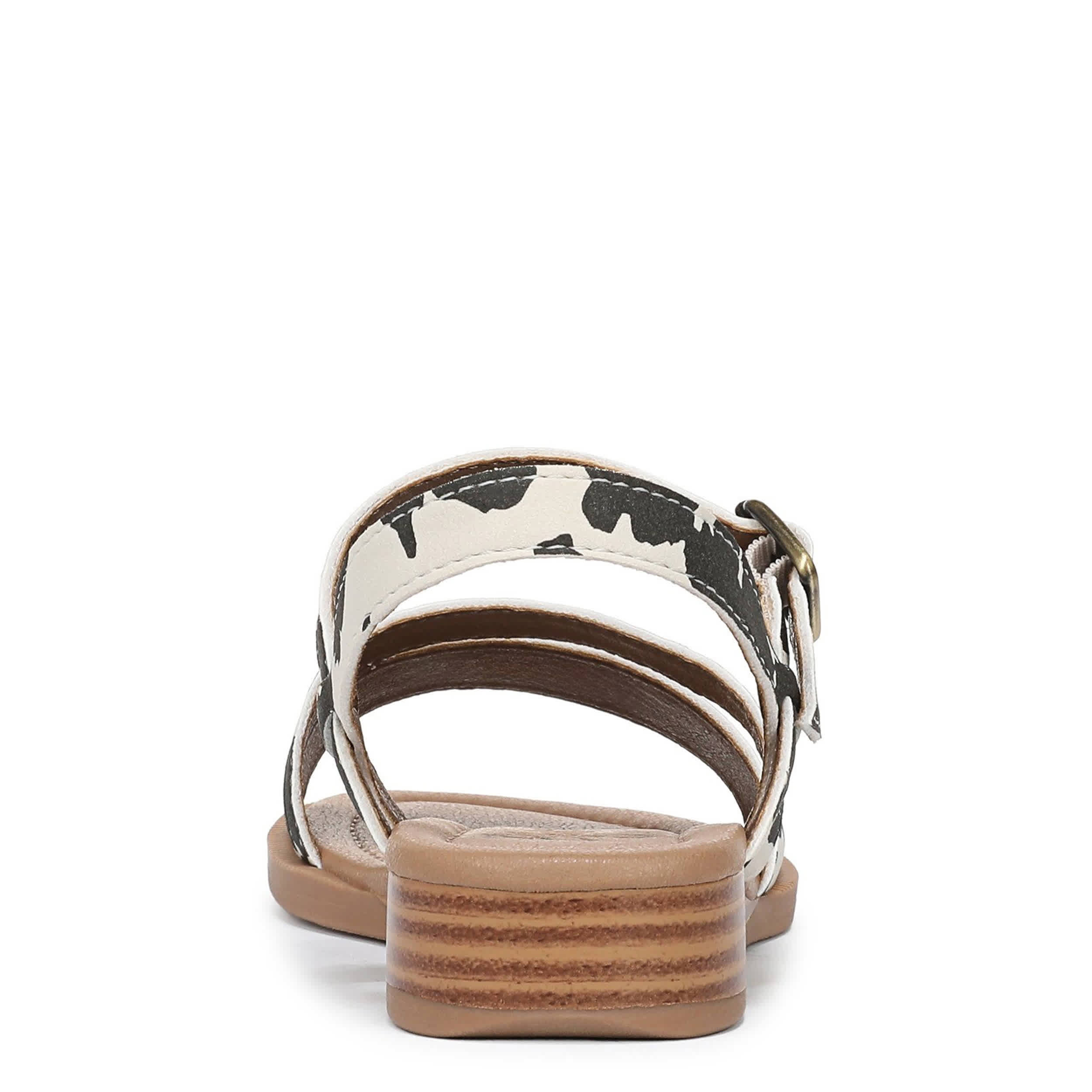 Shoot straight for the sand with the Blowfish Malibu Arrow sandal. Featuring a cow print faux nubuck upper, this strappy sandal is a great addition to your summer vacation. The slight wedge and low heel add extra comfort.