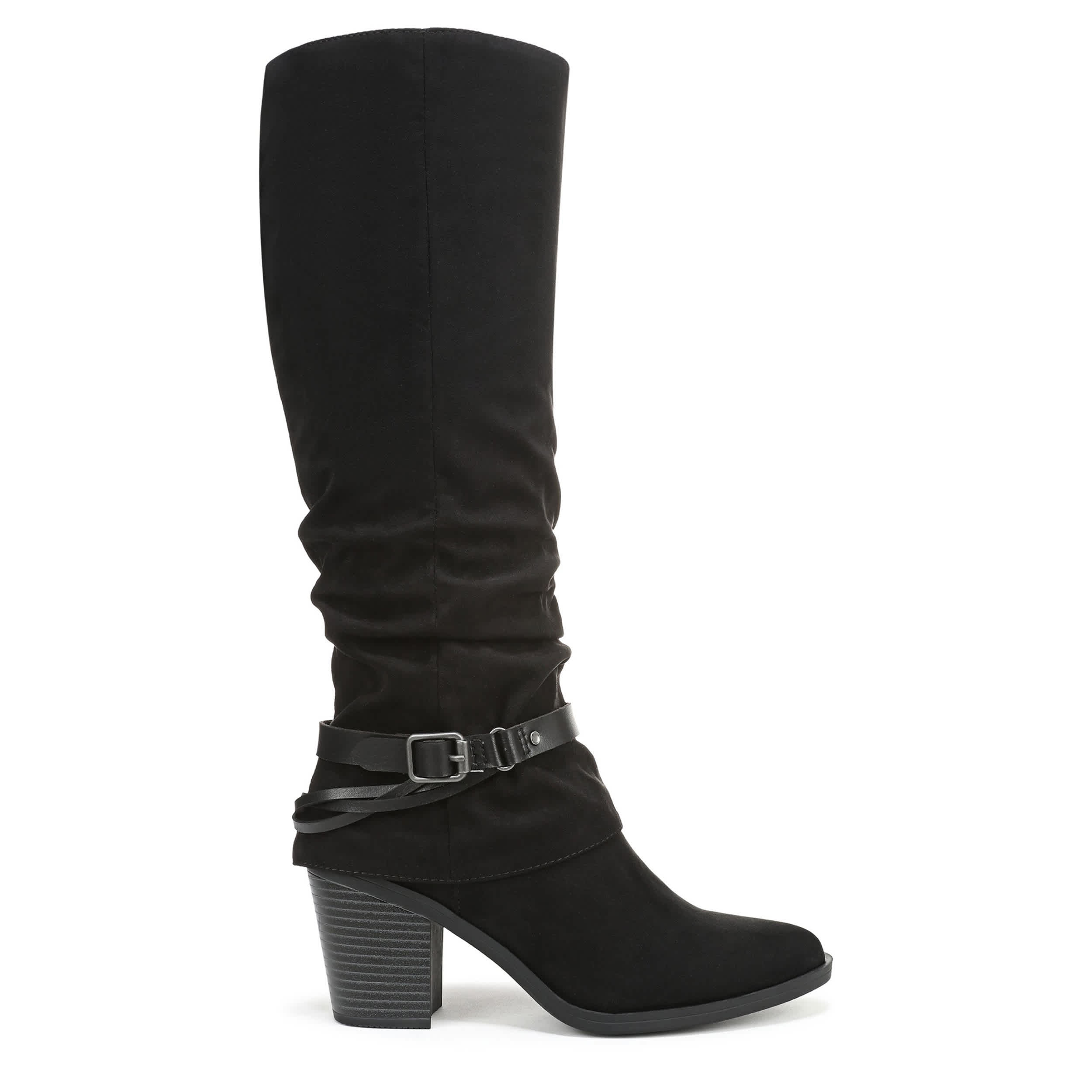 Boho chic with style to spare, the Carey tall boot from Blowfish Malibu is a must-have. Featuring a microsuede upper with deco buckle & faux leather straps over a slouchy design, this easy zip boot is ready for the fall. The footbed soothes, while the stacked heel adds nice lift.