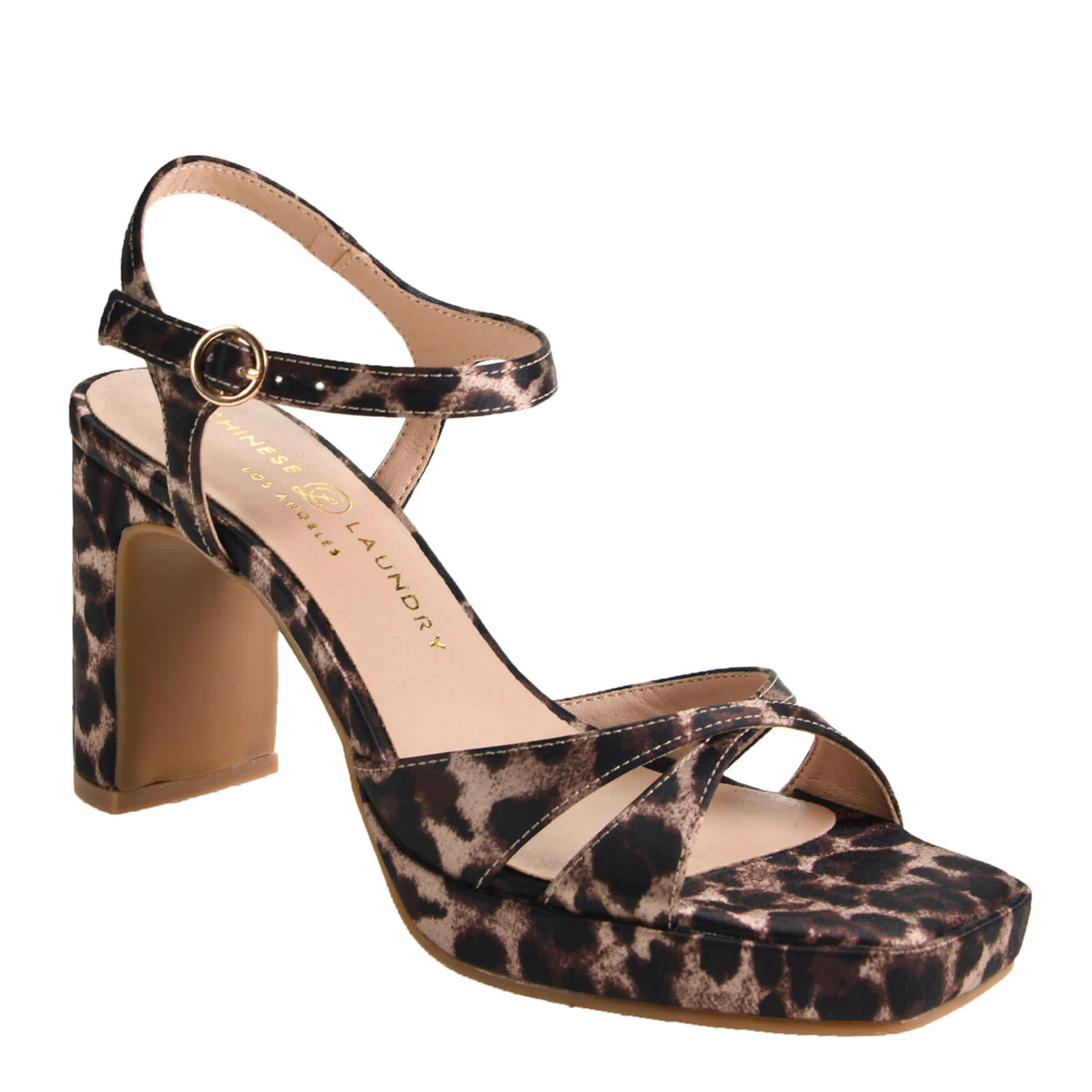 Your style gets a lift with the Chinese Laundry Gleam platform sandal. Featuring a satin upper with a fierce leopard print, this shoe keeps you on trend with its chunky silhouette. The lightly padded insole soothes your foot, while the demi block heel adds lift.