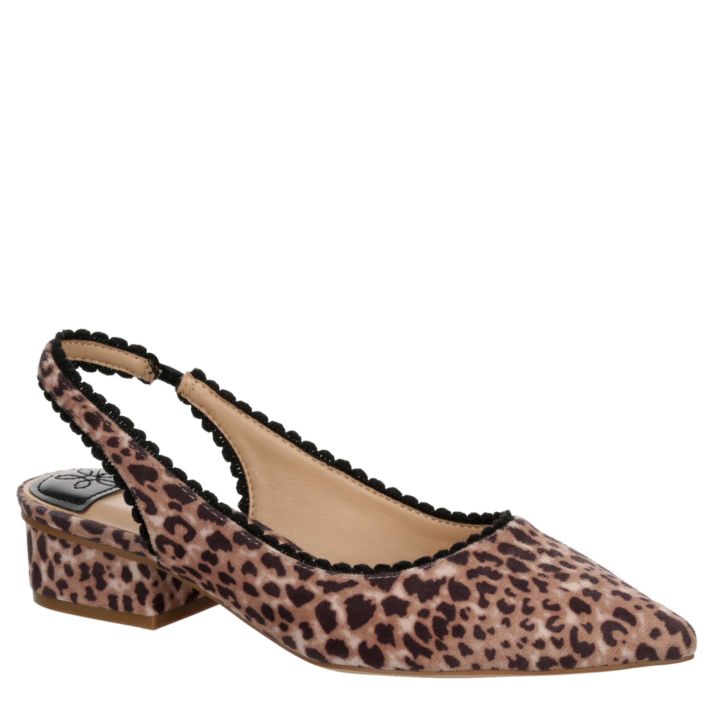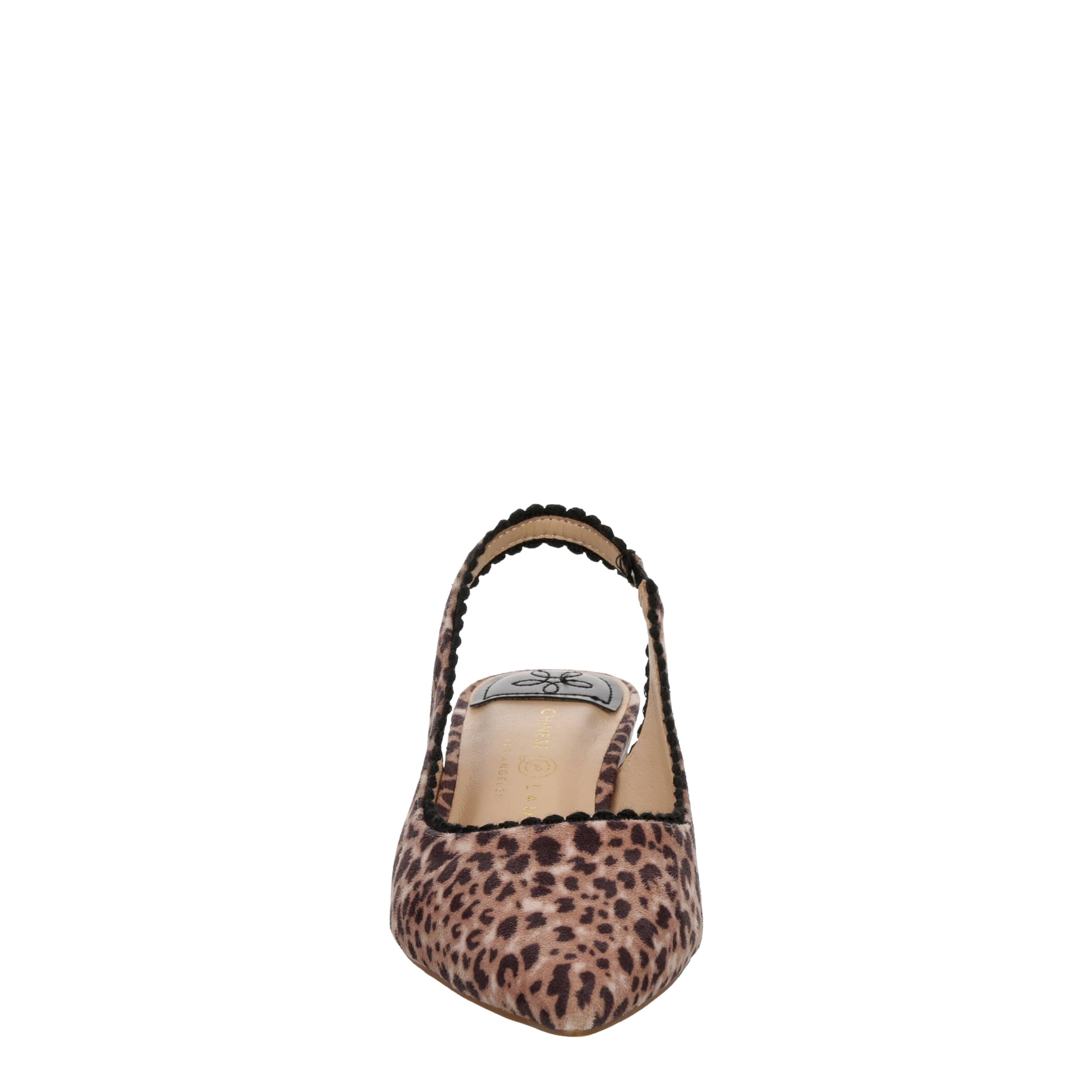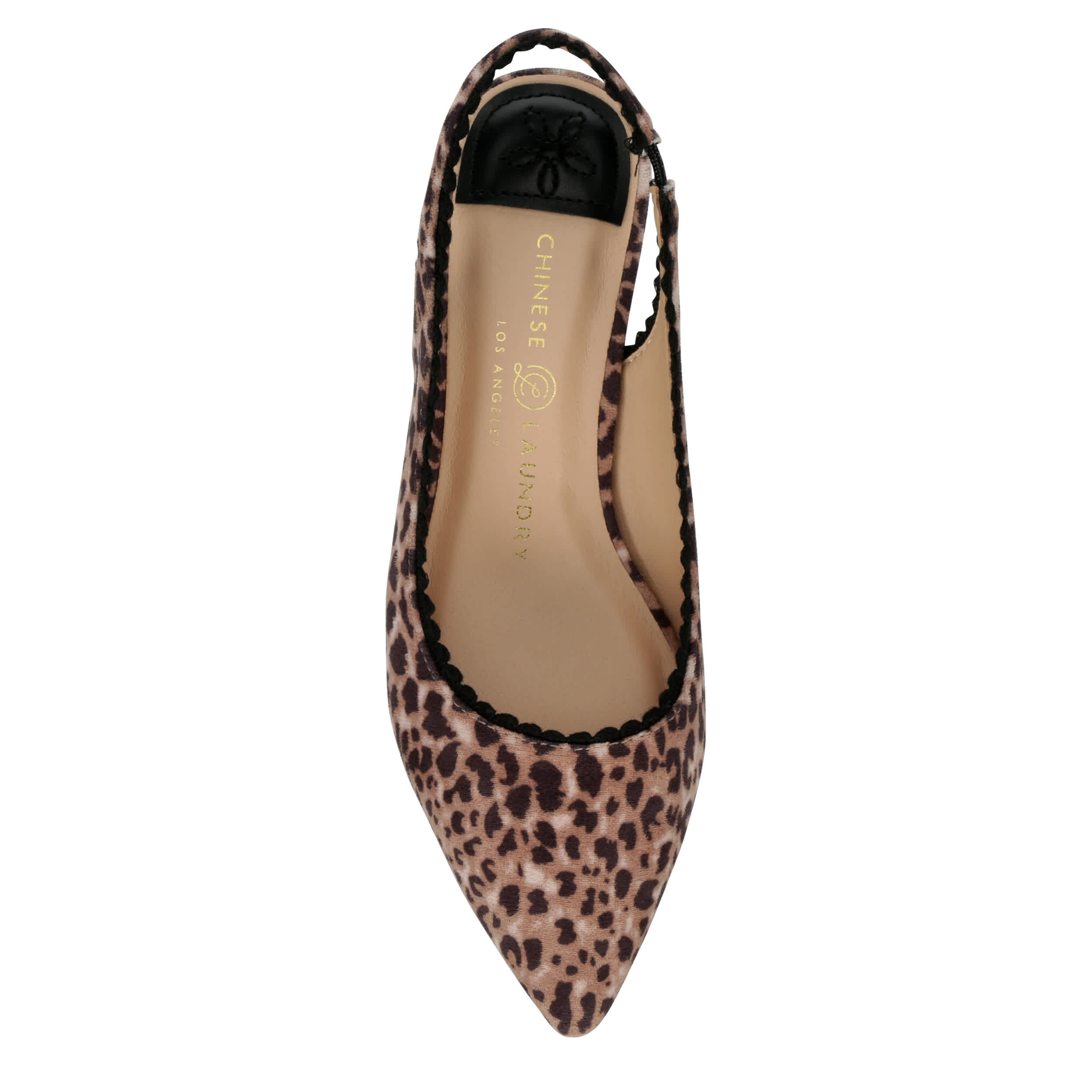 Your style gets a dose of sophisticated whimsy in the Mango women's pump from Chinese Laundry. Featuring a printed faux suede upper with a sleek pointed toe, this elastic slingback shoe's scalloped trim shows its exuberance and charm. The insole soothes your foot, while the low heel adds stability.