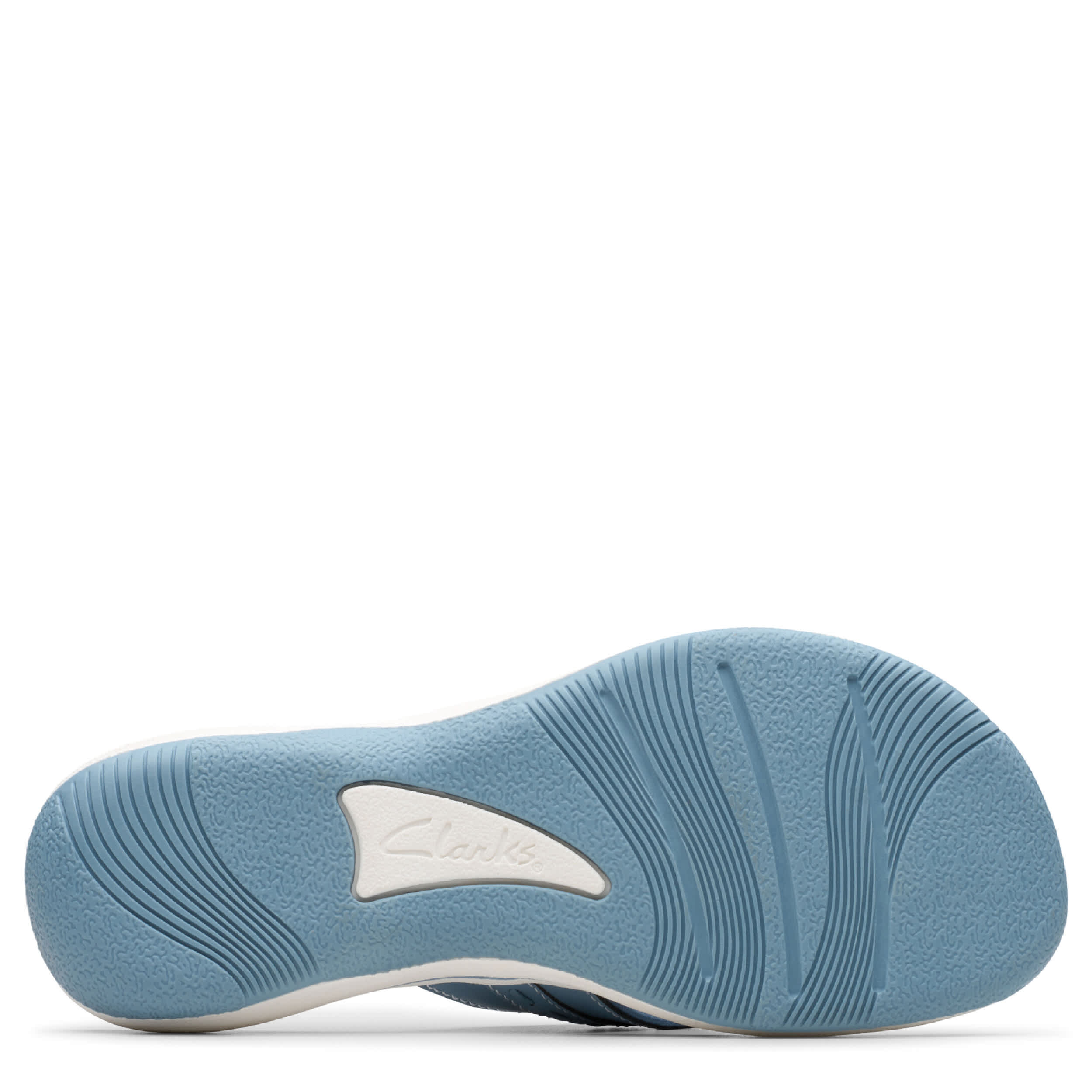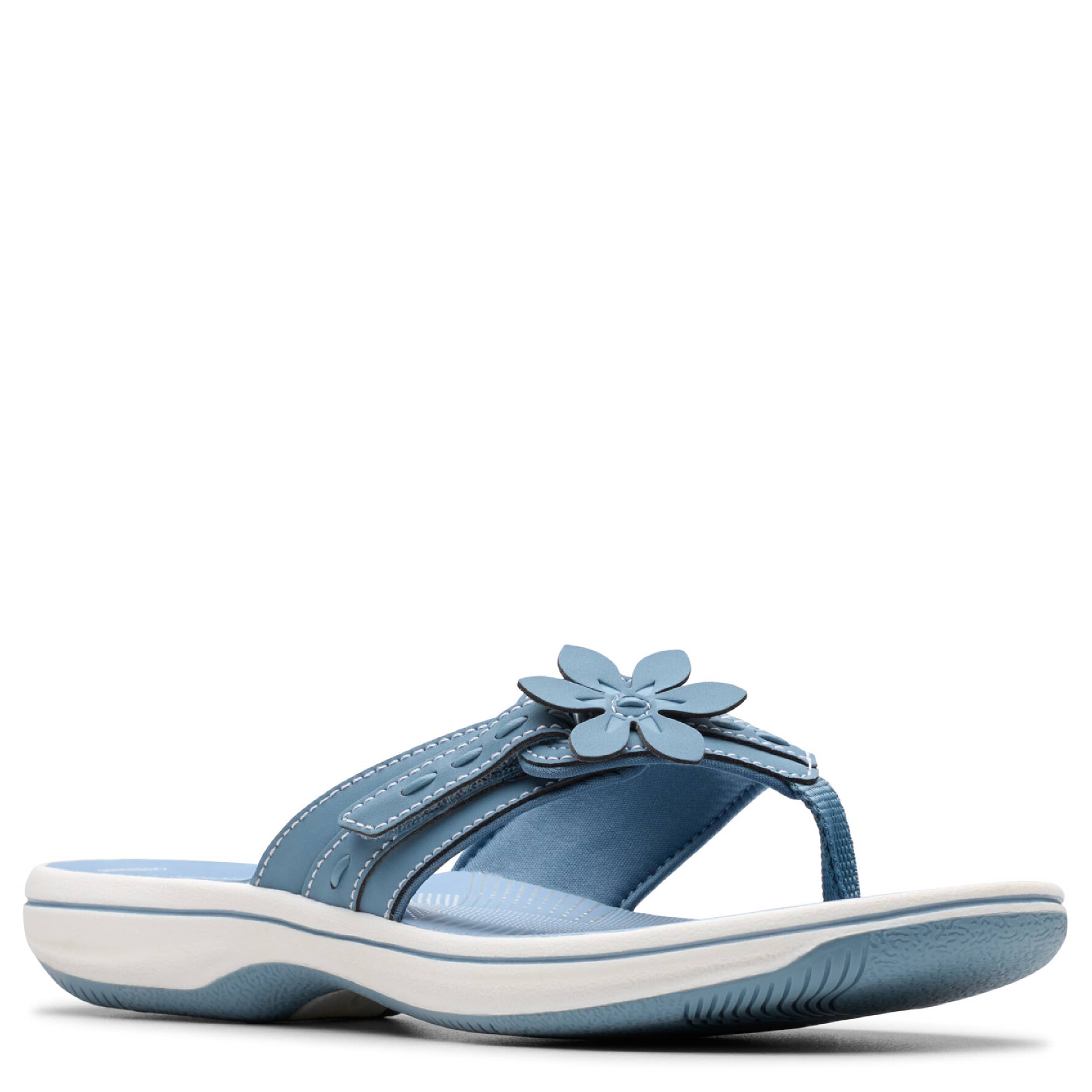 Style blossoms on the Breeze Opal flip flop sandal from Clarks. Featuring a soft, neutral upper with a large floral ornament right of center for extra appeal, this thong sandal also has an adjustable hook-and-loop strap. The Cushion Softâ„¢ foam reminds you that this sandal is definitely part of the Cloudsteppersâ„¢ collection, with impact absorption for lasting comfort.