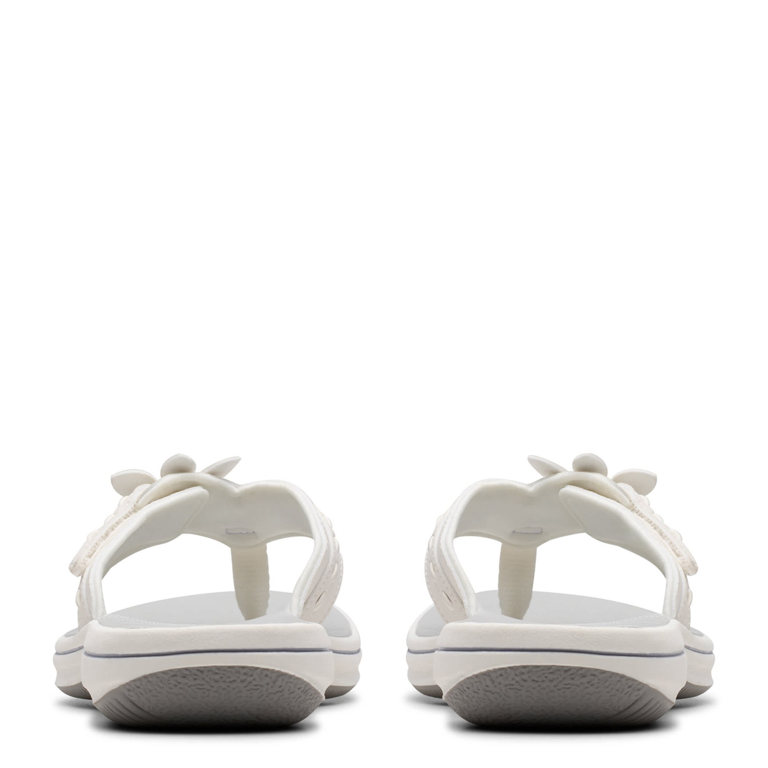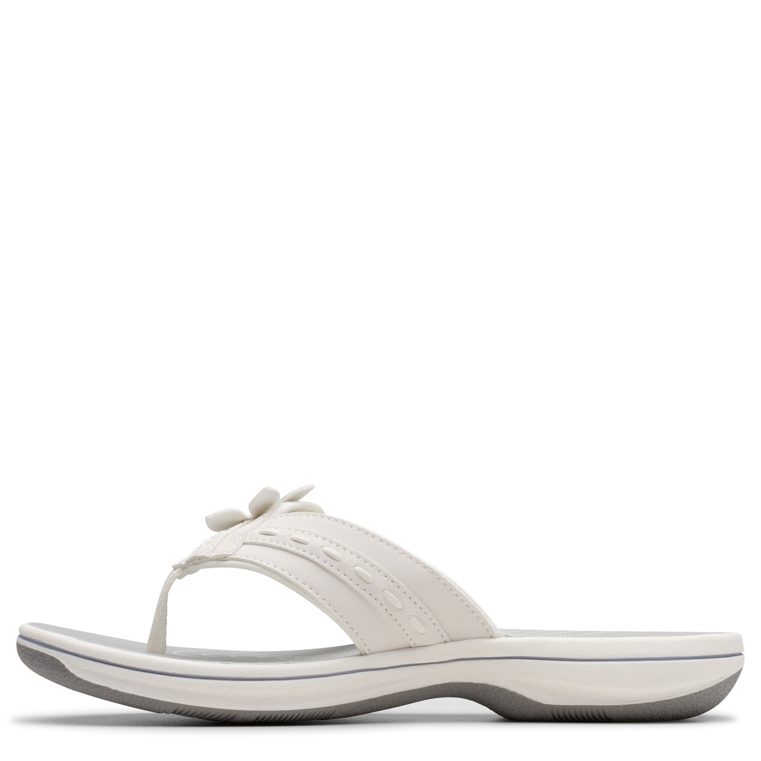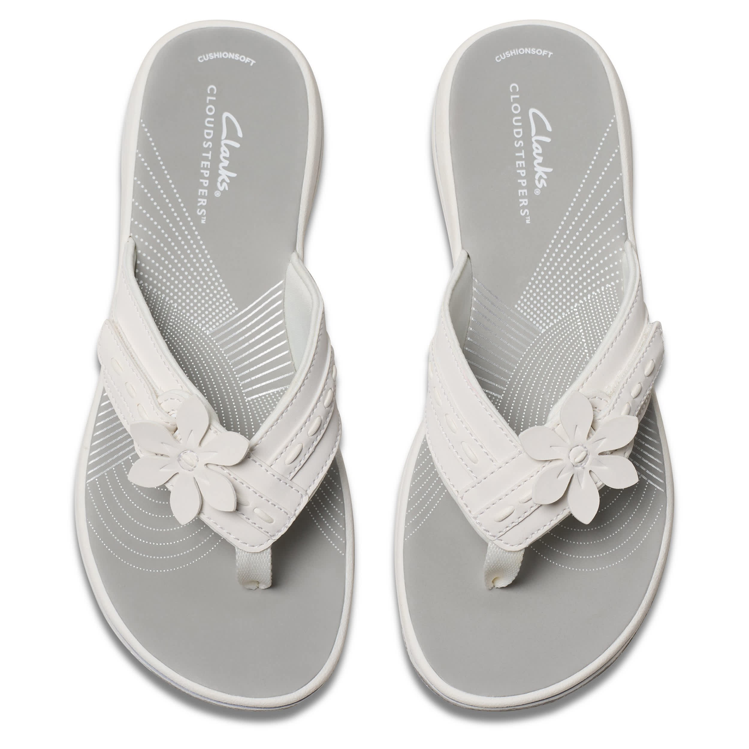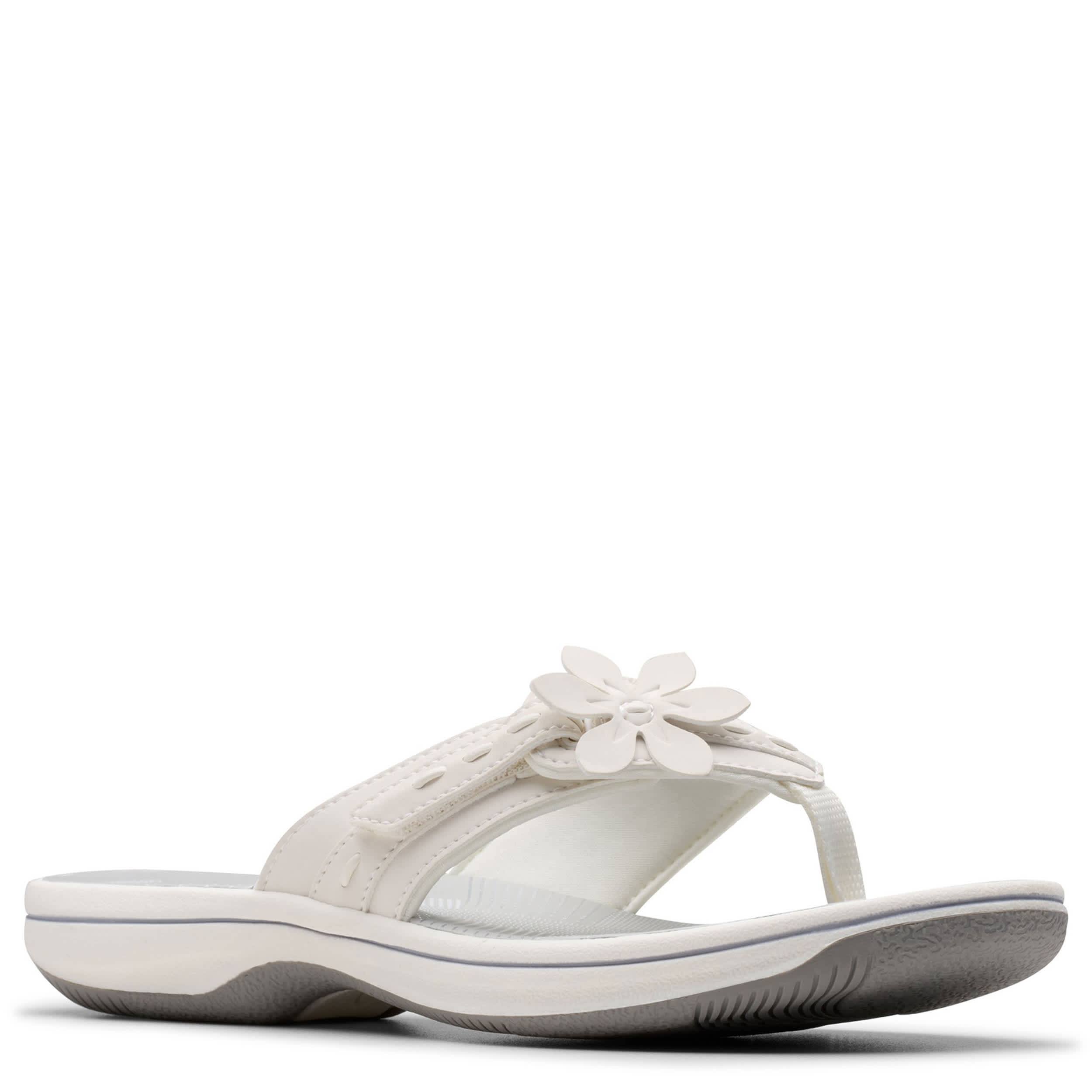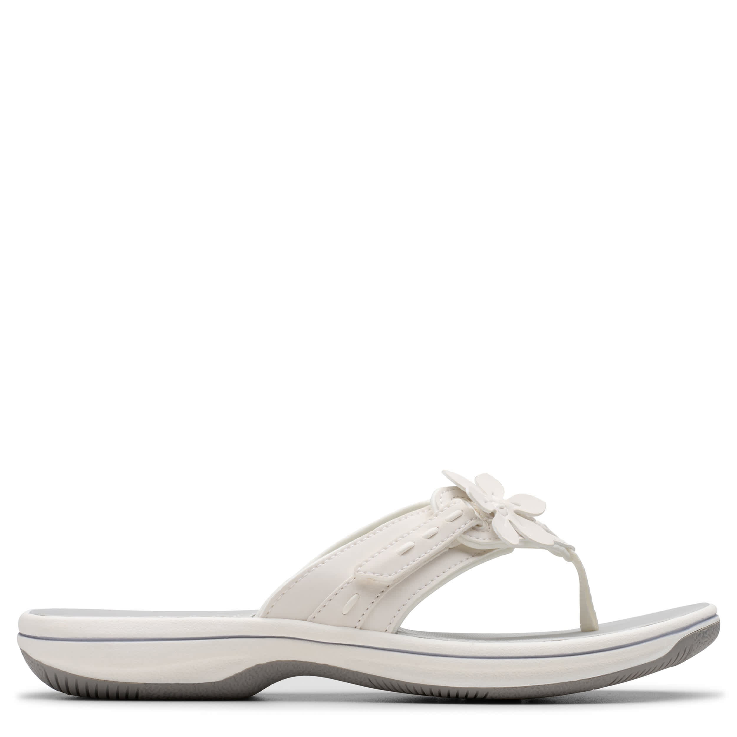 Style blossoms on the Breeze Opal flip flop sandal from Clarks. Featuring a soft, neutral upper with a large floral ornament right of center for extra appeal, this thong sandal also has an adjustable hook-and-loop strap. The Cushion Softâ„¢ foam reminds you that this sandal is definitely part of the Cloudsteppersâ„¢ collection, with impact absorption for lasting comfort.