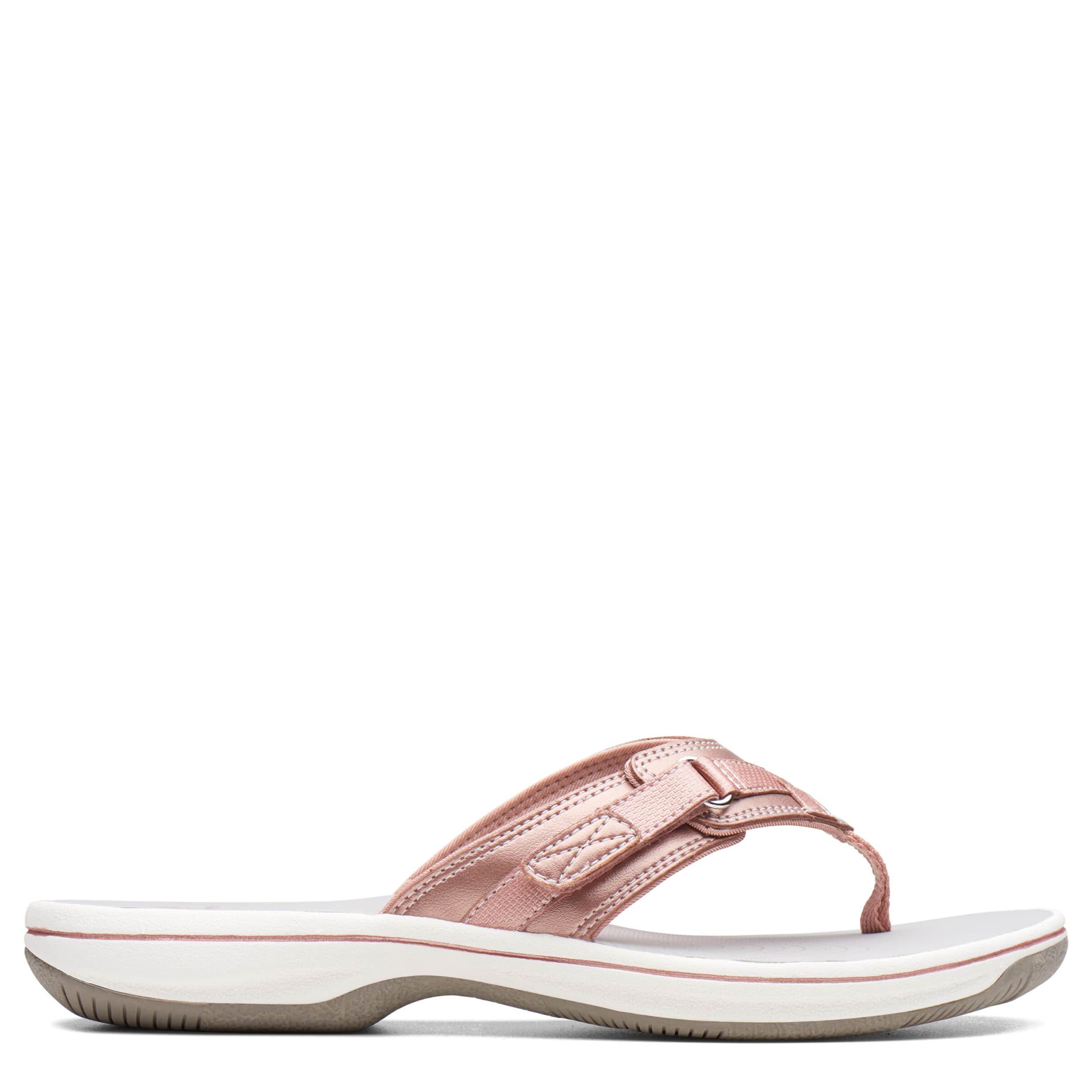 Add a sporty touch to your summer look with the Breeze Sea women's flip flop sandal from Clarks. Featuring a synthetic upper with a thong toe post for a secure fit, this slip-on sandal also has an adjustable hook & loop strap. The cushioned EVA footbed & midsole massages your foot while the durable outsole offers some traction for a day at the lake or the beach