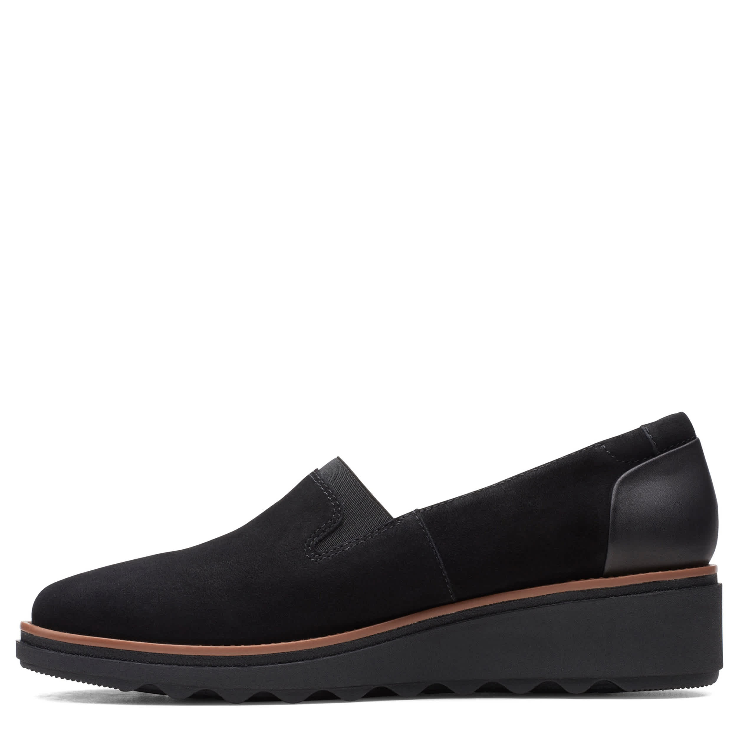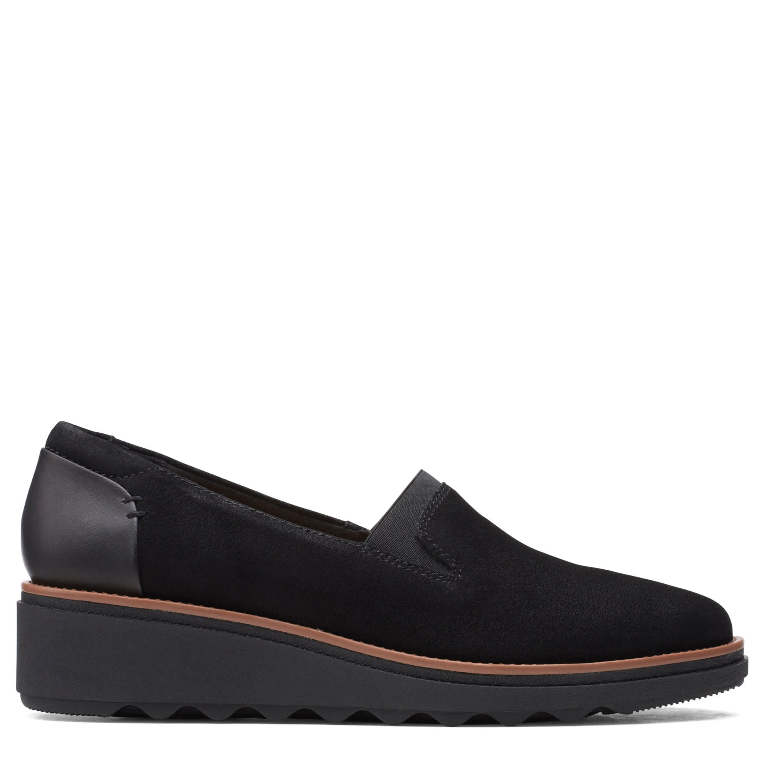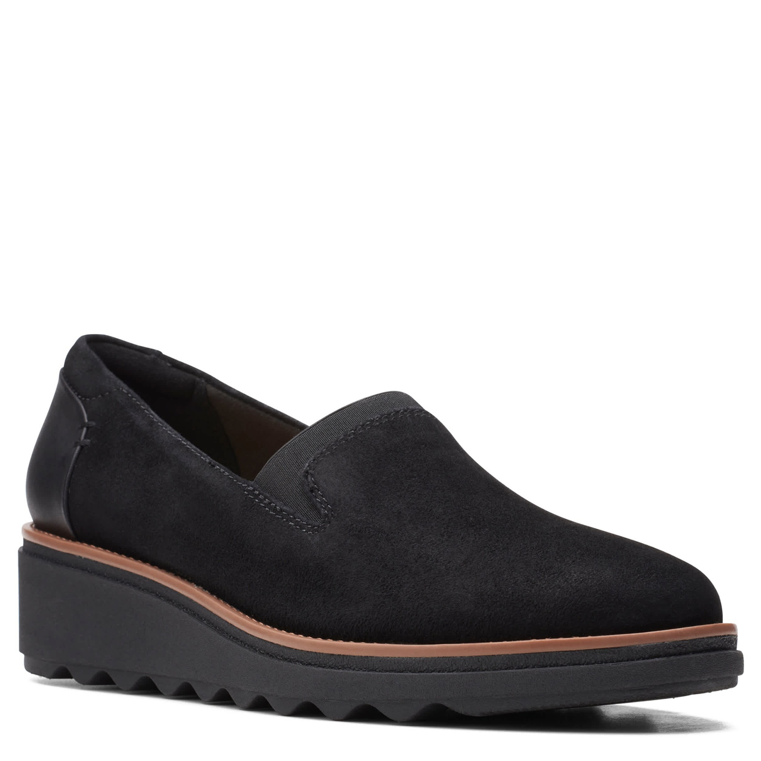 Style has traction in the Sharon Dolly loafer from Clarks. With a suede upper featuring elastic stretch panel and crafted stitchwork, this slip-on is great for work or a busy weekend. The Cushion Soft™ underfoot technology and OrthoLite® Hybrid® footbed deliver breathable comfort, while the wedge adds stable lift.