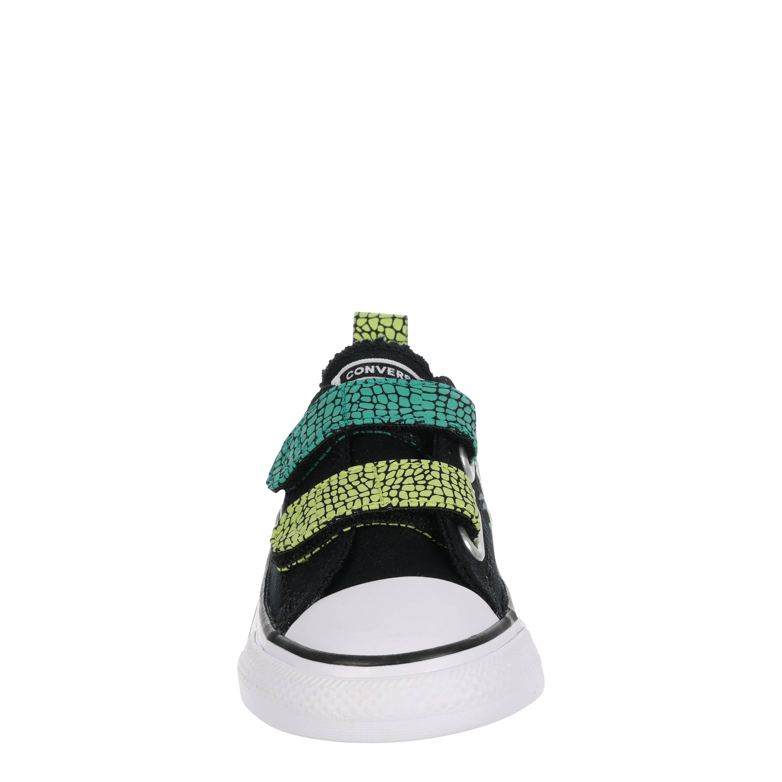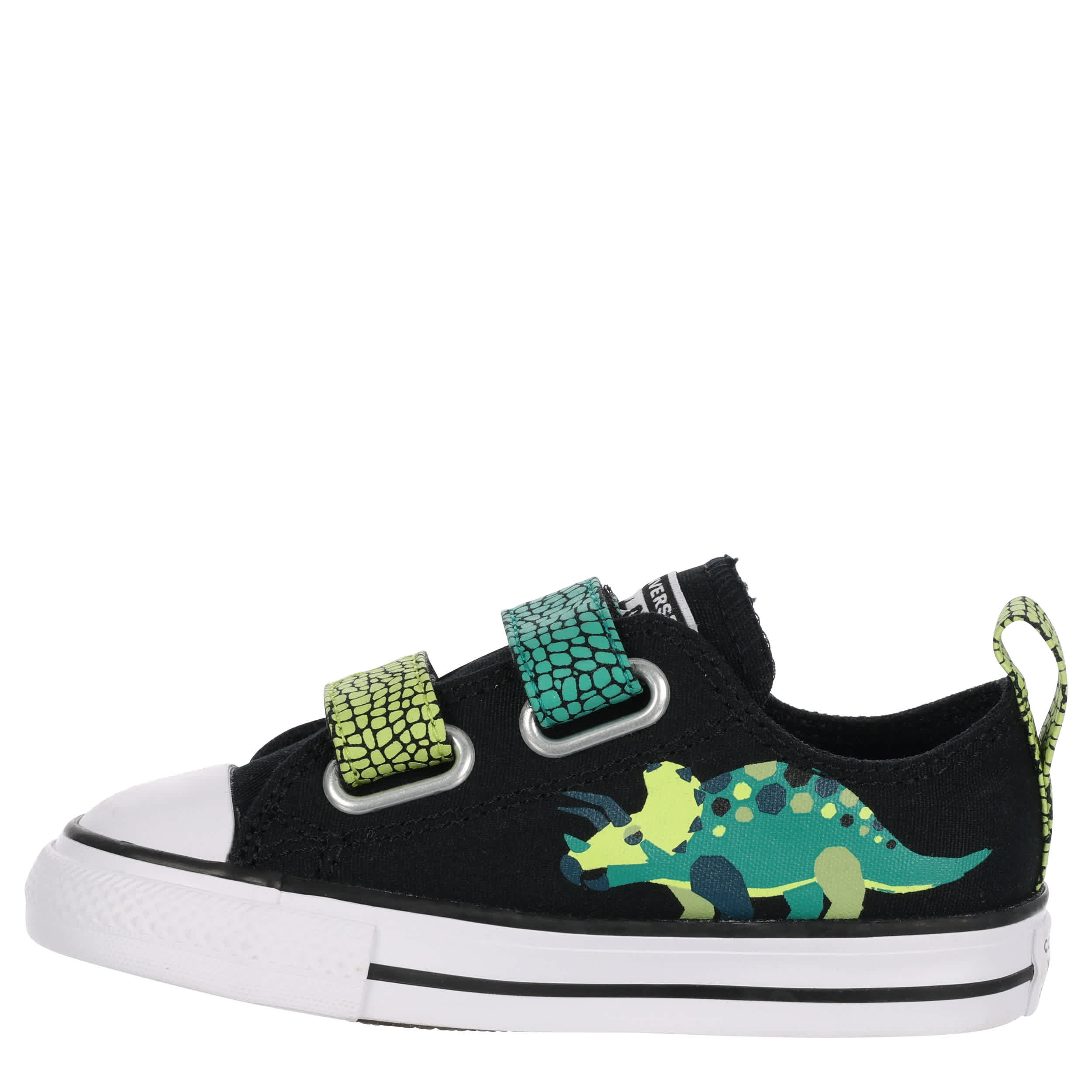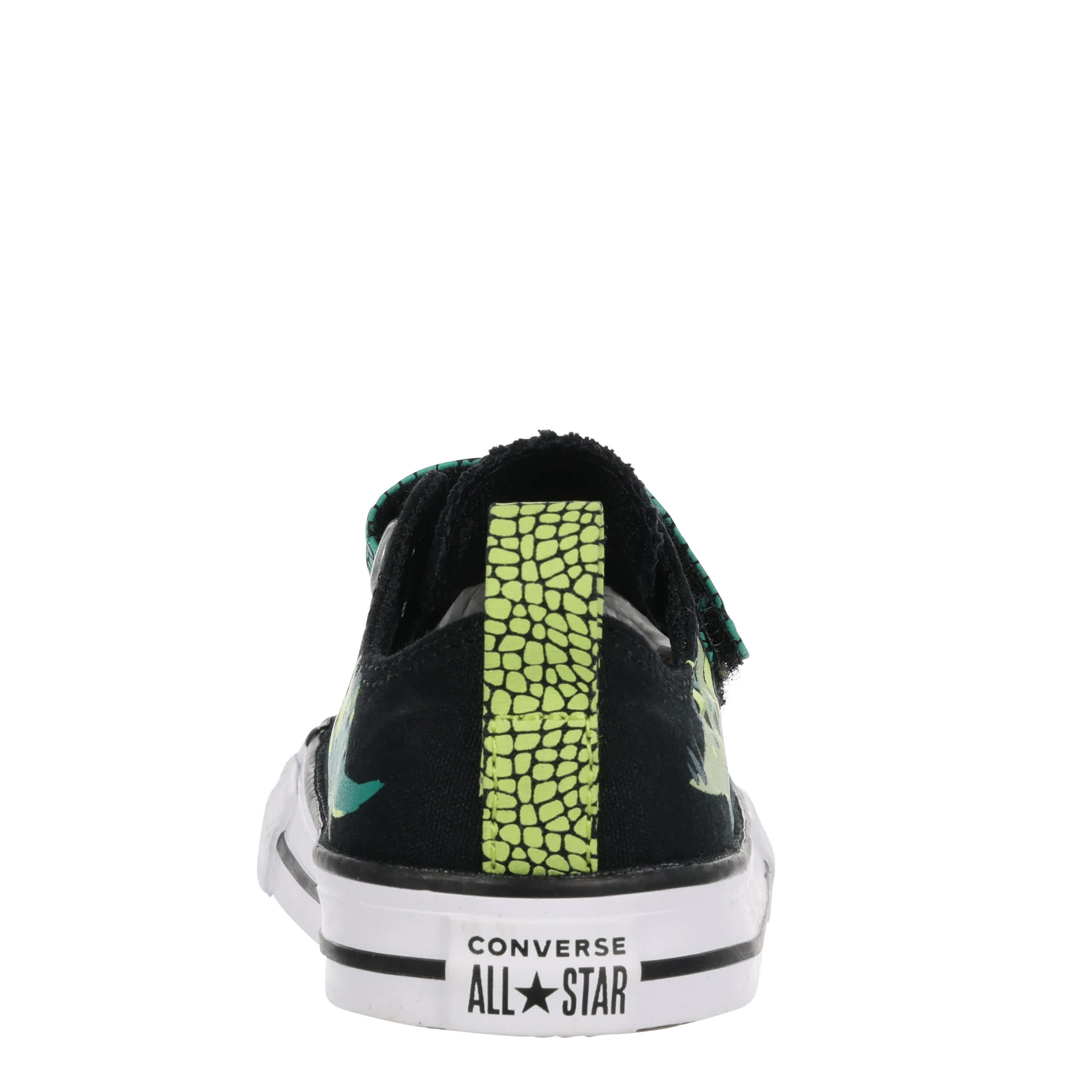 Give him scaly dino style in the Converse Chuck Taylor All Star Low sneaker. Featuring a double hook-and-loop Velcro closure and fun dinosaur print, these low-cut sneakers offer a snug, comfortable fit all-day long. The signature Converse rubber cap toe protects from stubbing as he tottles around.