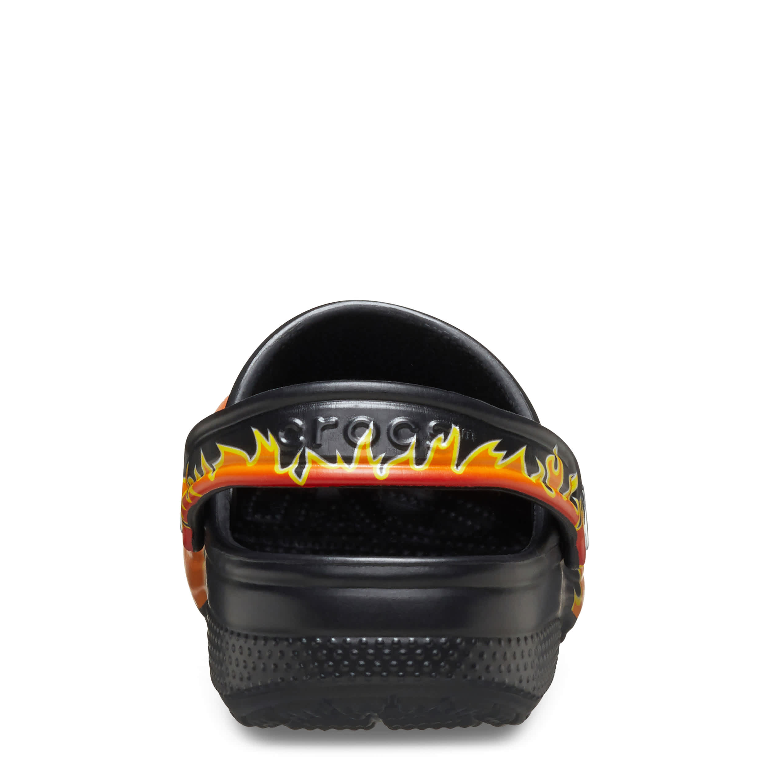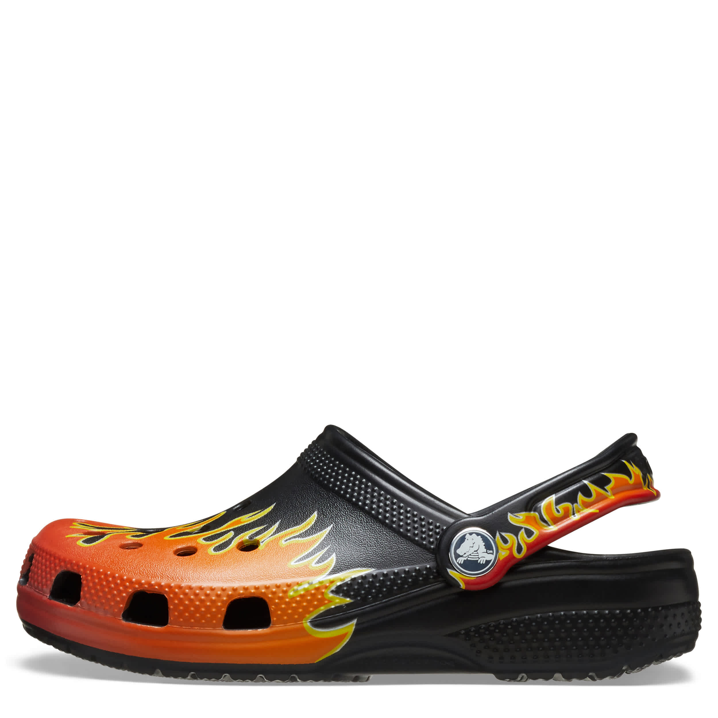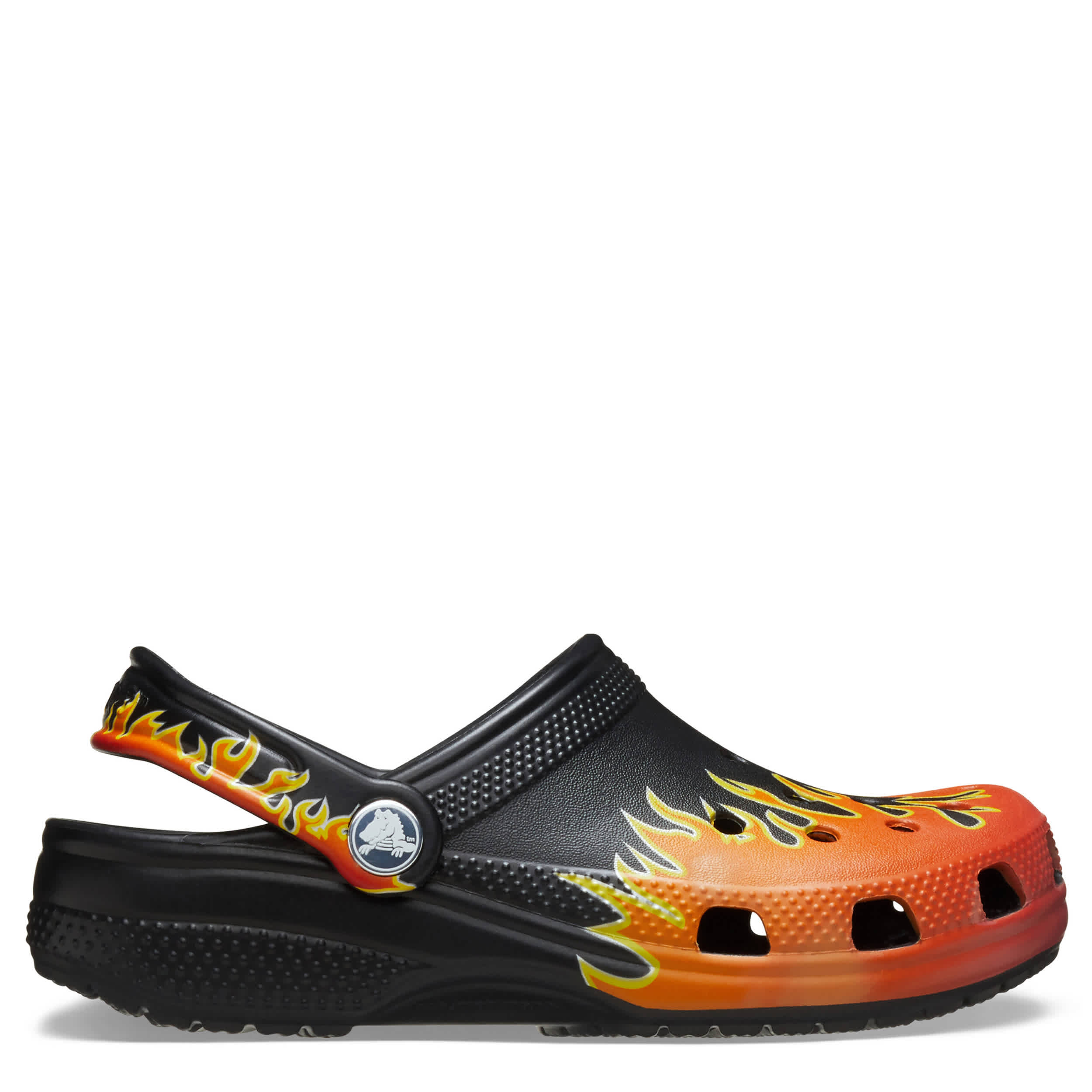 He can't go wrong with the Classic Prints boys' clog by Crocs. The Iconic Crocs Comfort material offers lightweight, flexible cushioning and a gentle massaging sensation, while the well-ventilated flame printed upper circulates air for a cool, dry fit.