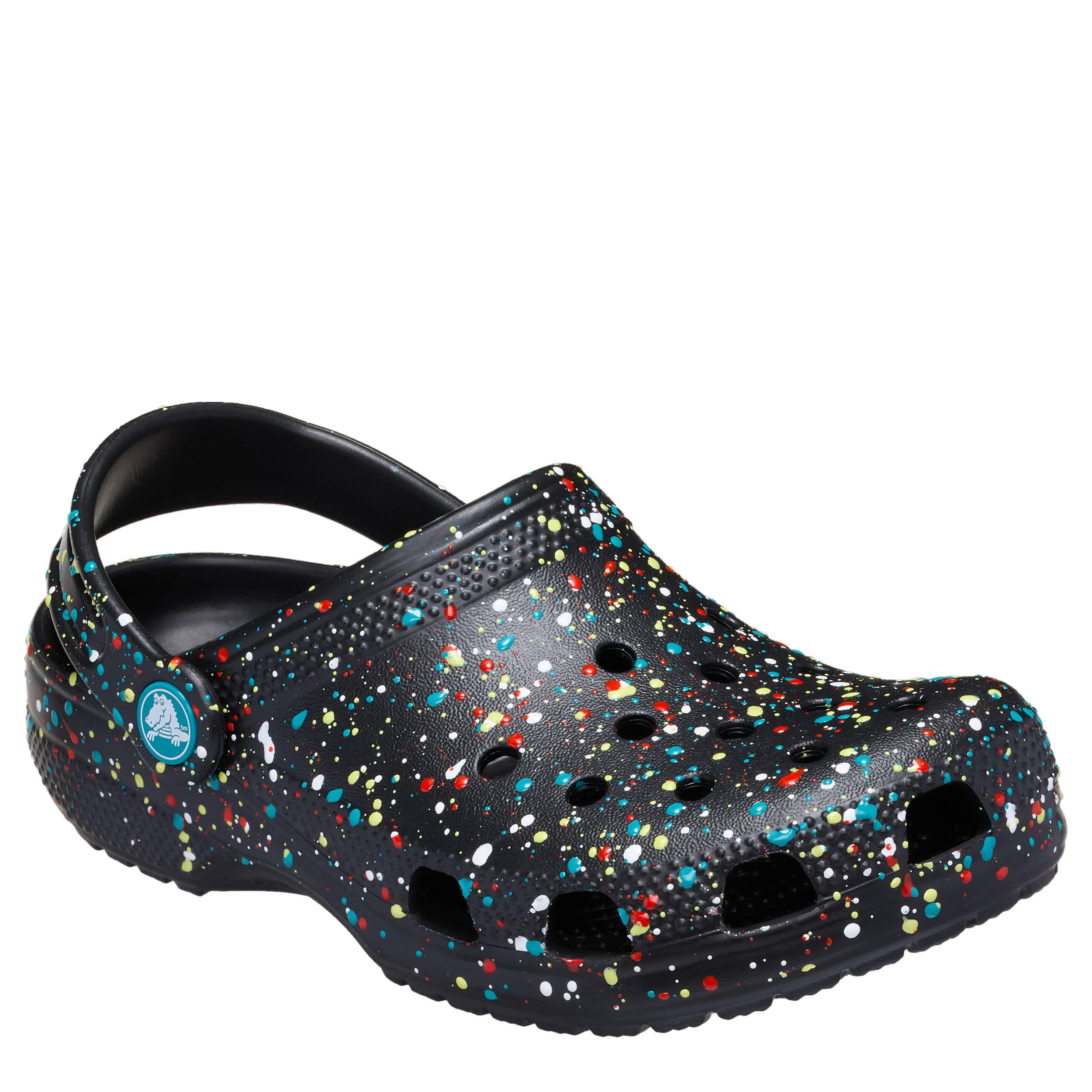 He can't go wrong with the Classic Prints boys' clog by Crocs. The Iconic Crocs Comfort material offers lightweight, flexible cushioning and a gentle massaging sensation, while the well-ventilated black splatter printed upper circulates air for a cool, dry fit.