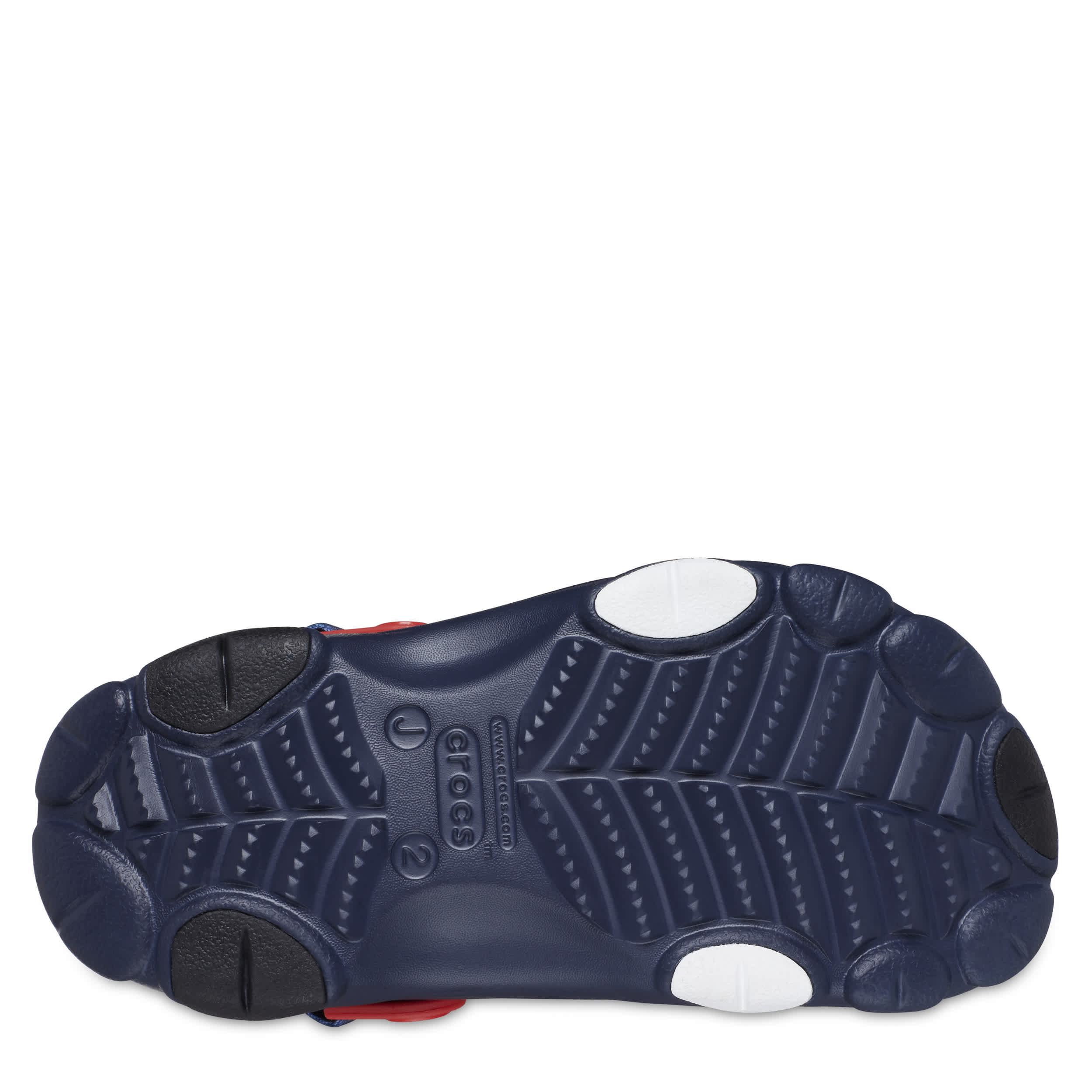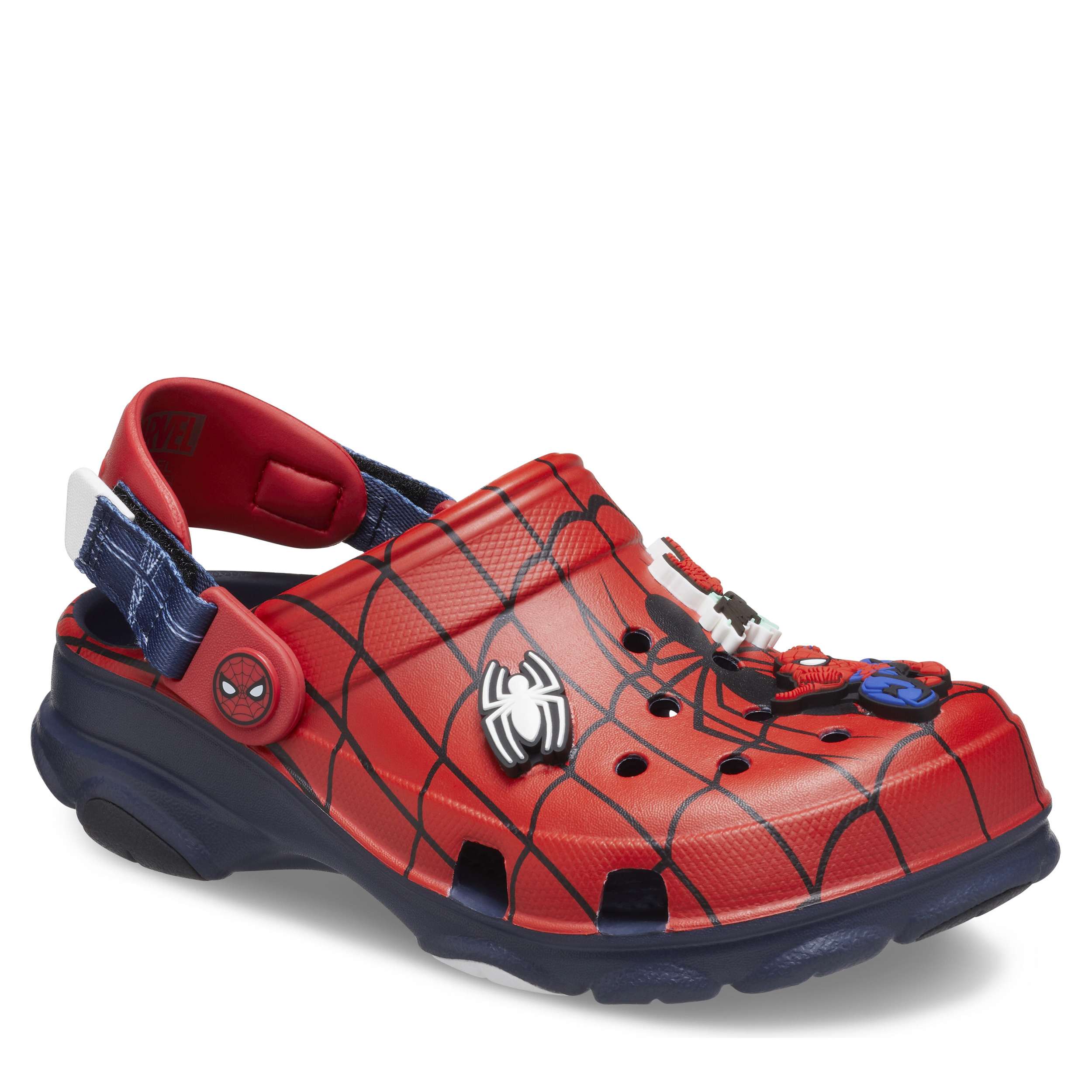 Travel the neighborhood with his favorite superhero in the Spider-Man All-Terrain clogs from Crocs. Featuring a lightweight Crosliteâ„¢ upper with the familiar webbed styling and including Marvel's Spider-Man Jibbitzâ„¢ that are customizable to fit his style, these adjustable Crocs are ready for adventure. The Iconic Crocs Comfortâ„¢ footbed is flexible while the traction from the outsole supports every move he makes.