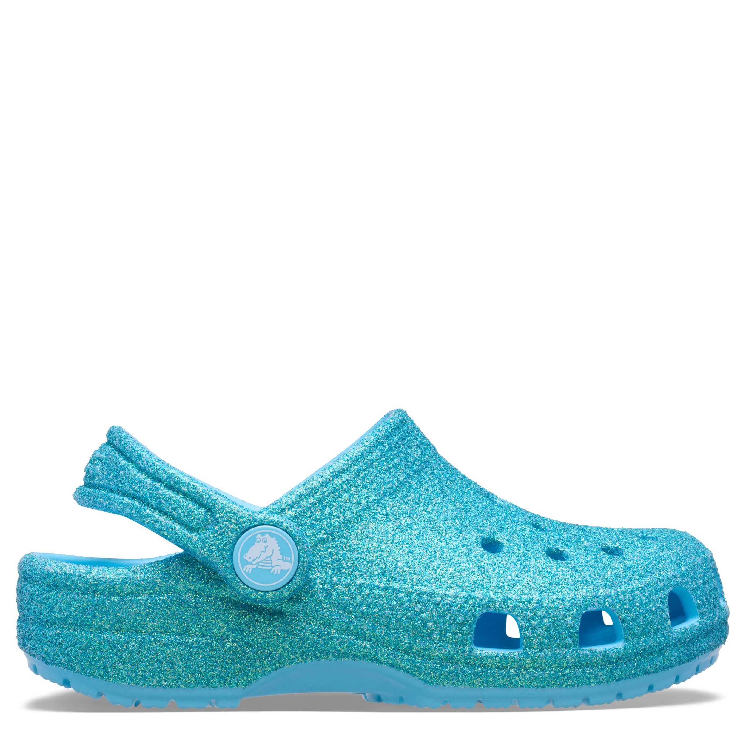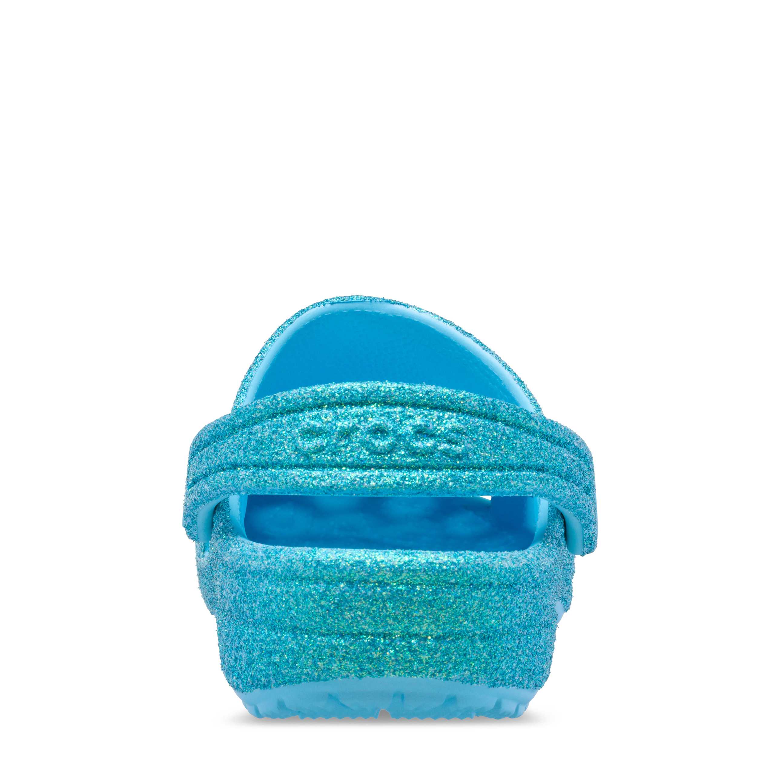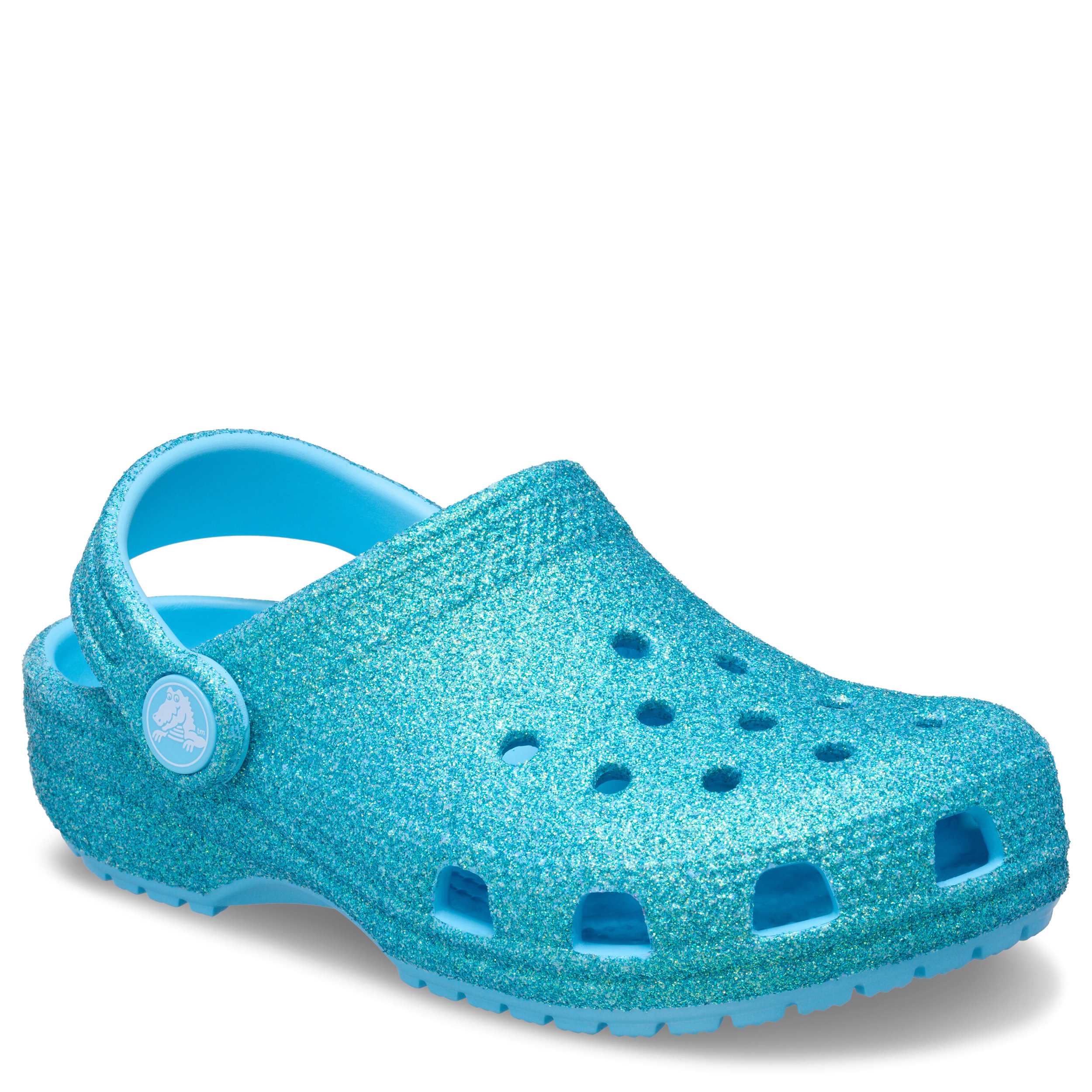 She can't go wrong with the Classic Glitter girls' clog by Crocs. The Iconic Crocs Comfort material offers lightweight, flexible cushioning and a gentle massaging sensation, while the well-ventilated upper circulates air for a cool, dry fit in these blue glitter Crocs.